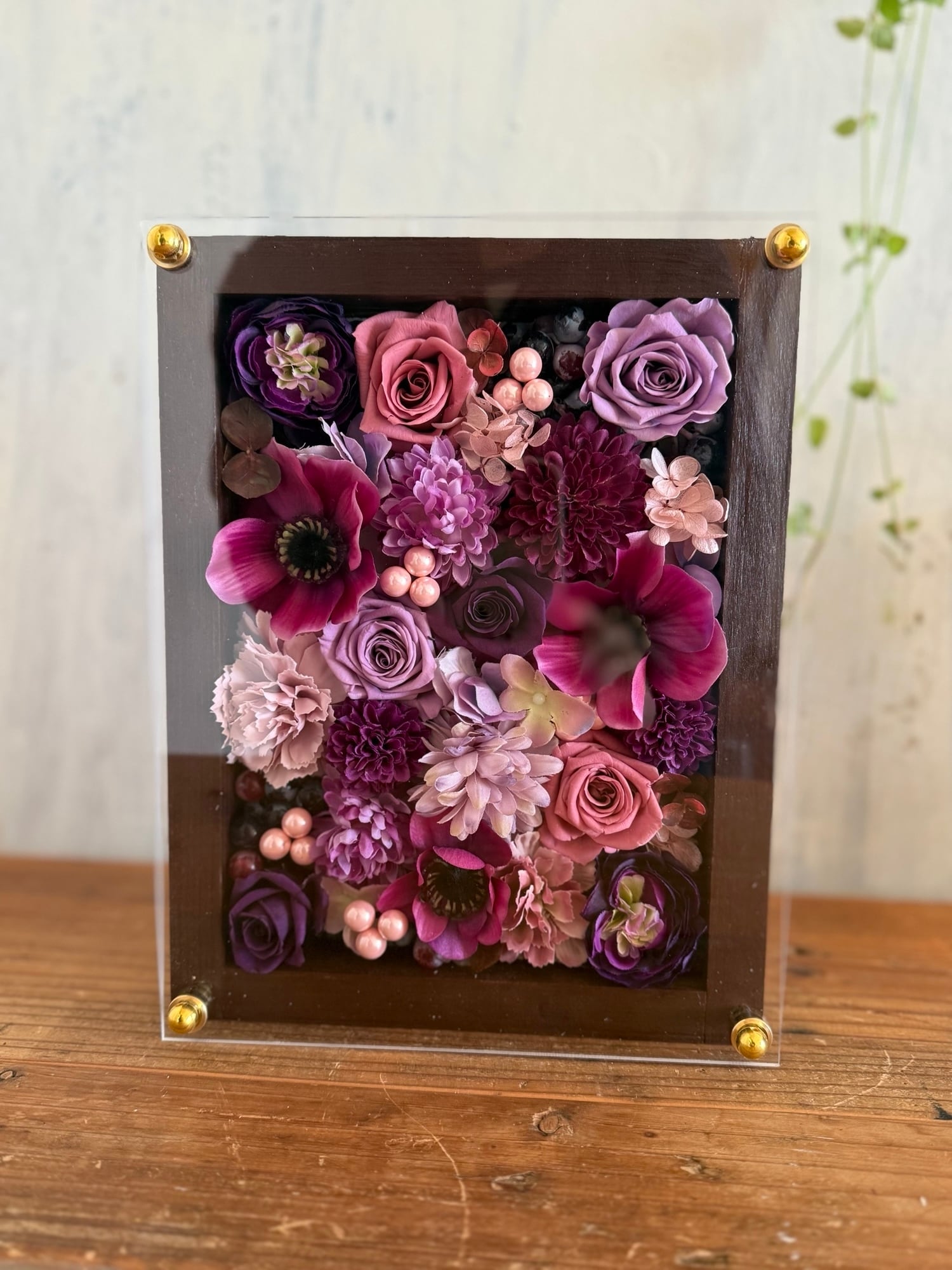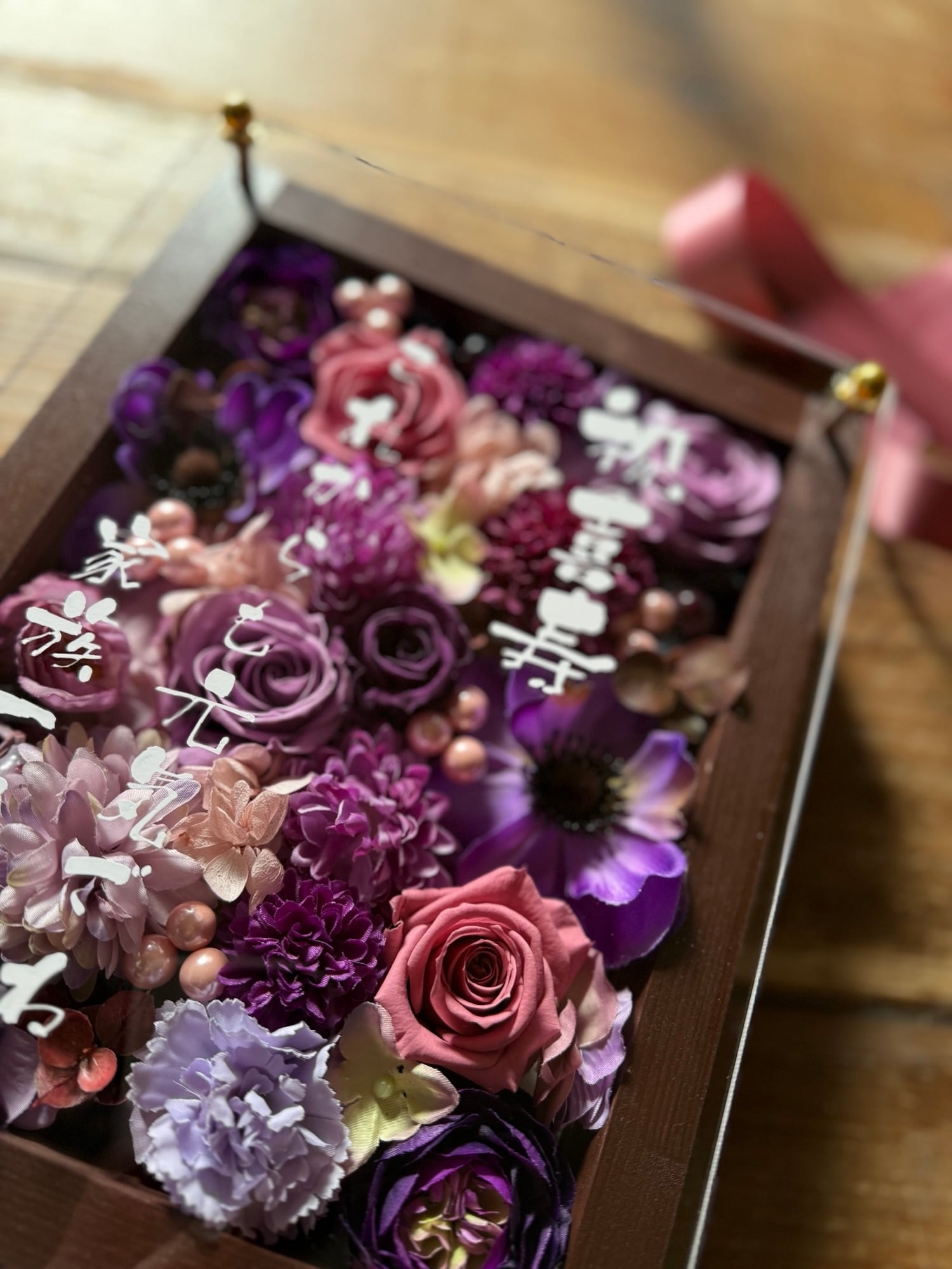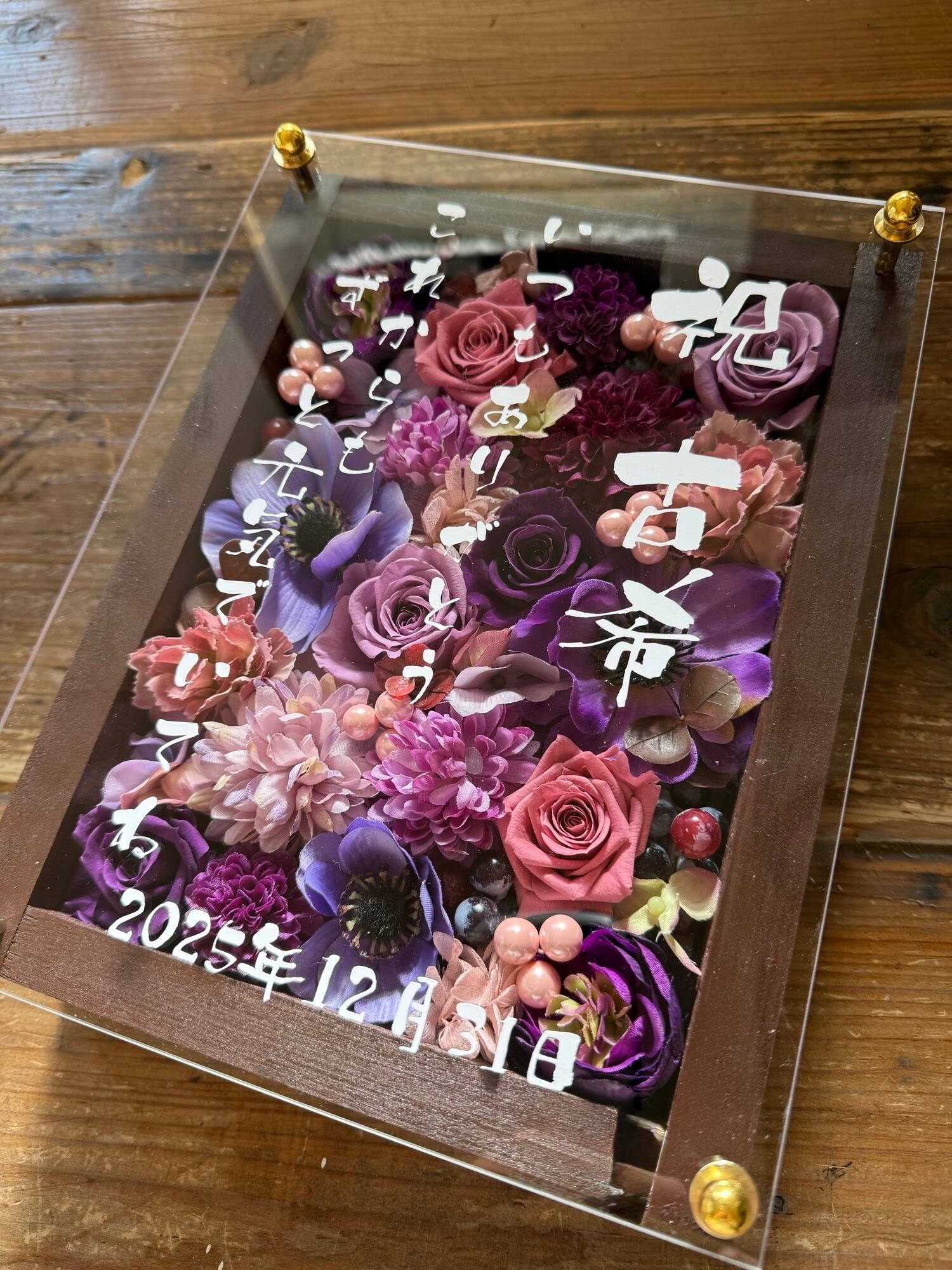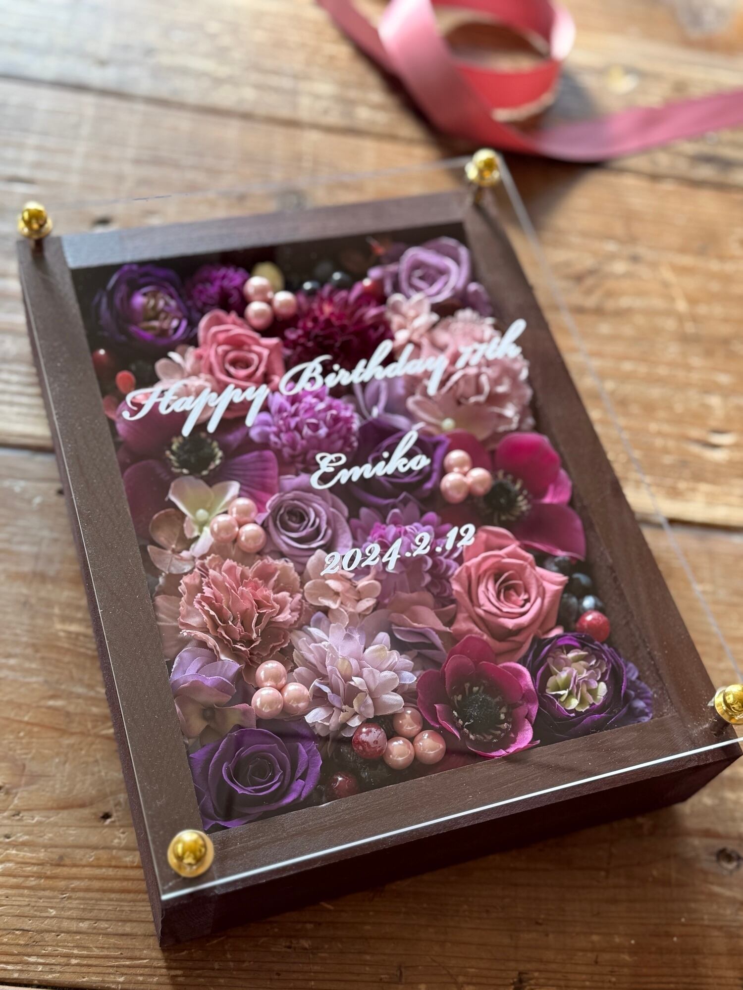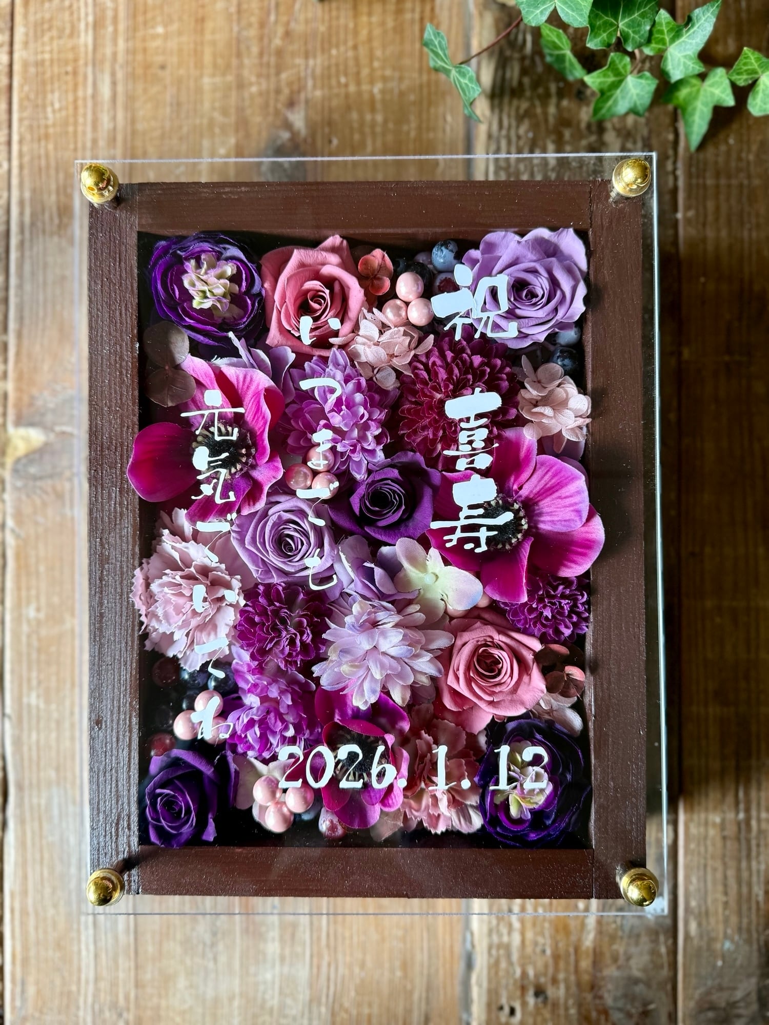茶色のウッドフレームにプリザーブドフラワーと造花をぎっしり詰め込み、アクリル板にはカッティングシートでメッセージをお入れします。