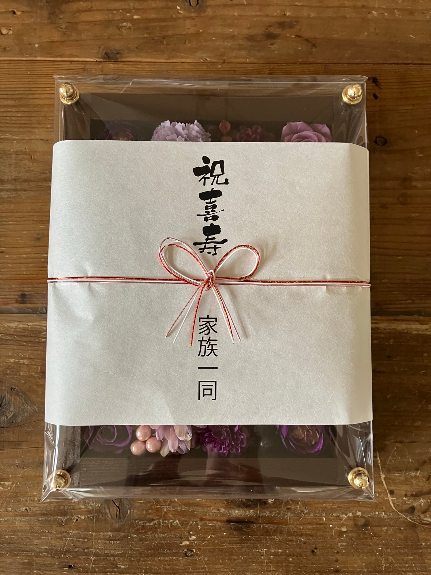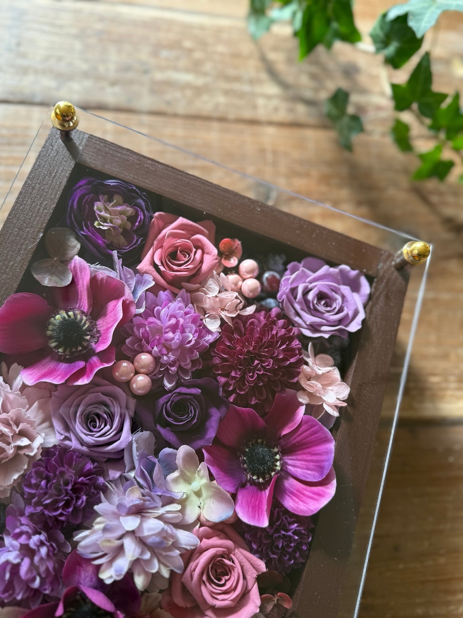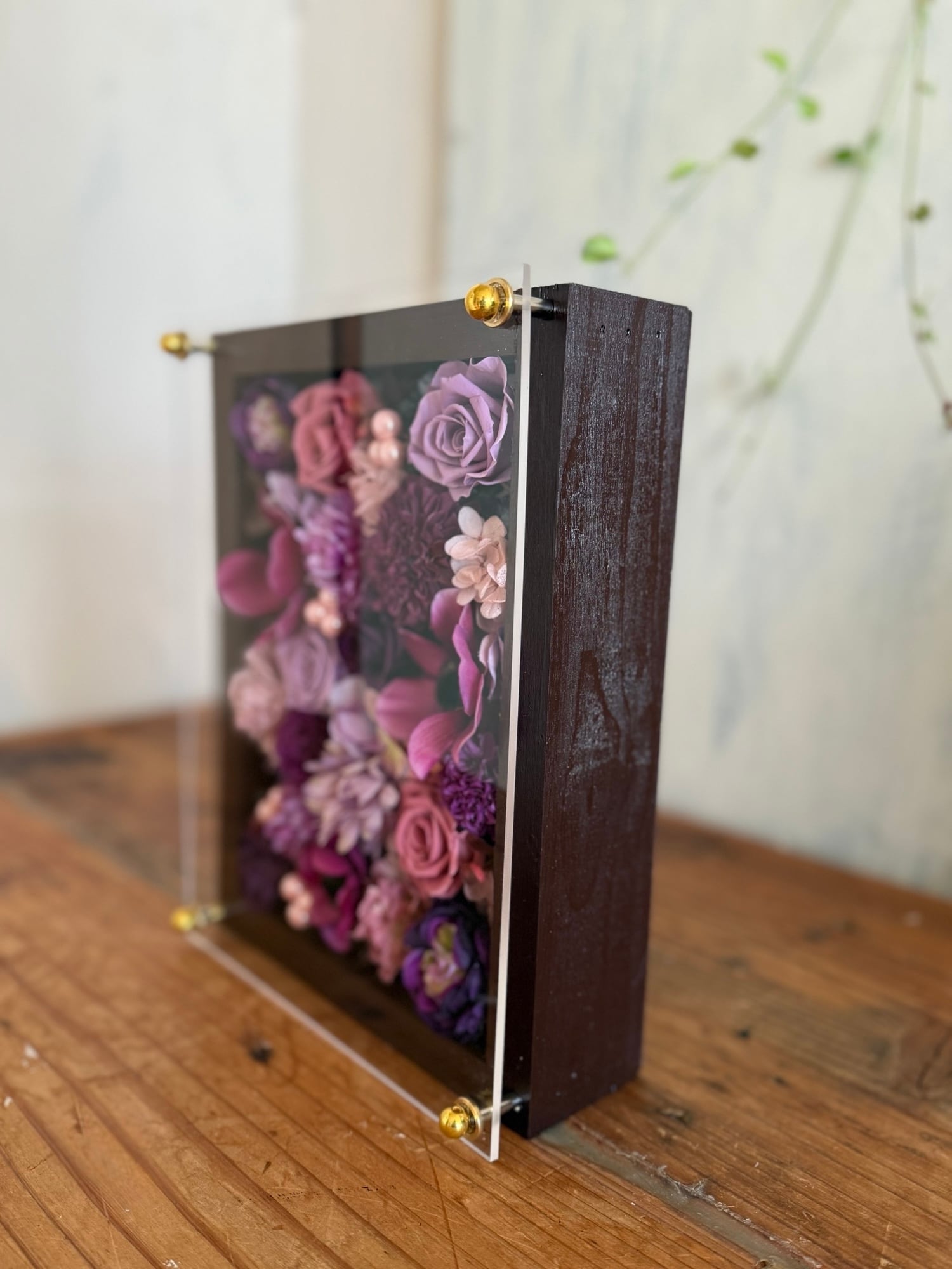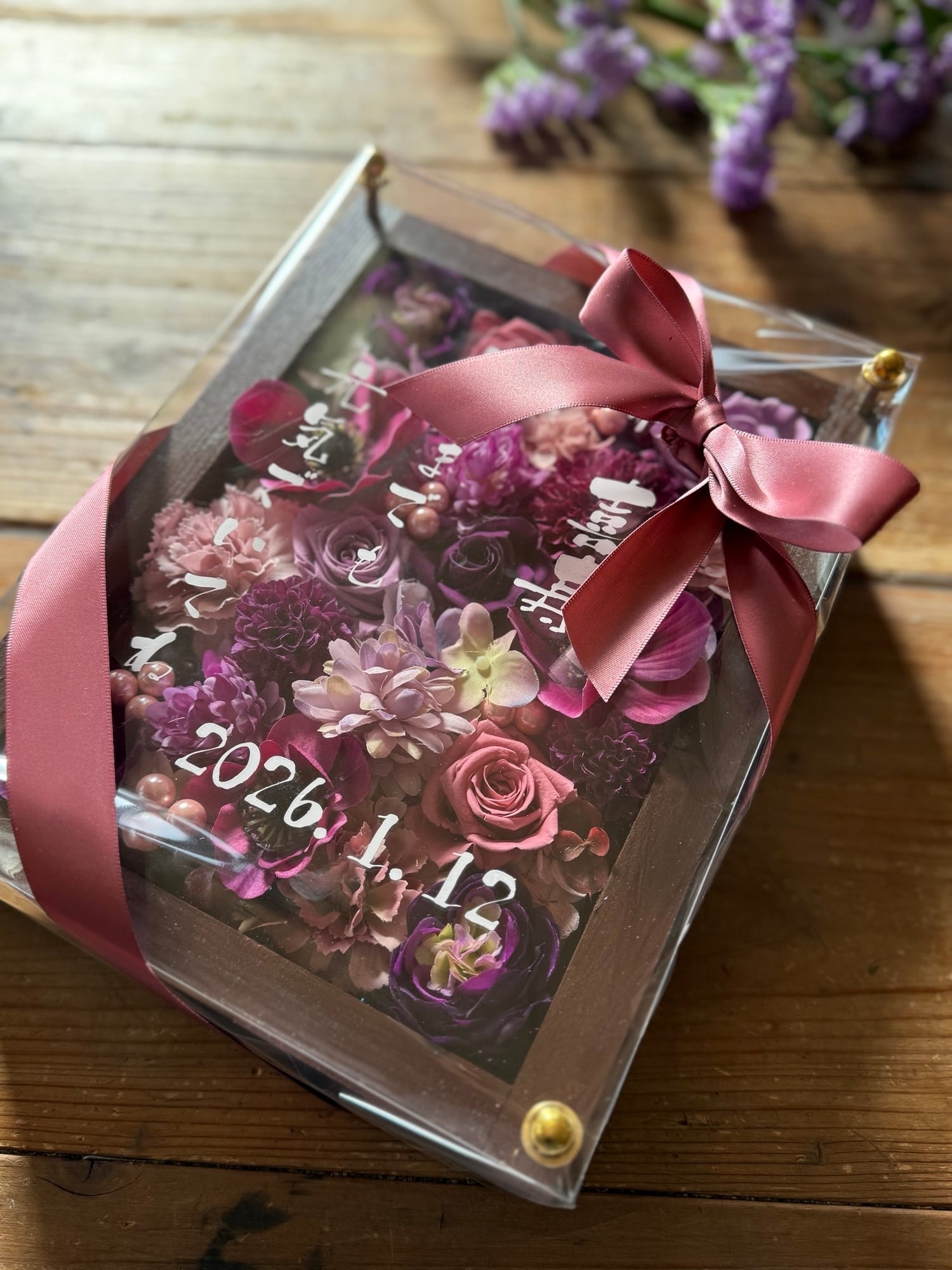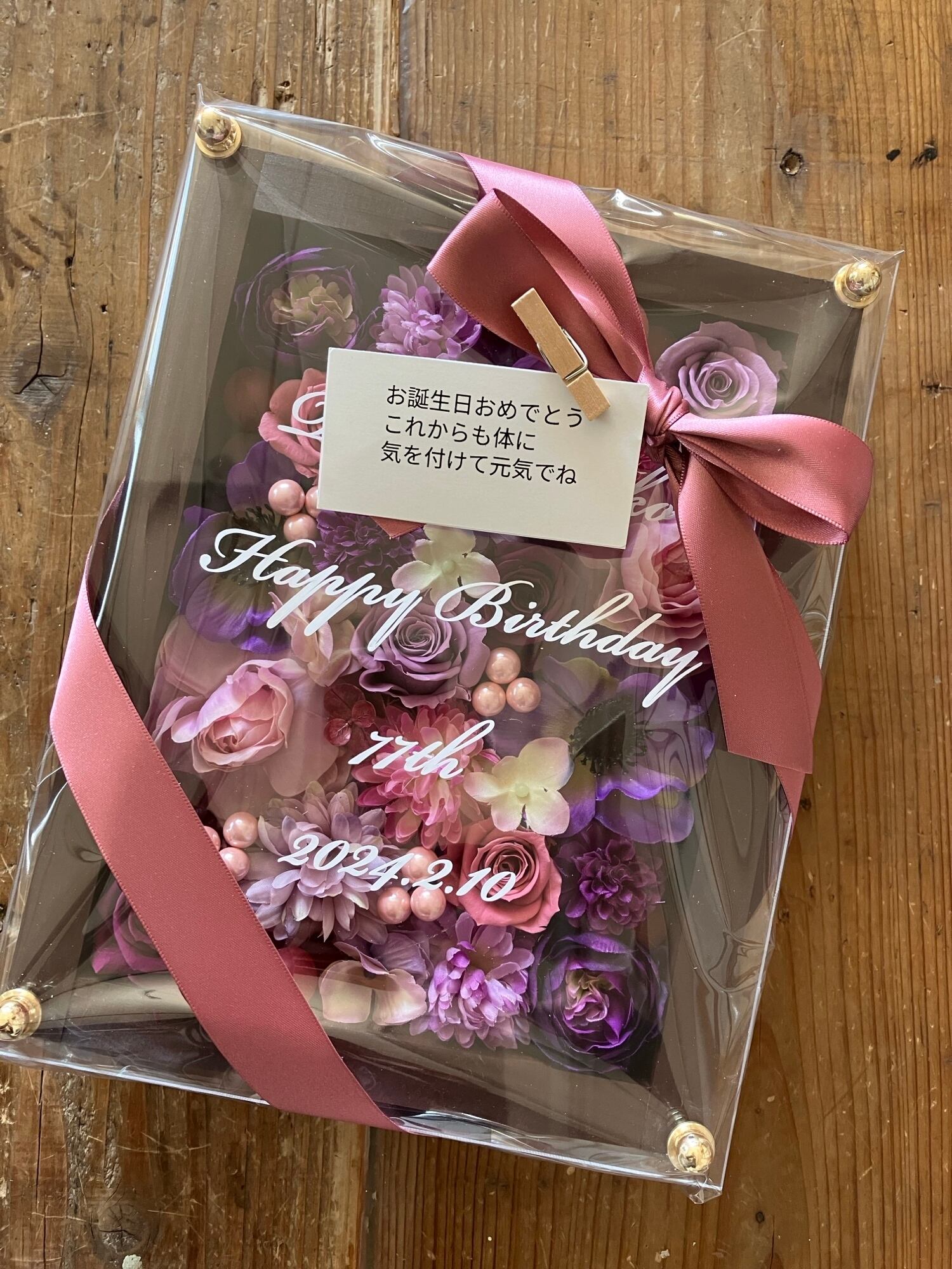 茶色のウッドフレームにプリザーブドフラワーと造花をぎっしり詰め込み、アクリル板にはカッティングシートでメッセージをお入れします。
