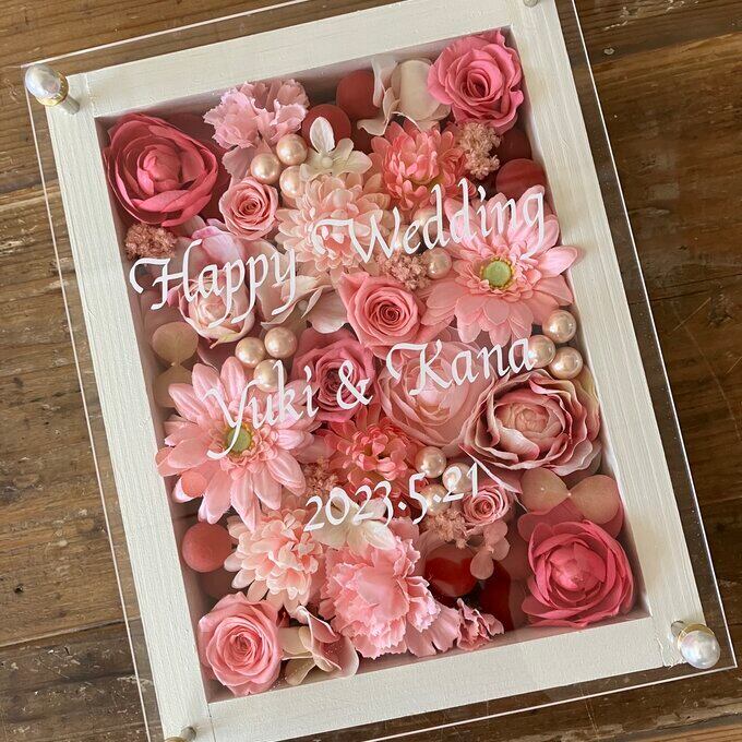 ピンクの木枠に文字入れされたプリザーブドフラワーアレンジです。