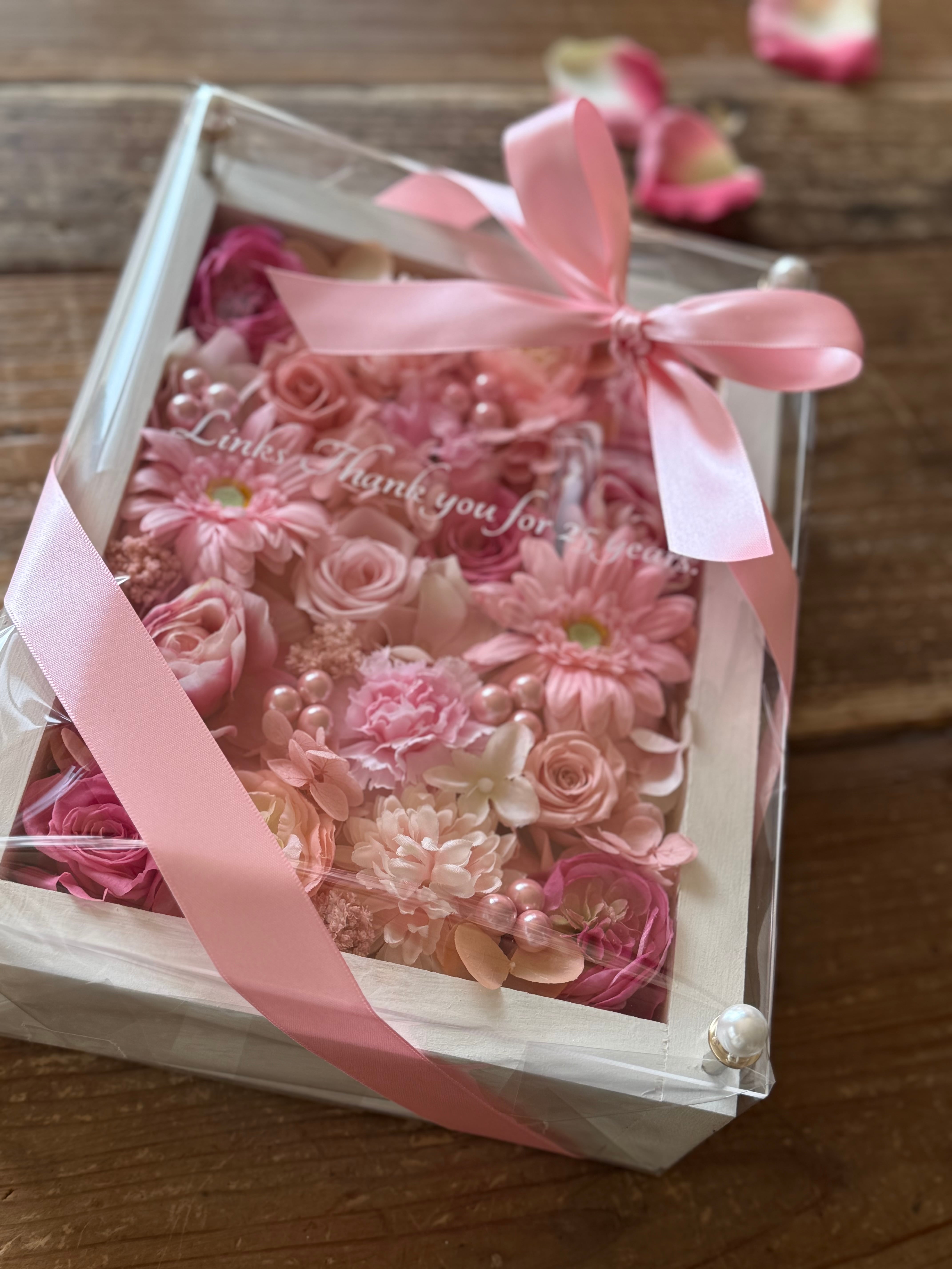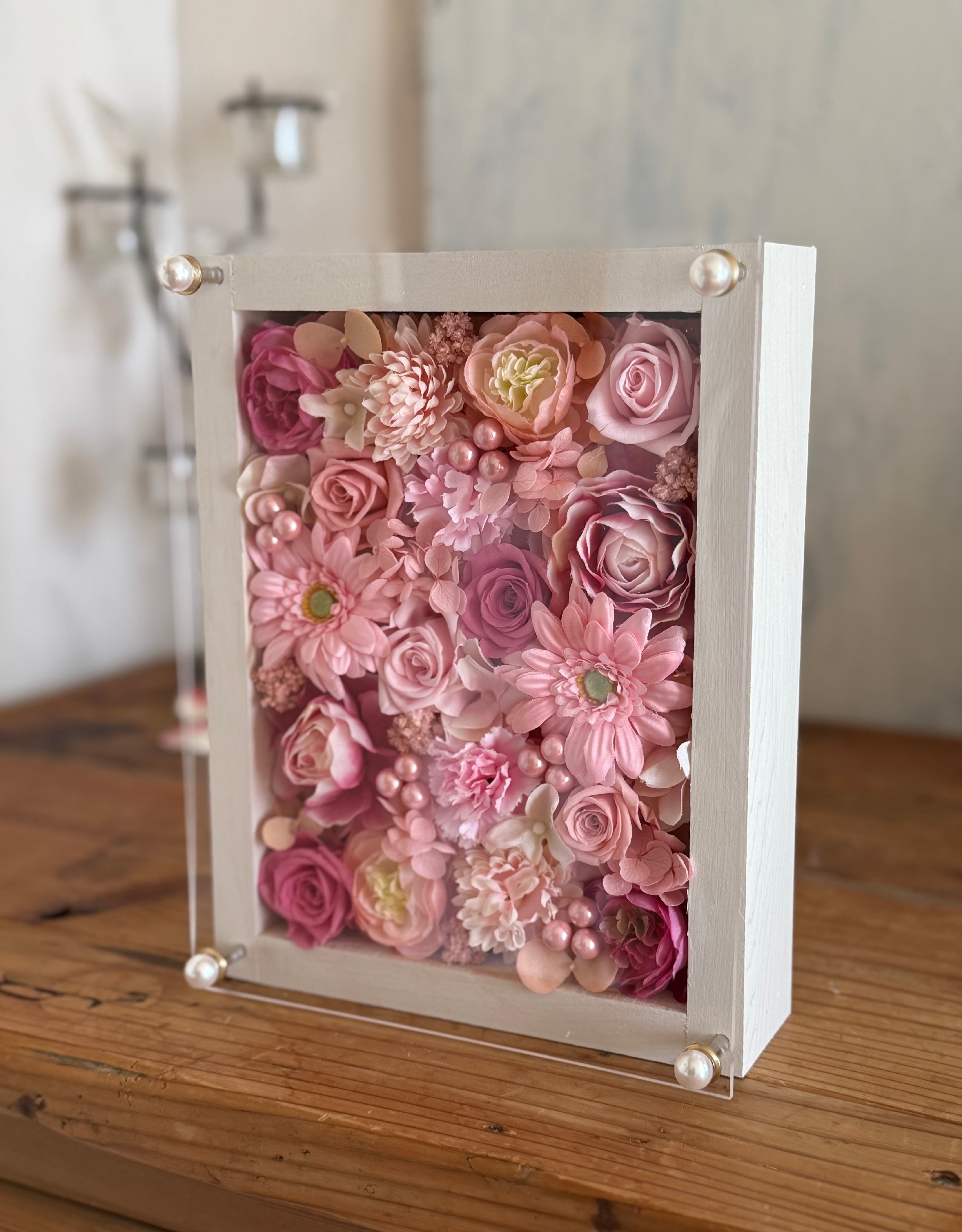 白色のウッドフレームにプリザーブドフラワーと造花をぎっしり詰め込み、アクリル板にはカッティングシートでメッセージをお入れします。