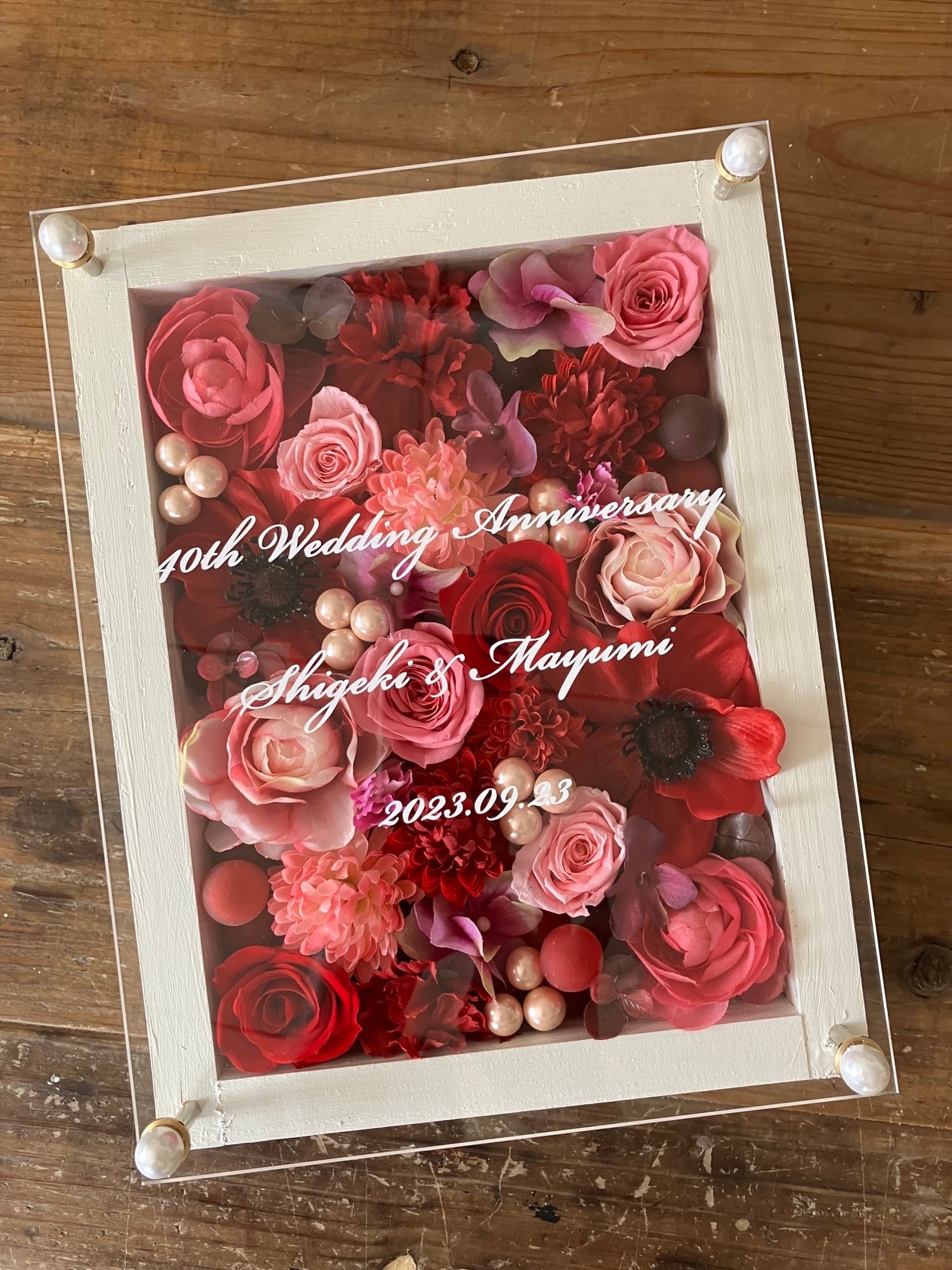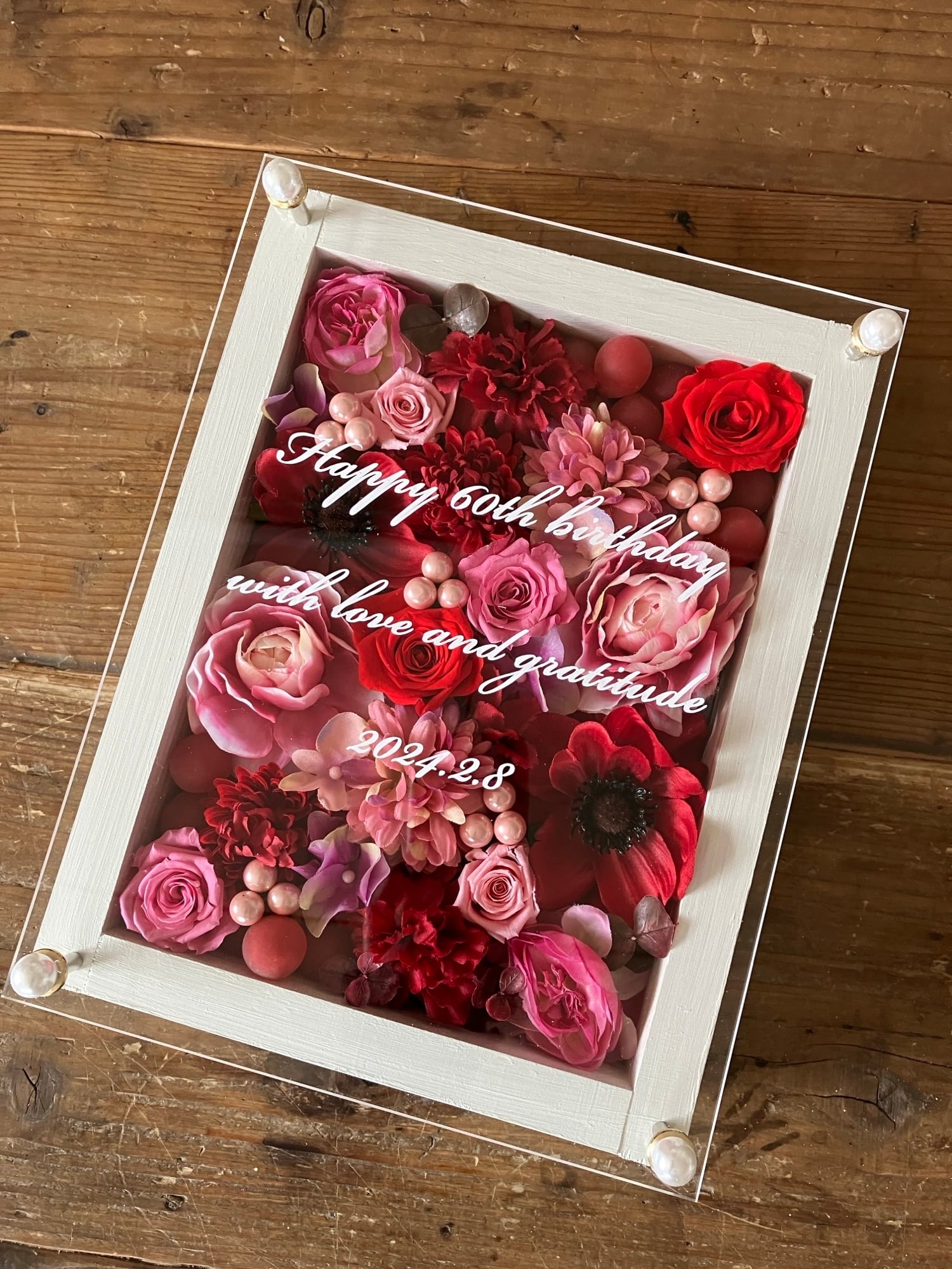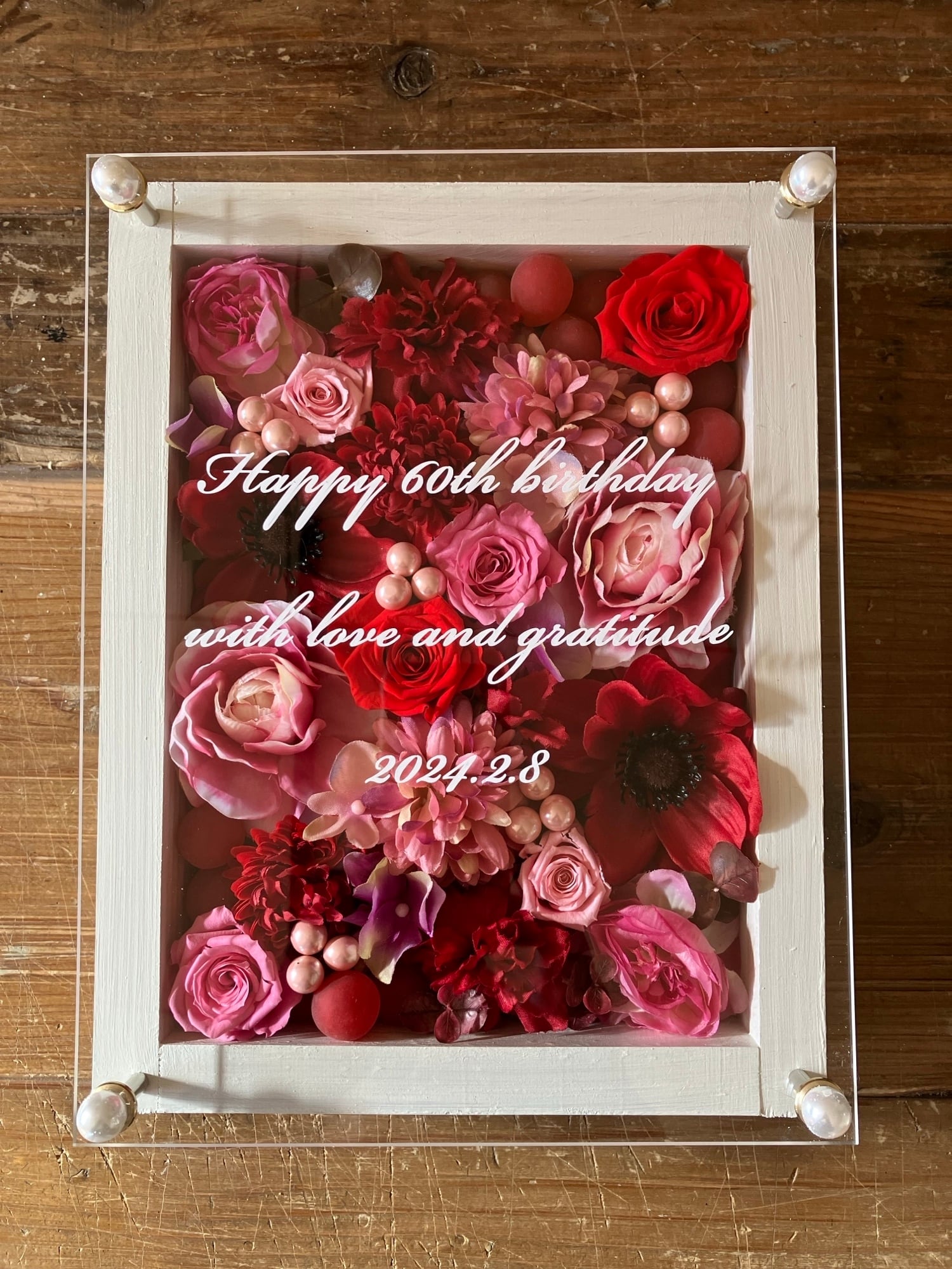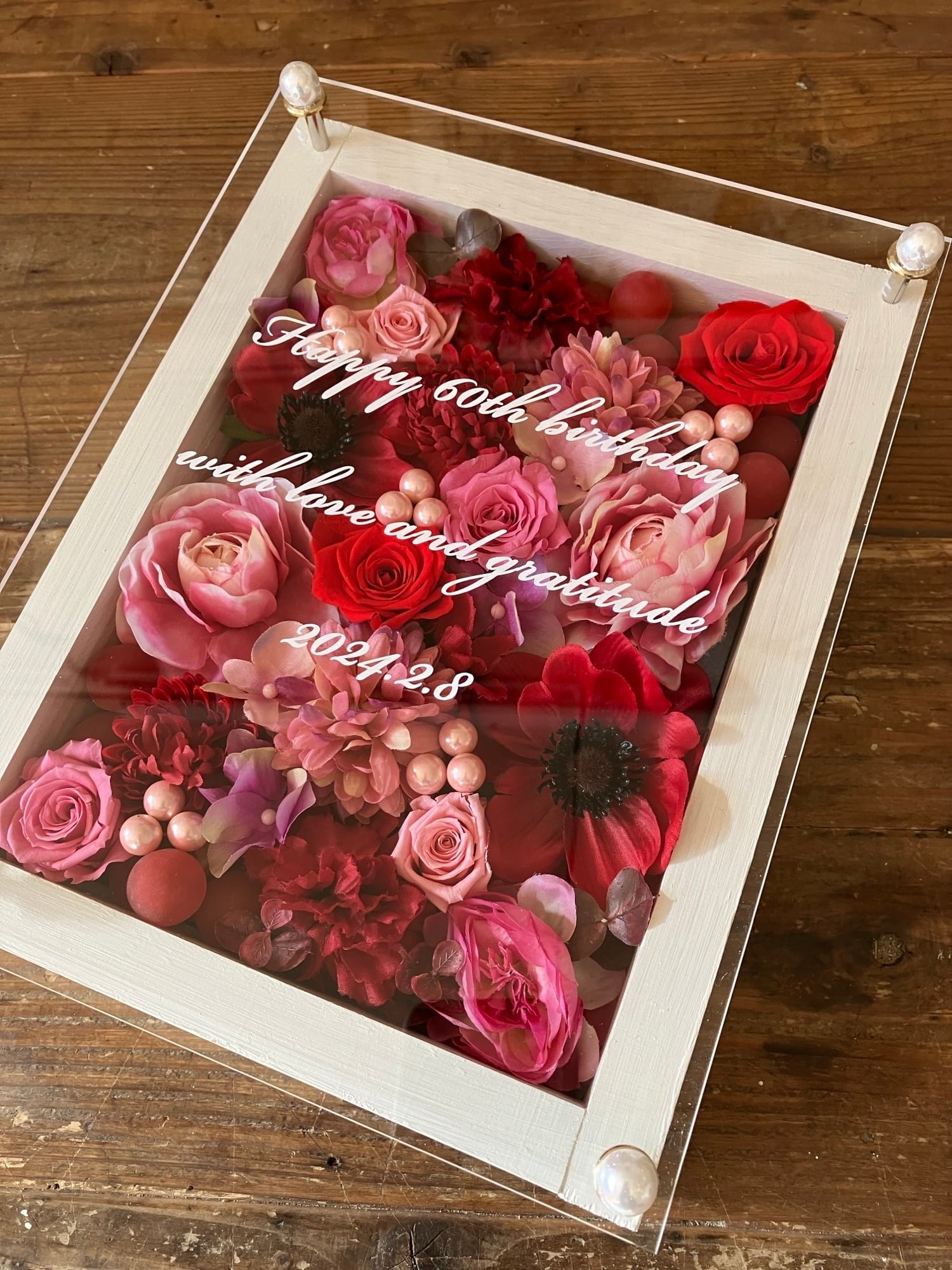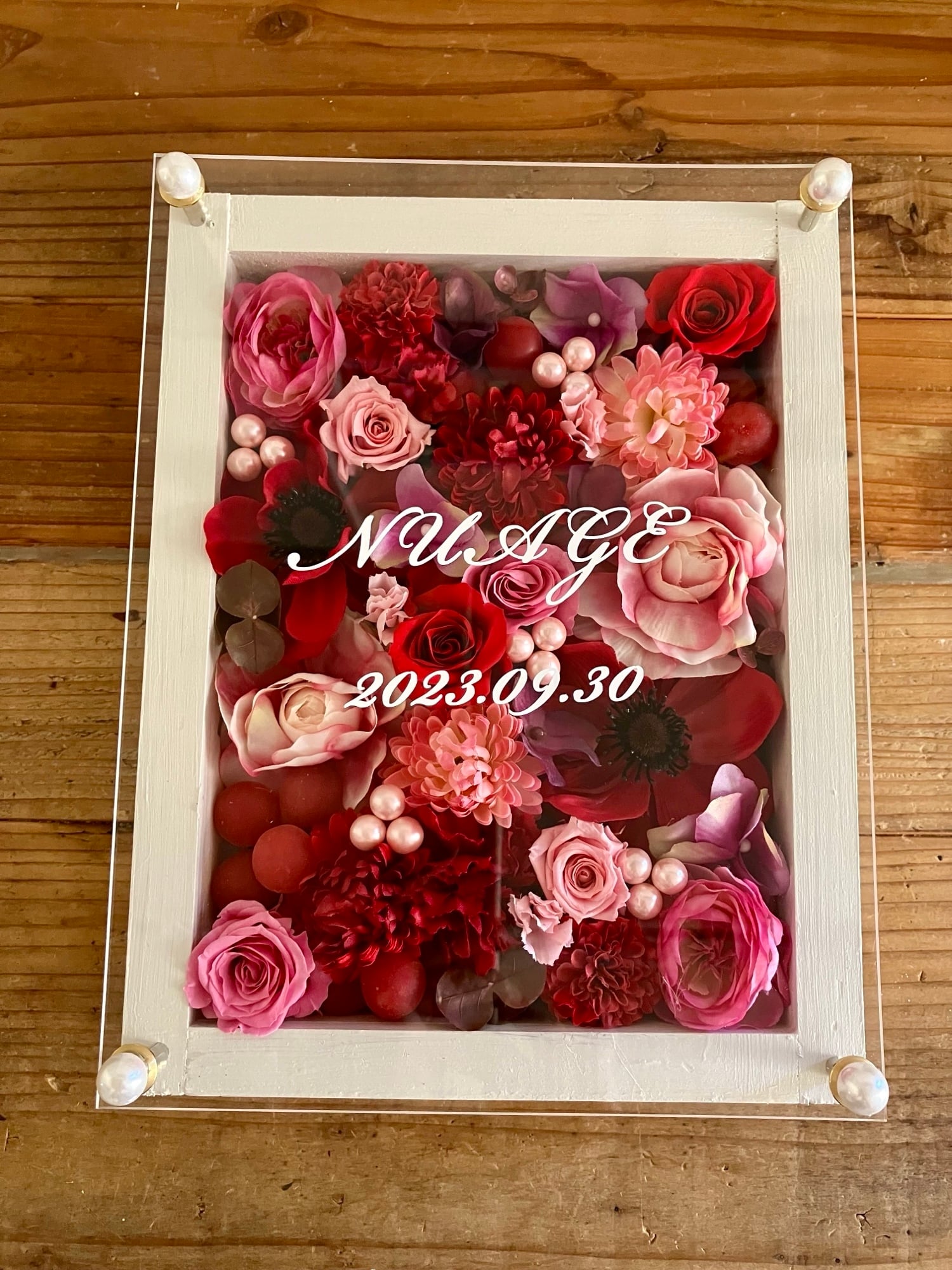 白色のウッドフレームにプリザーブドフラワーと造花をぎっしり詰め込み、アクリル板にはカッティングシートでメッセージをお入れします。