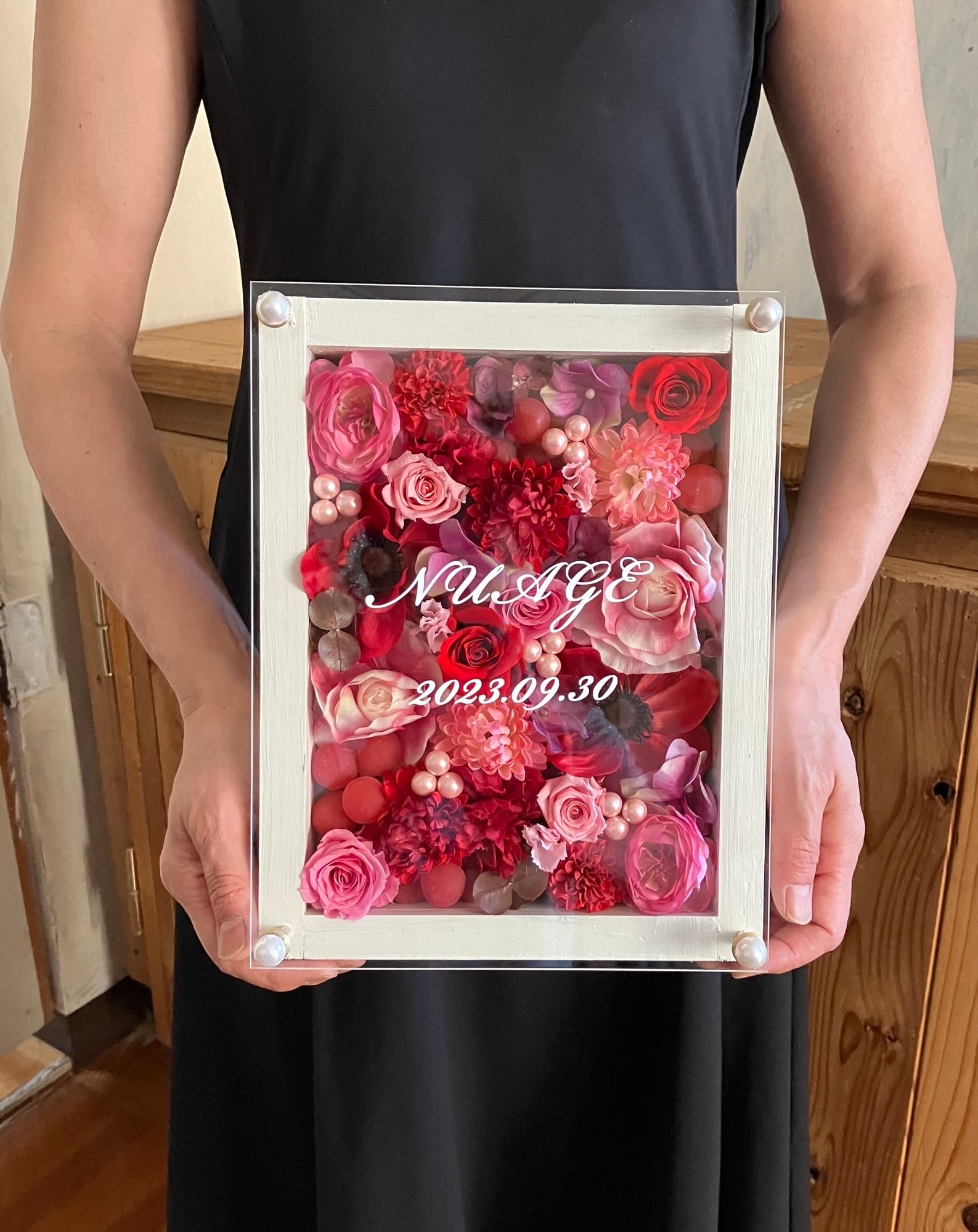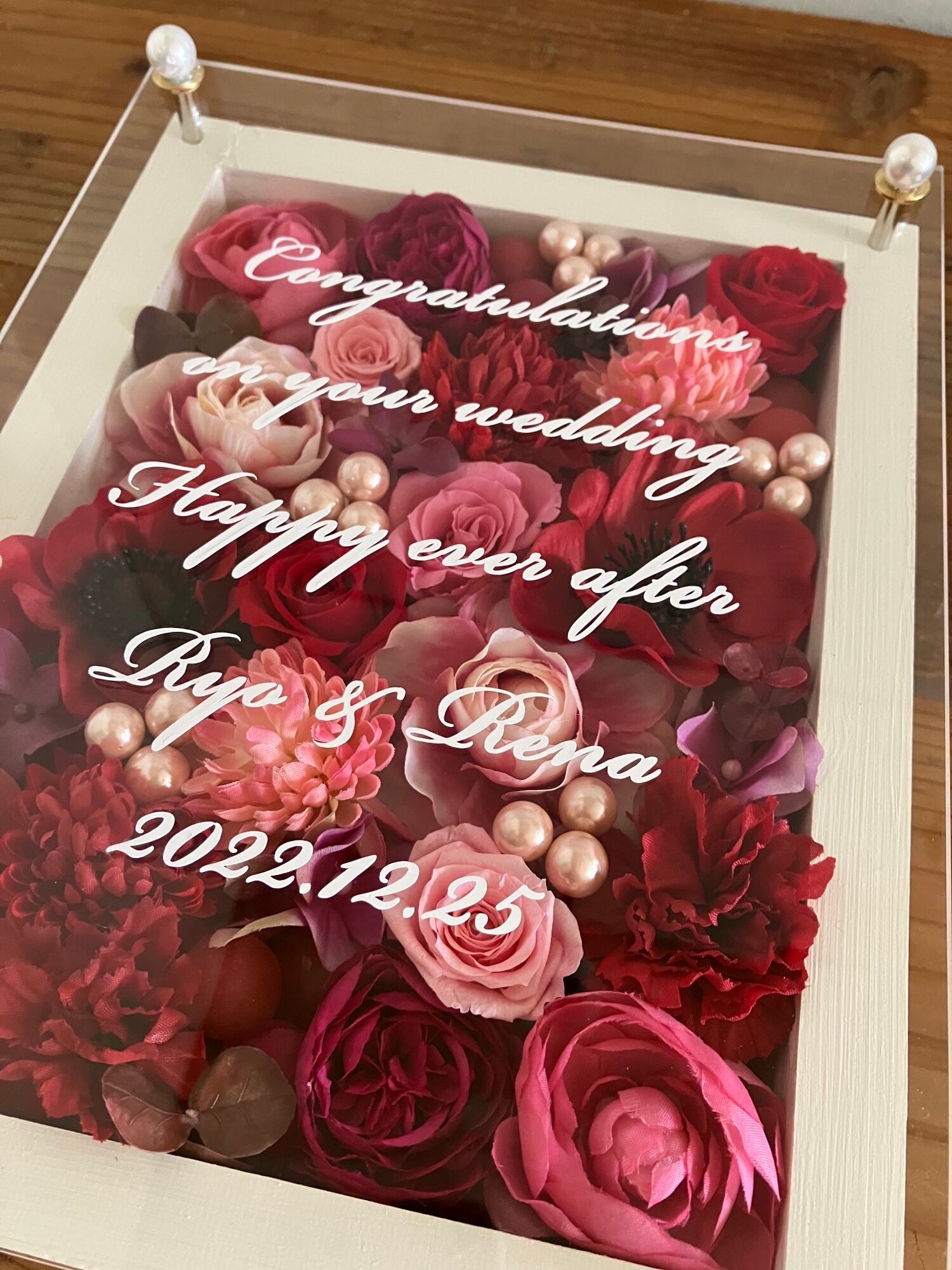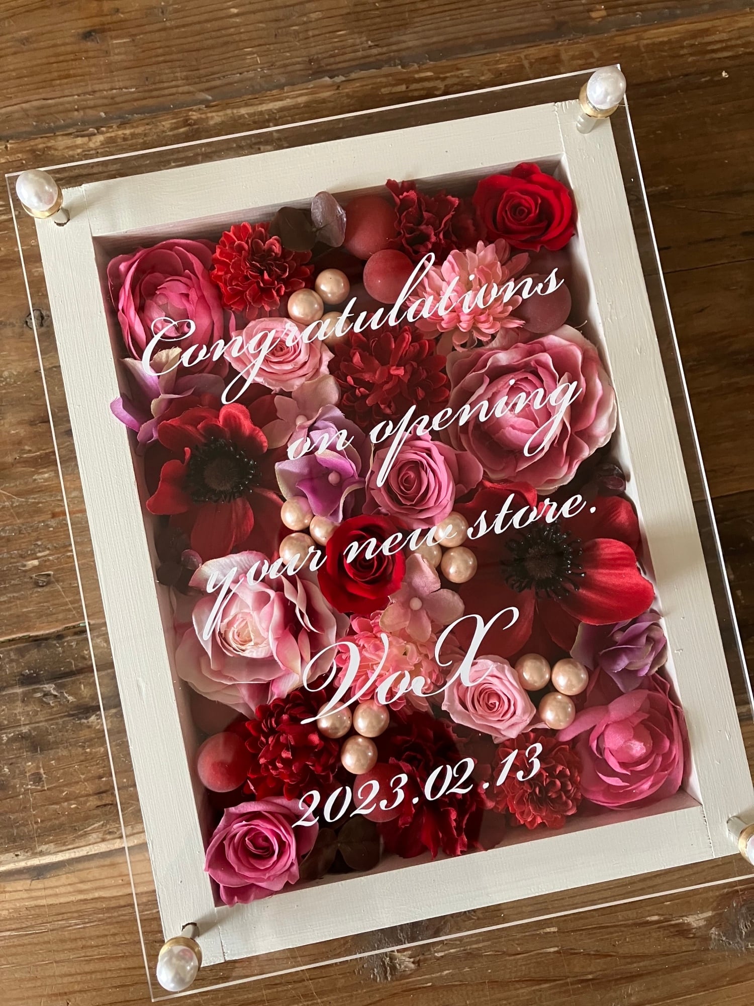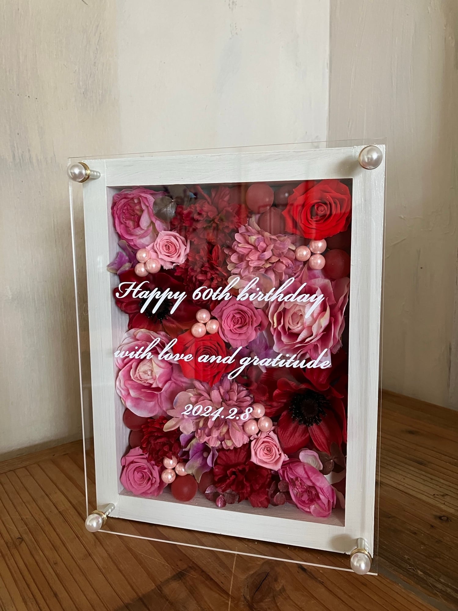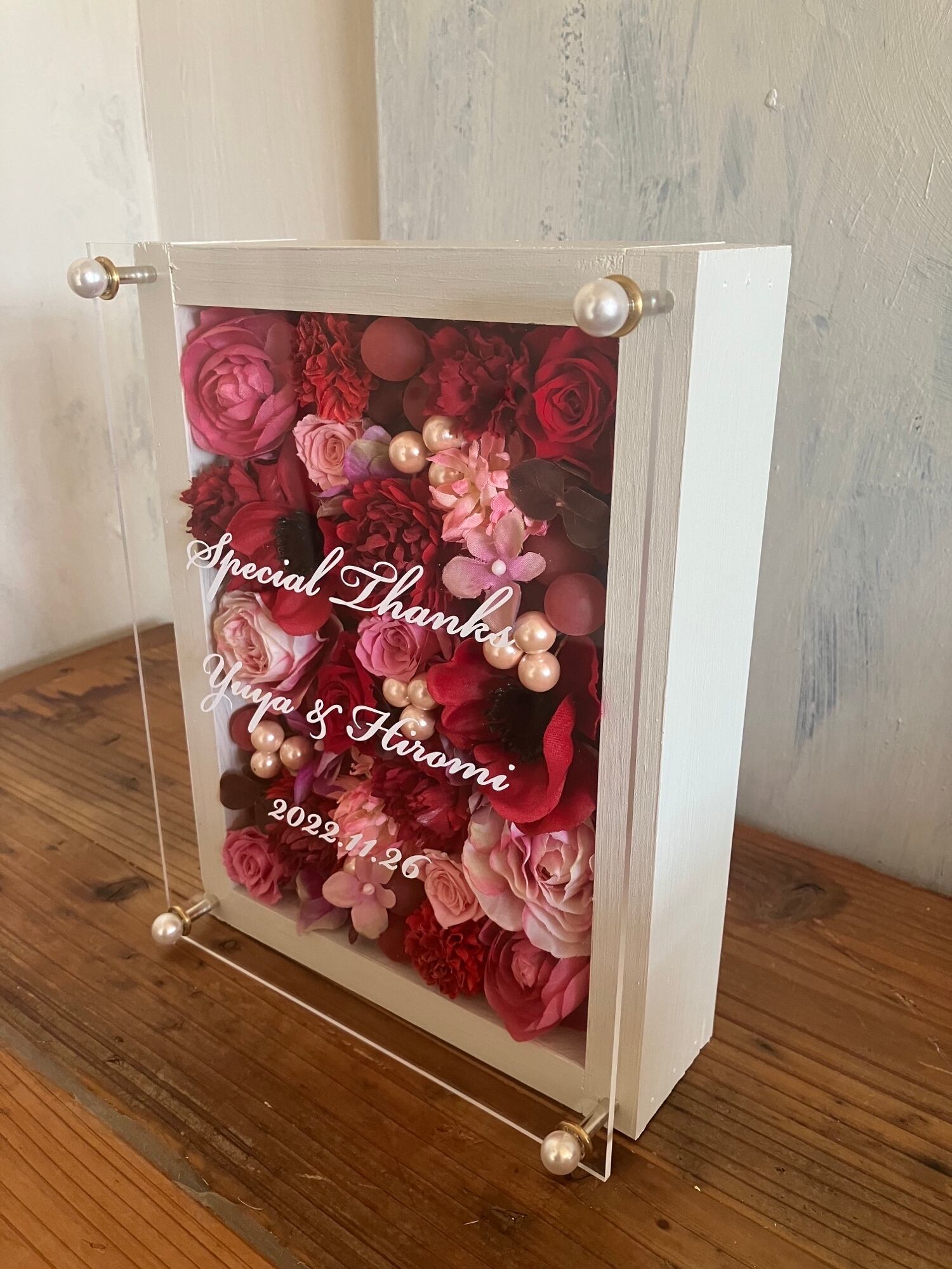 白色のウッドフレームにプリザーブドフラワーと造花をぎっしり詰め込み、アクリル板にはカッティングシートでメッセージをお入れします。