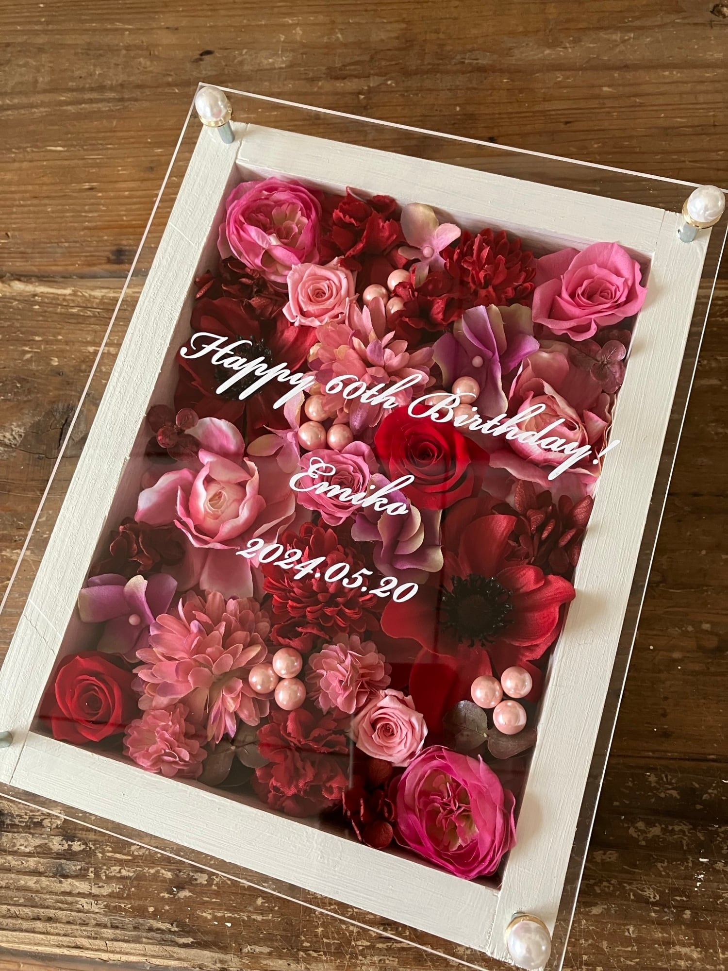 還暦祝い・結婚祝い・結婚記念日祝い・母の日ギフト【名入れ】プリザーブドフラワーアレンジ ウッドフレーム 白木枠〈赤ピンク〉