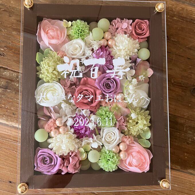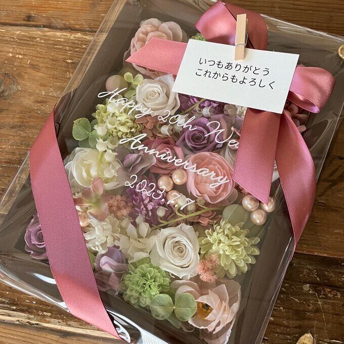 木枠にピンク、パープル、白、グリーンのプリザーブドフラワーアレンジメント。
