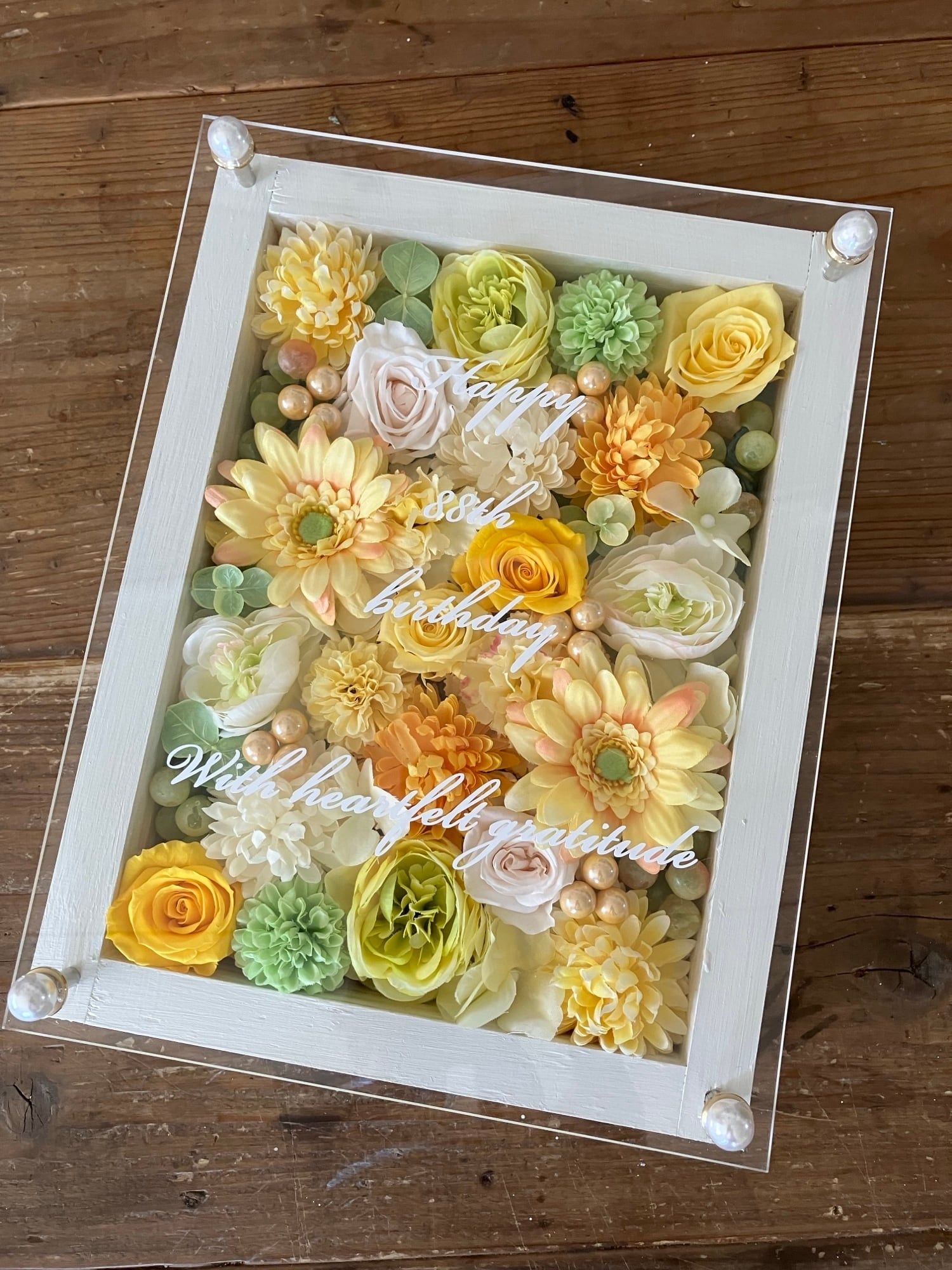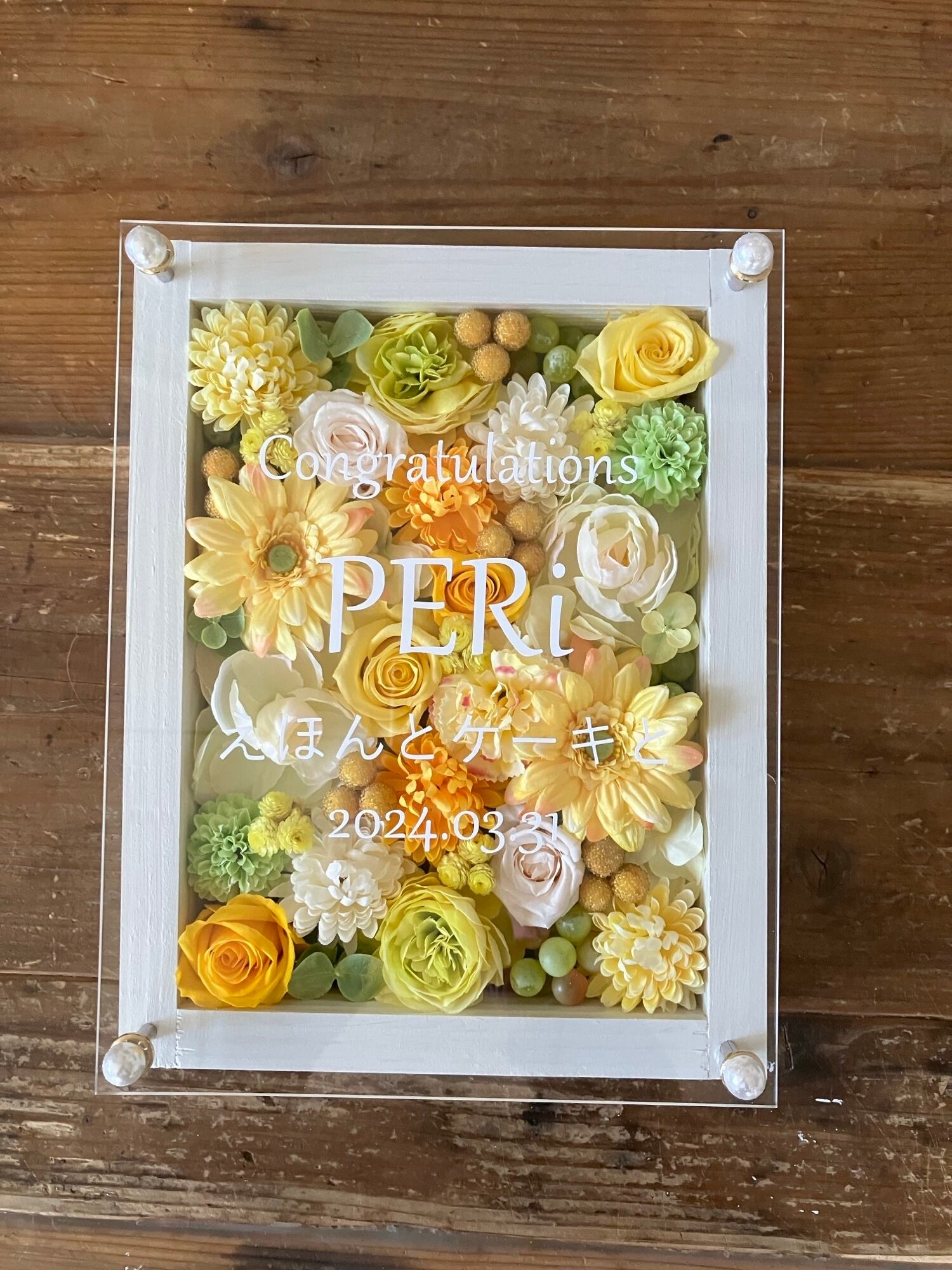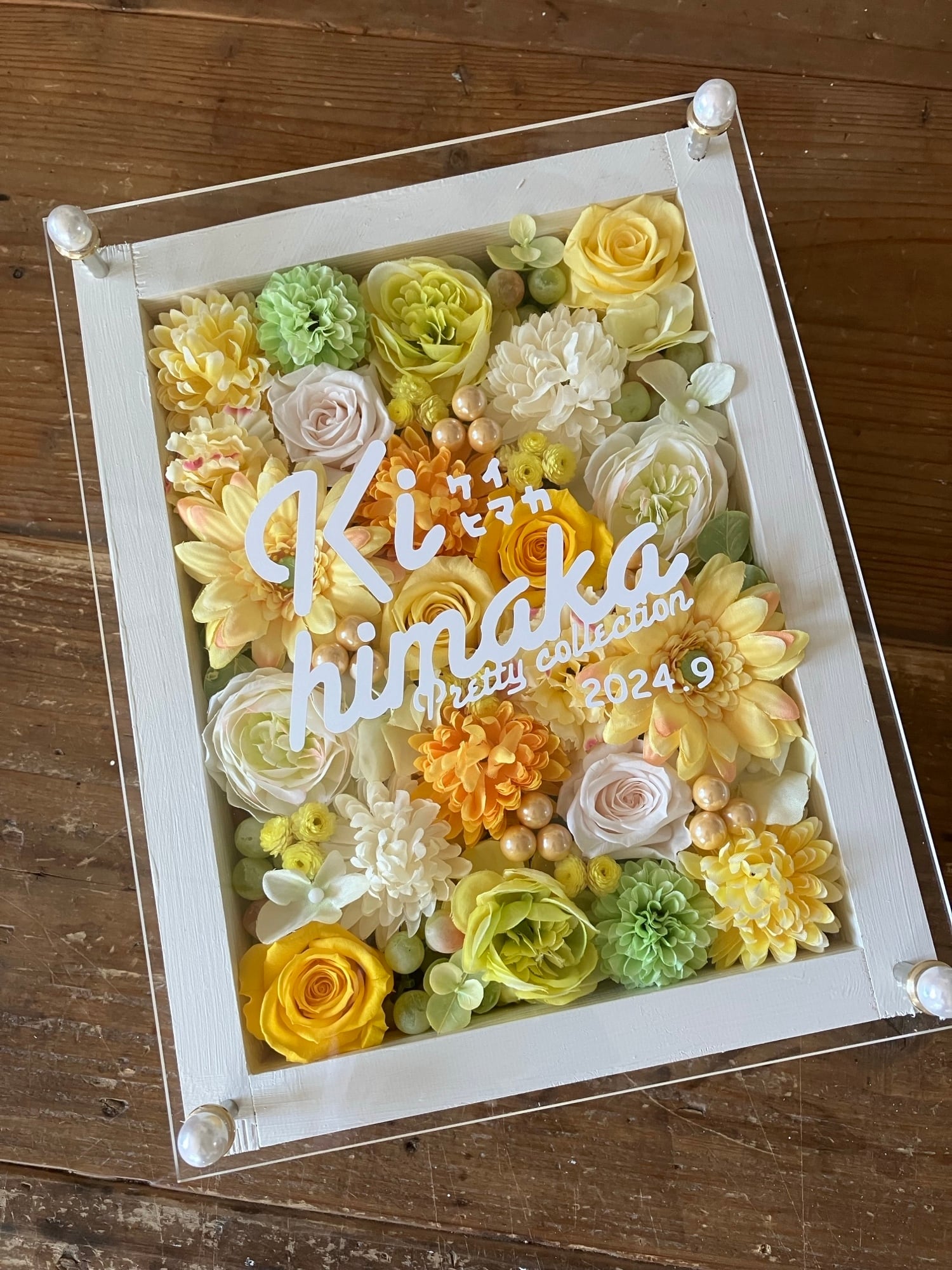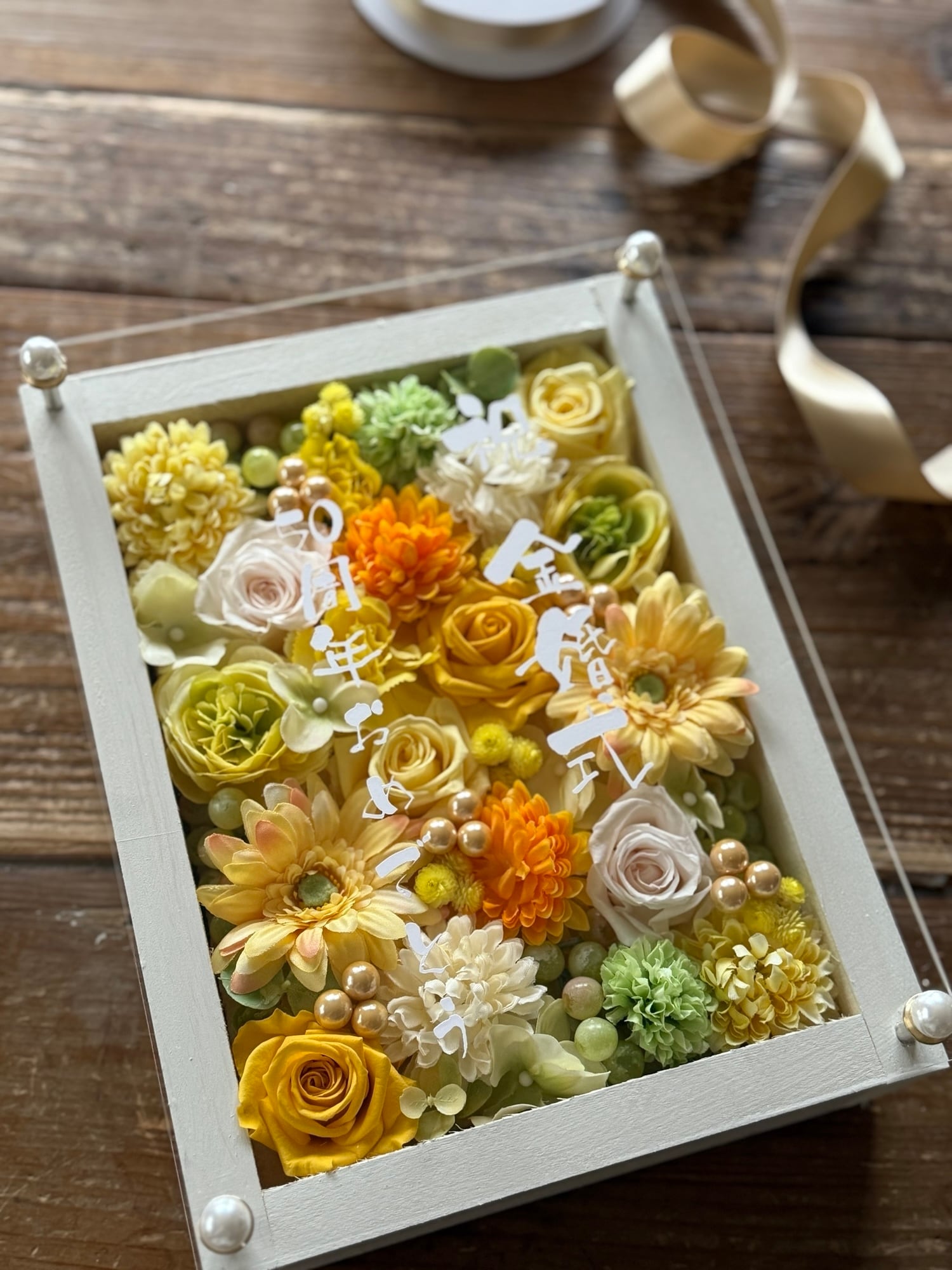 白色のウッドフレームにプリザーブドフラワーと造花をぎっしり詰め込み、アクリル板にはカッティングシートでメッセージをお入れします。