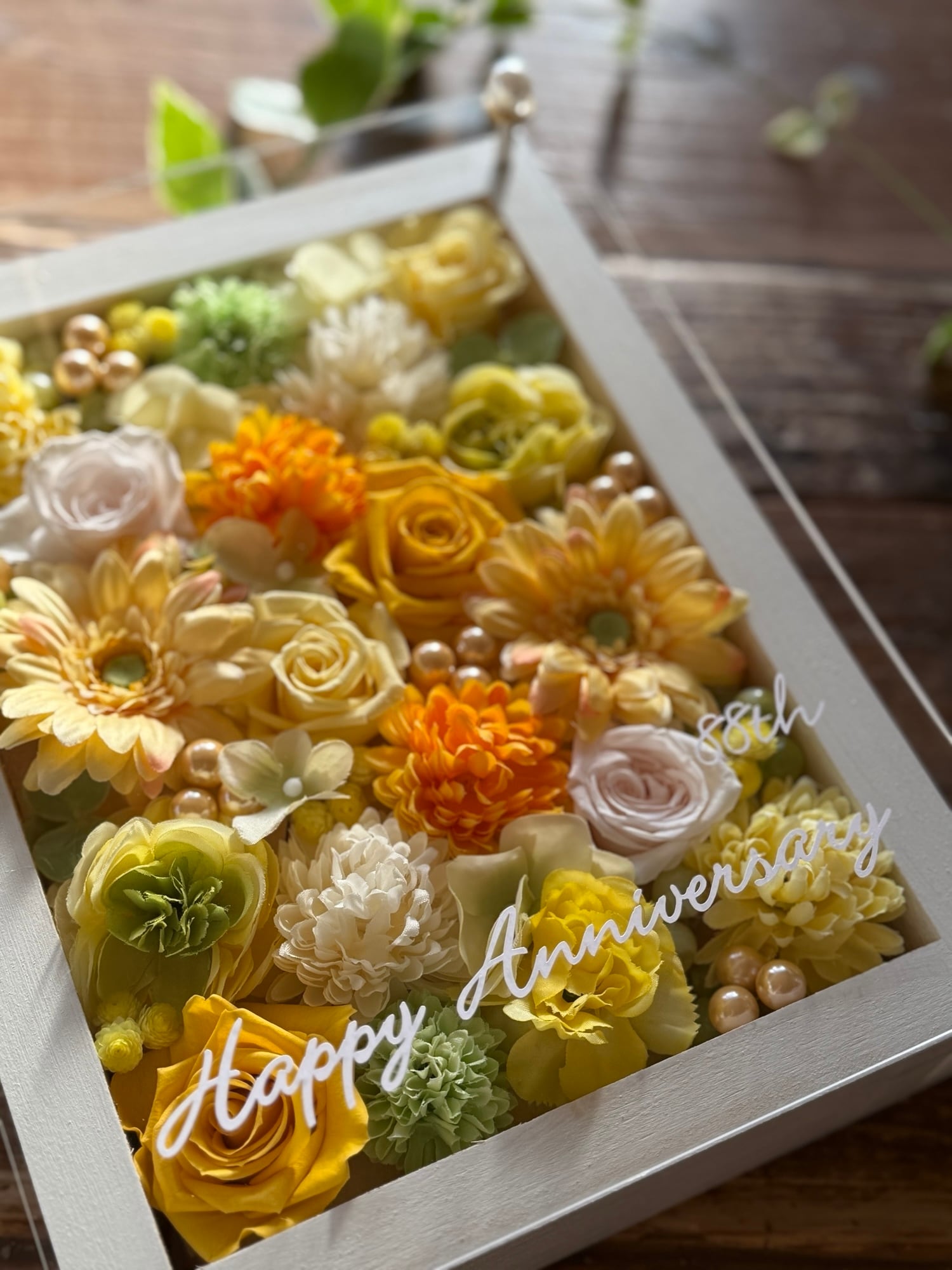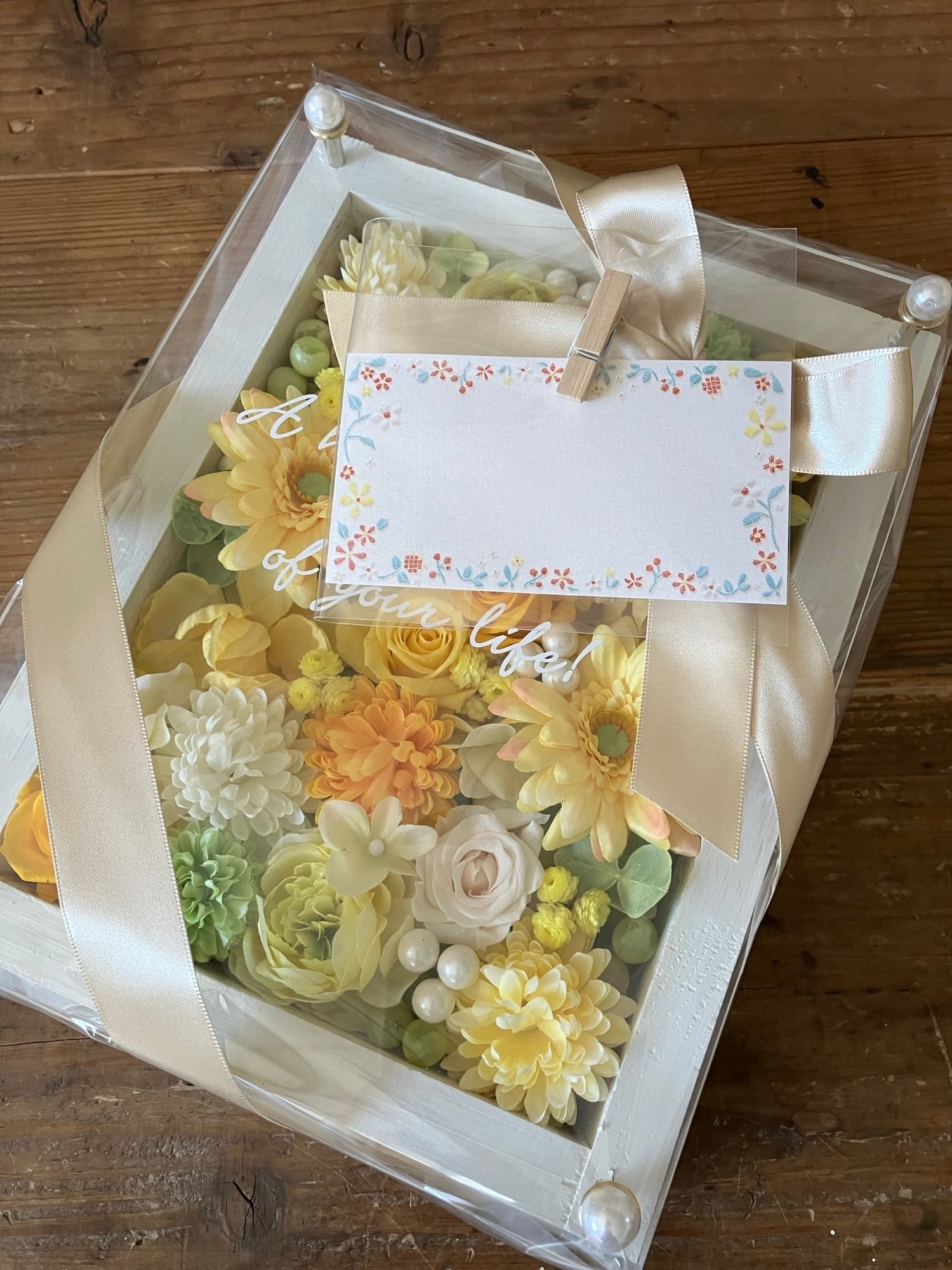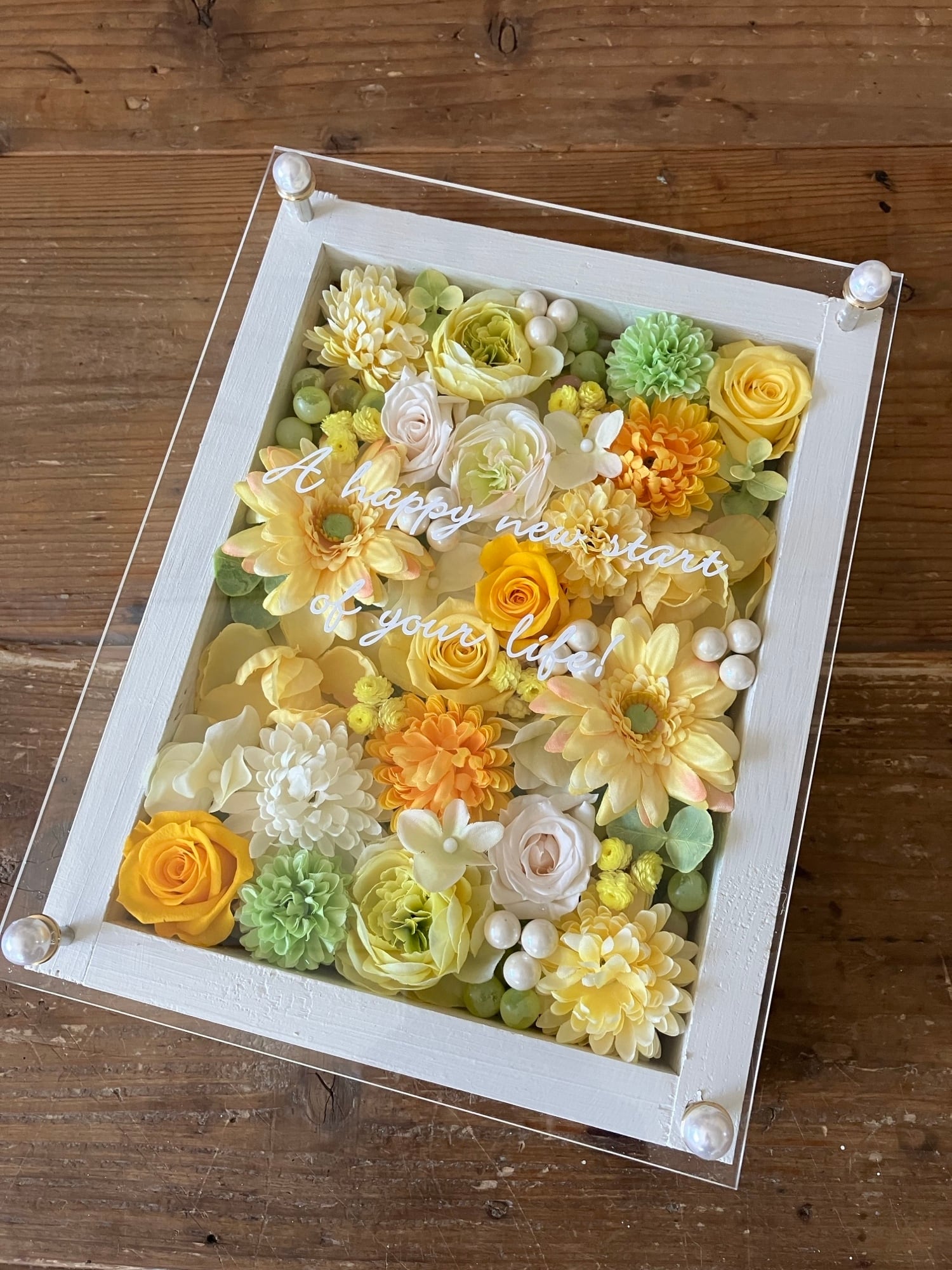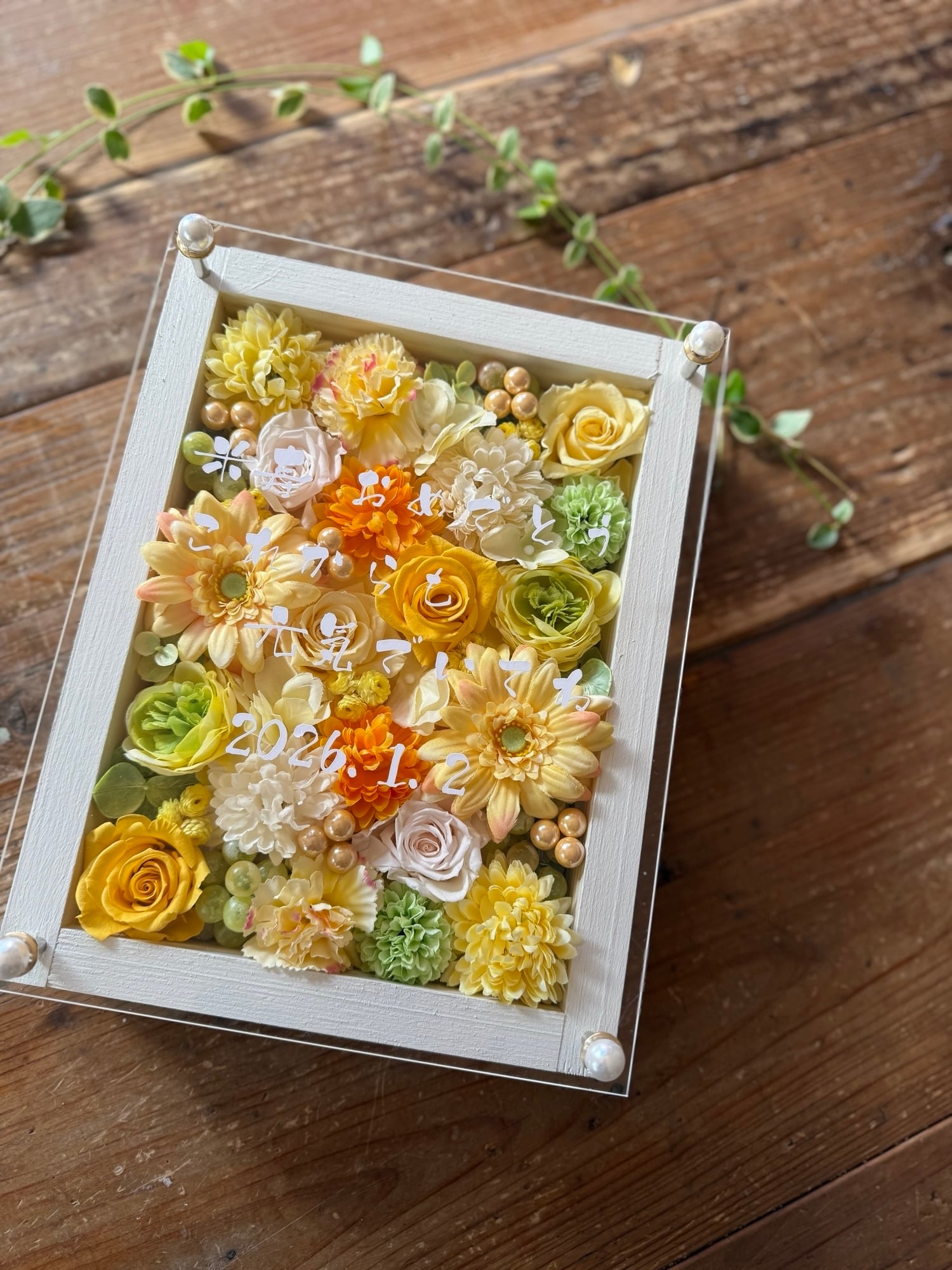 白色のウッドフレームにプリザーブドフラワーと造花をぎっしり詰め込み、アクリル板にはカッティングシートでメッセージをお入れします。