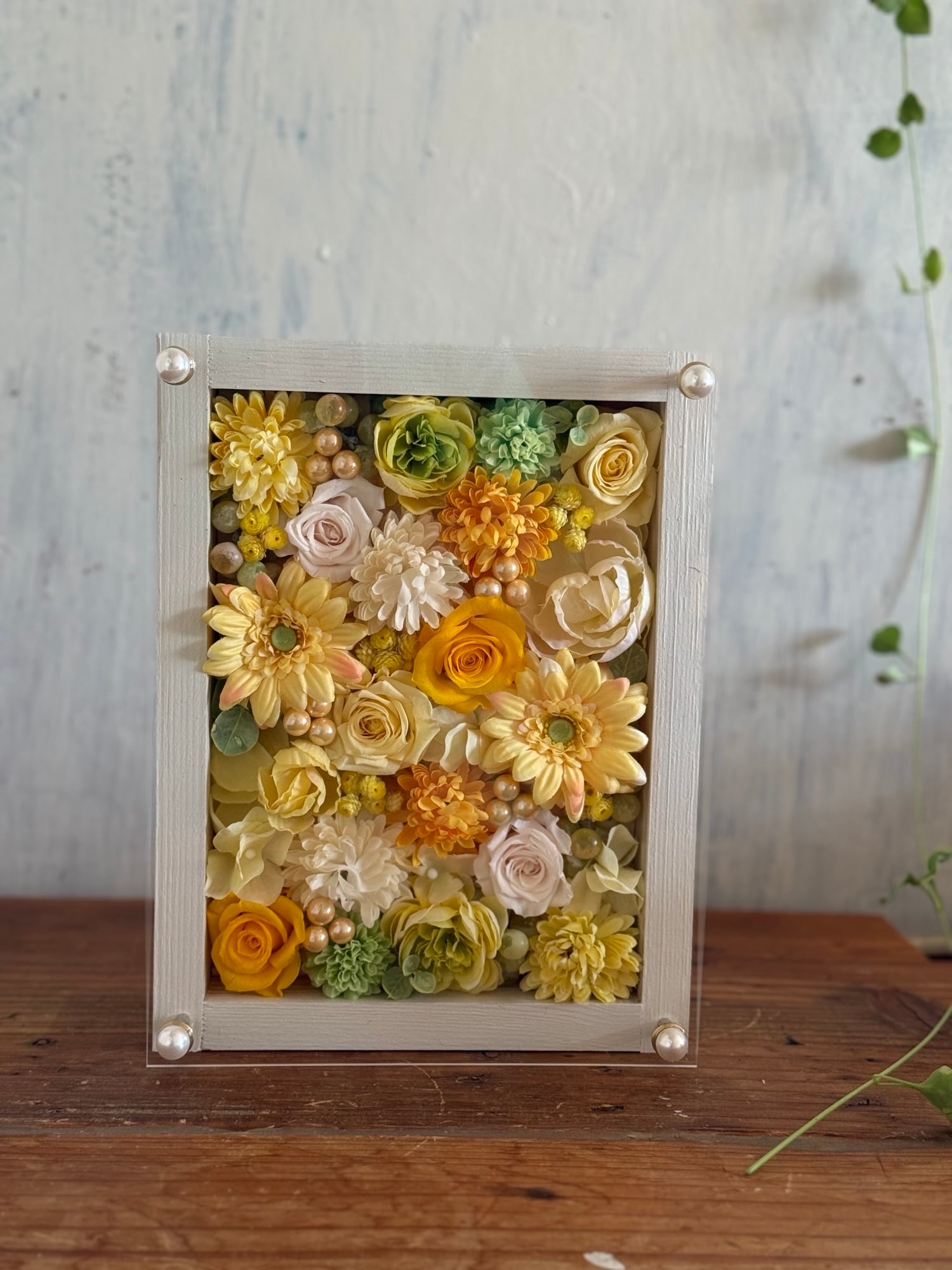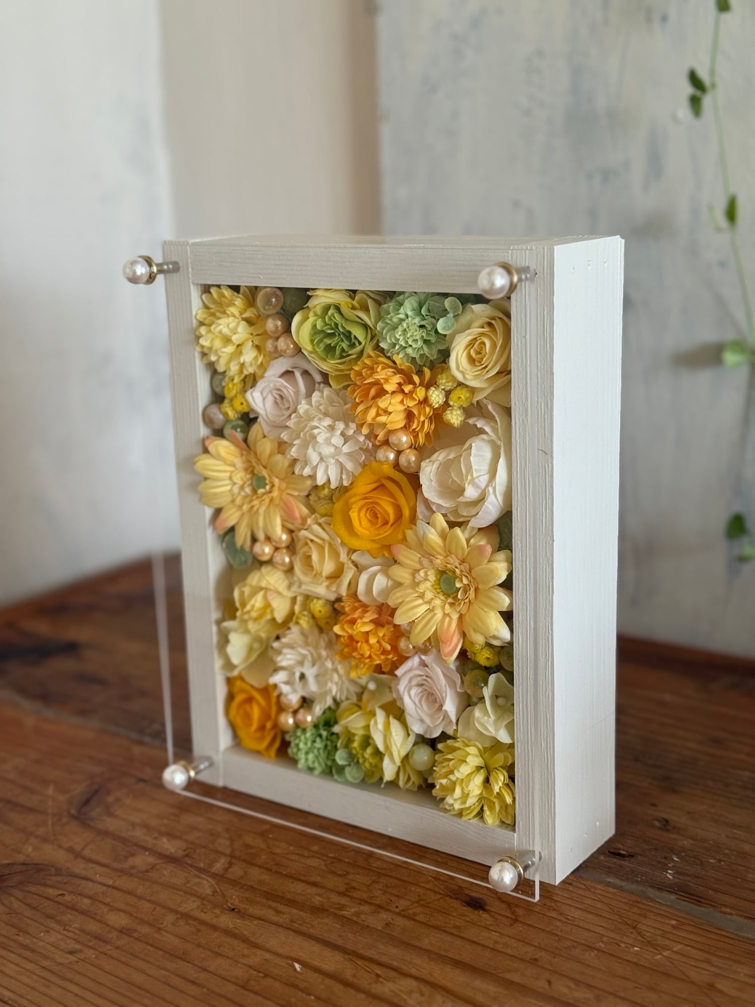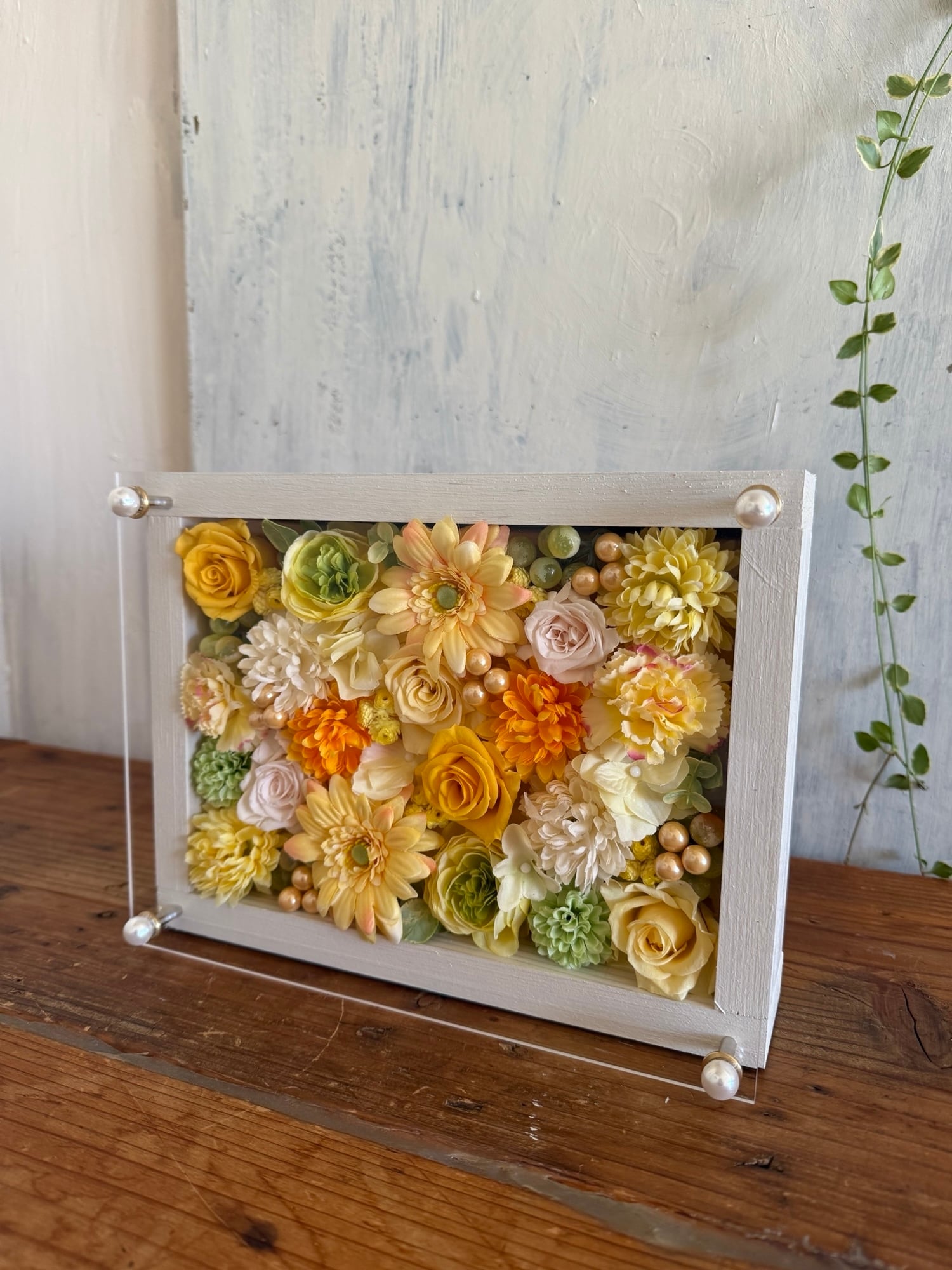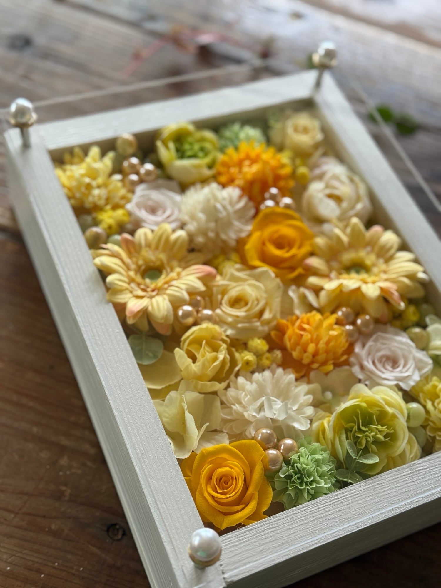 白色のウッドフレームにプリザーブドフラワーと造花をぎっしり詰め込み、アクリル板にはカッティングシートでメッセージをお入れします。