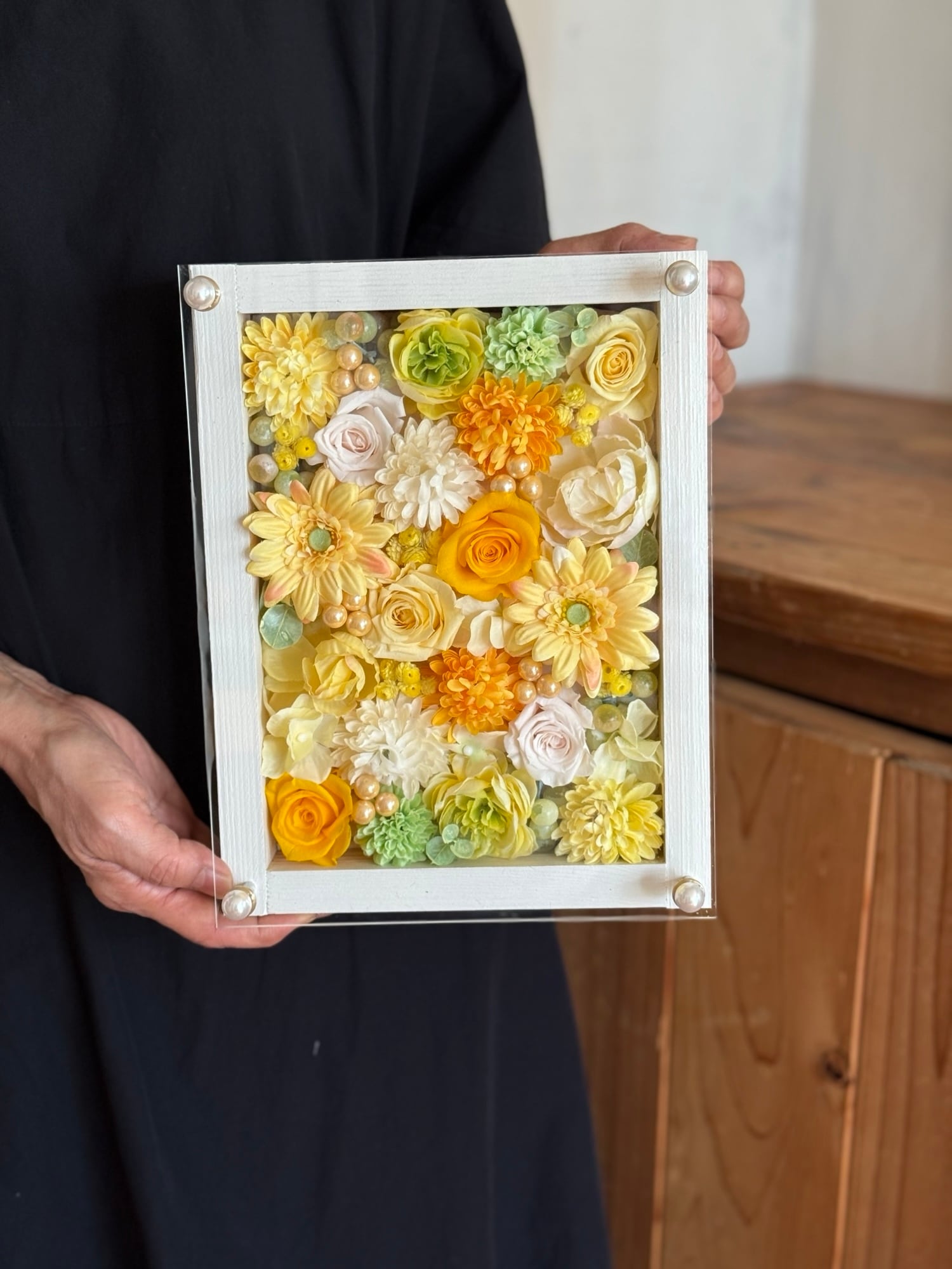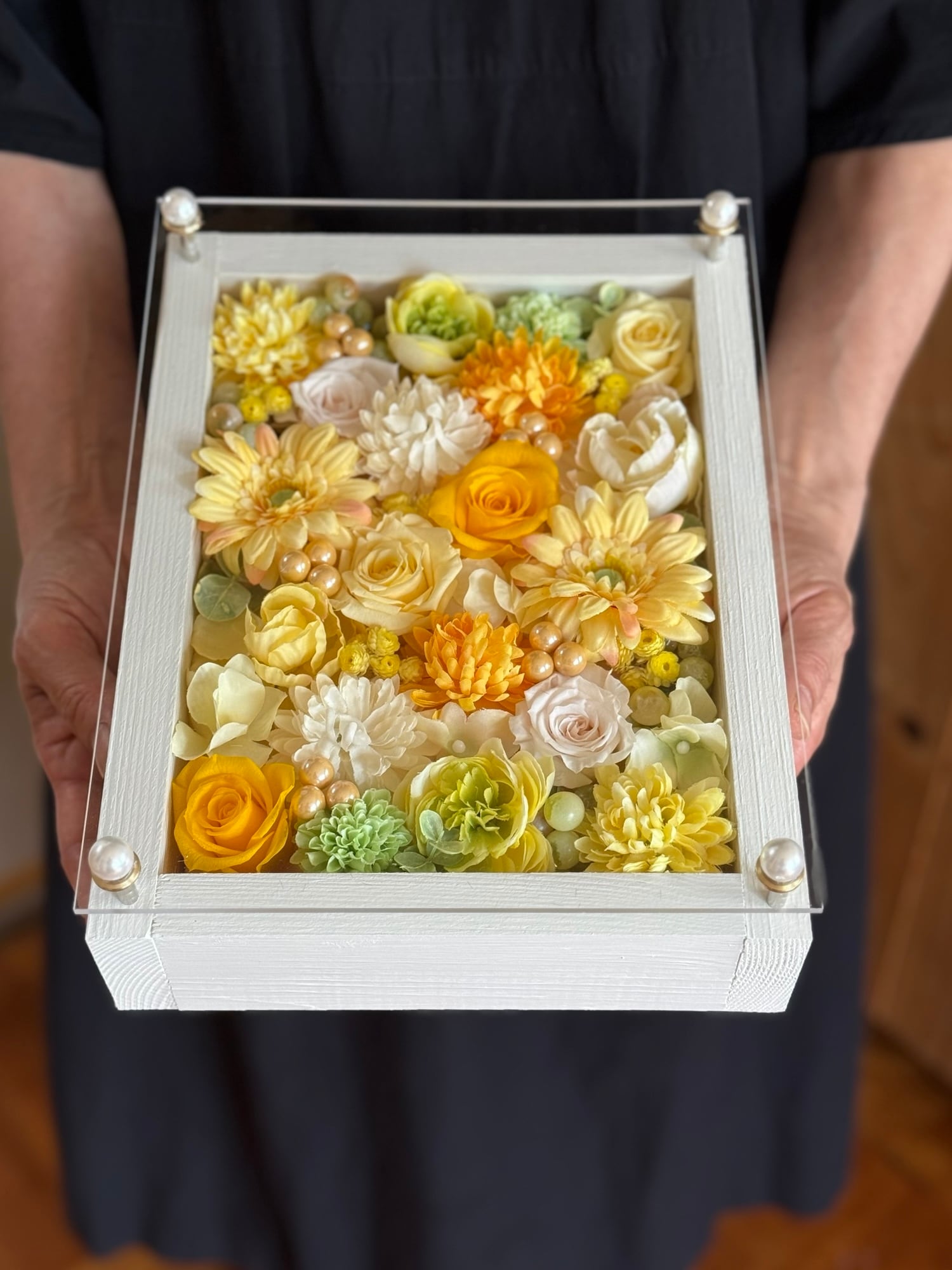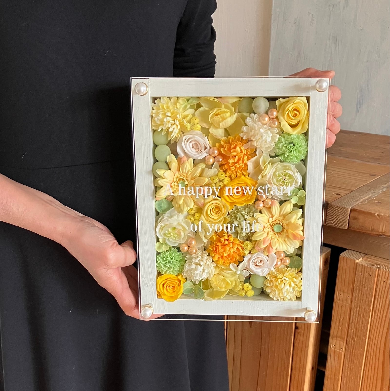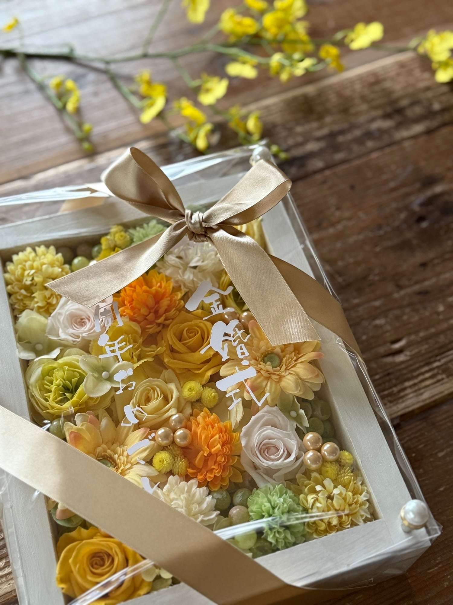 米寿祝い・金婚式祝い・開店祝い・サロンオープン祝い・退職祝い【名入れ】プリザーブドフラワーアレンジ ウッドフレーム 白木枠〈レモンイエロー〉