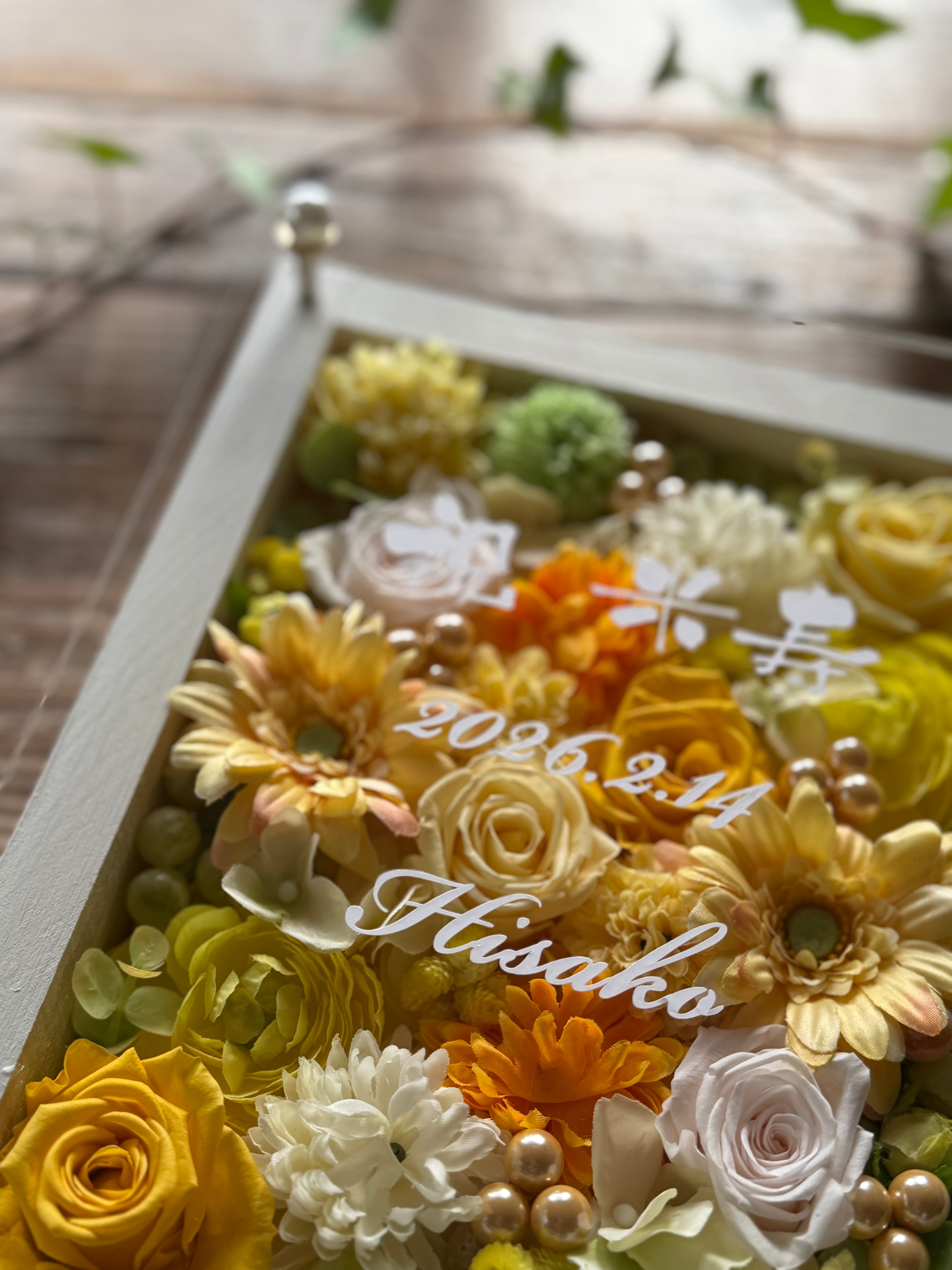 レモンイエローの華やかな名入れお花フレーム