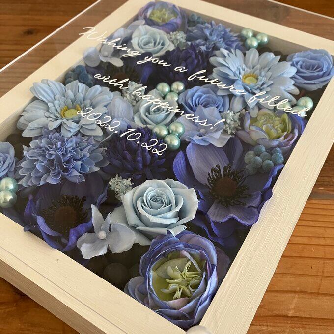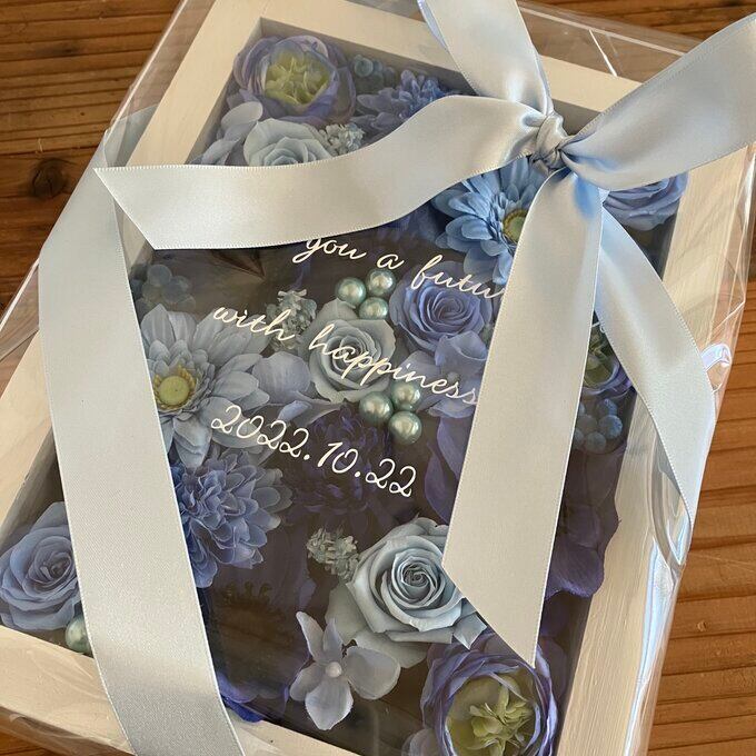 プリザーブドフラワーアレンジ「木枠〈ブルー〉文字入れ」は、