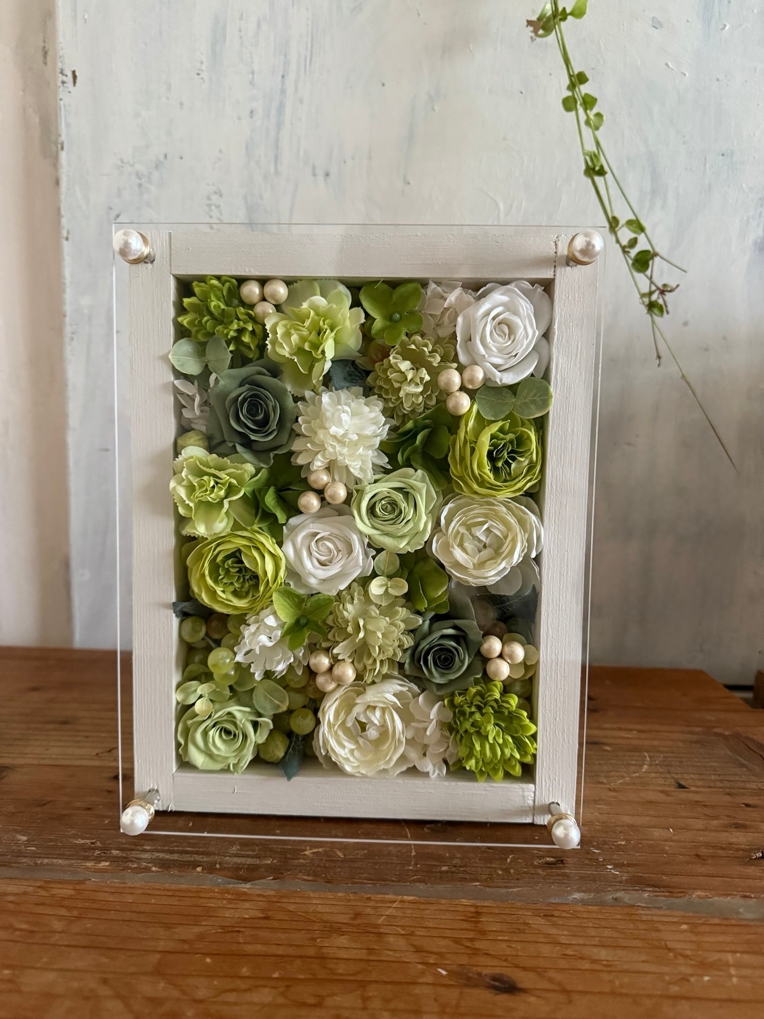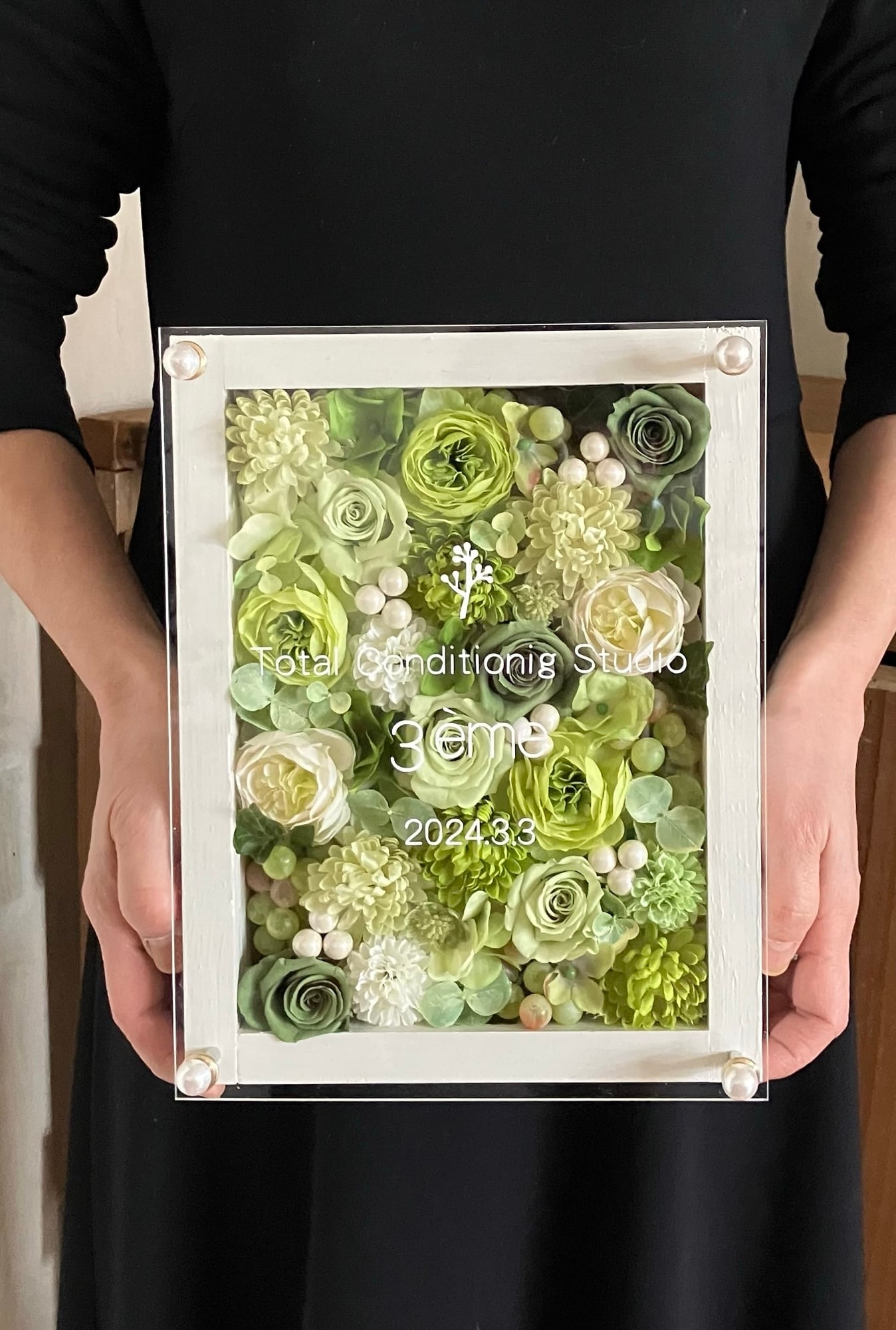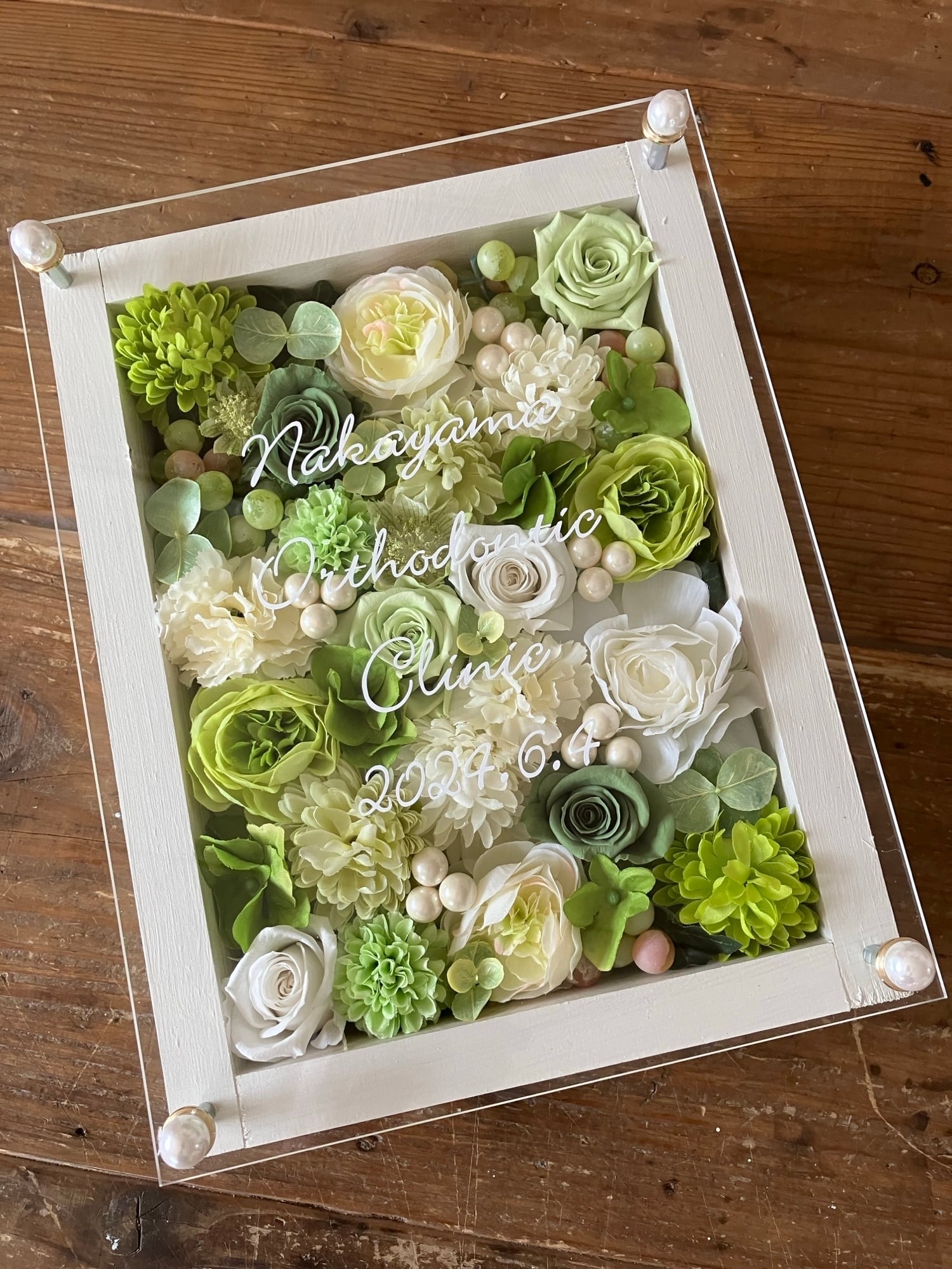 開店祝い・サロンオープン祝い・開院祝い・退職祝い【名入れ】プリザーブドフラワーアレンジ ウッドフレーム 白木枠〈白グリーン〉