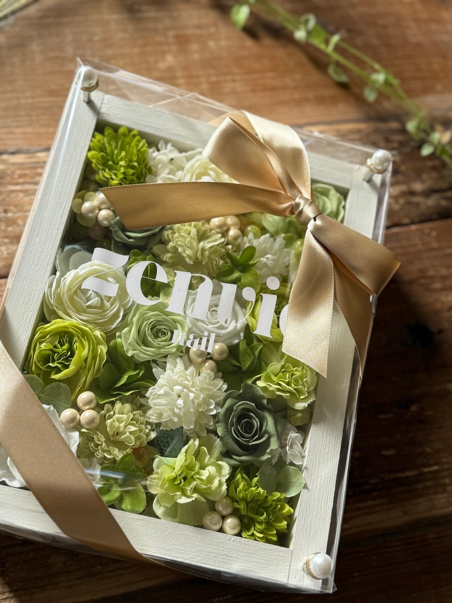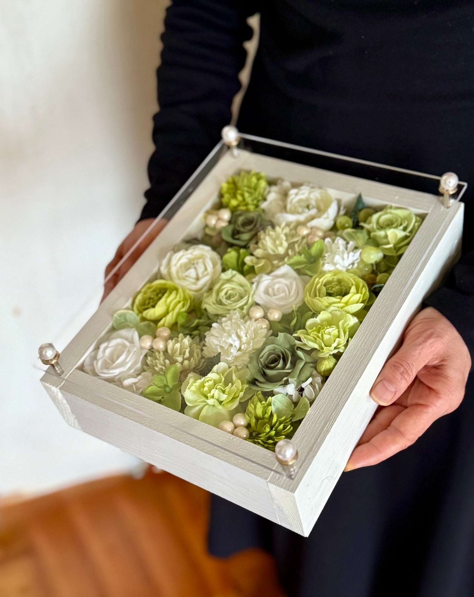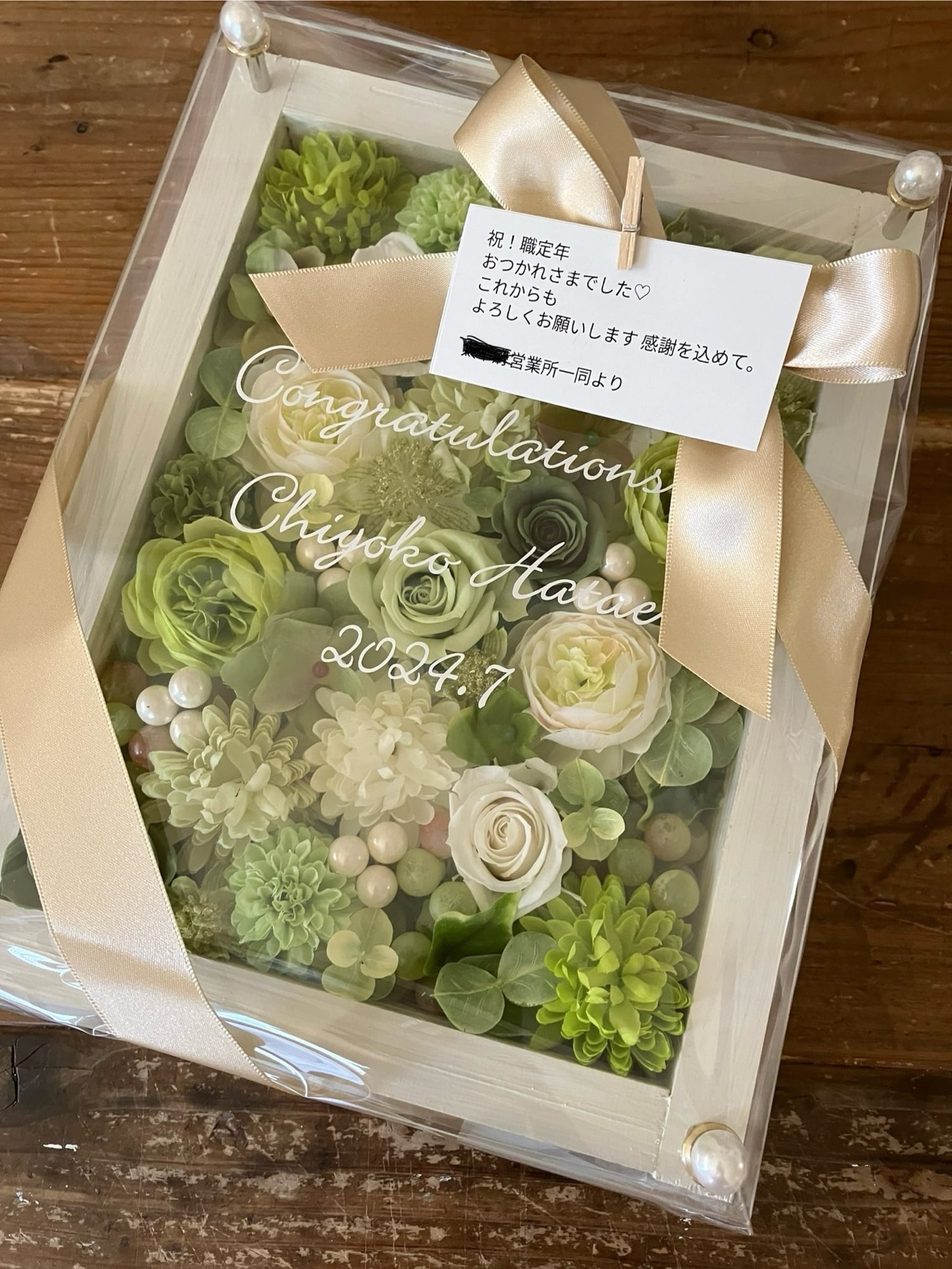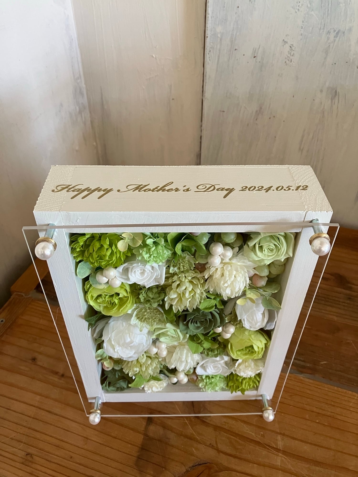 開店祝い・サロンオープン祝い・開院祝い・退職祝い【名入れ】プリザーブドフラワーアレンジ ウッドフレーム 白木枠〈白グリーン〉