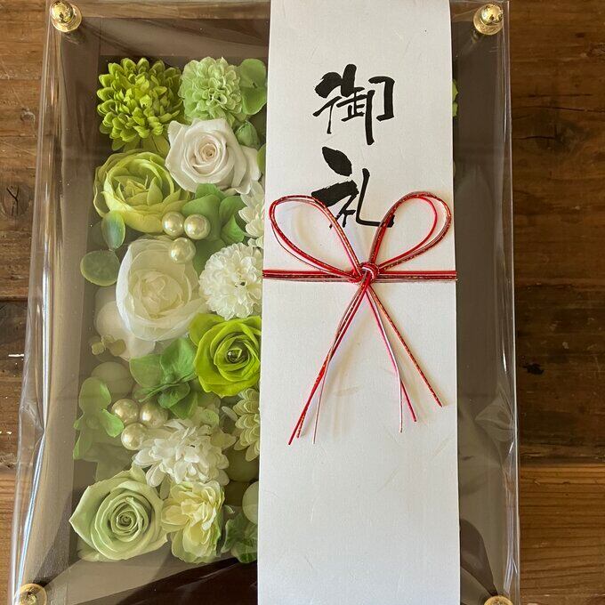 サンクスギフト|木枠〈白グリーン〉名入れ可/結婚・開店・お供え・記念品に