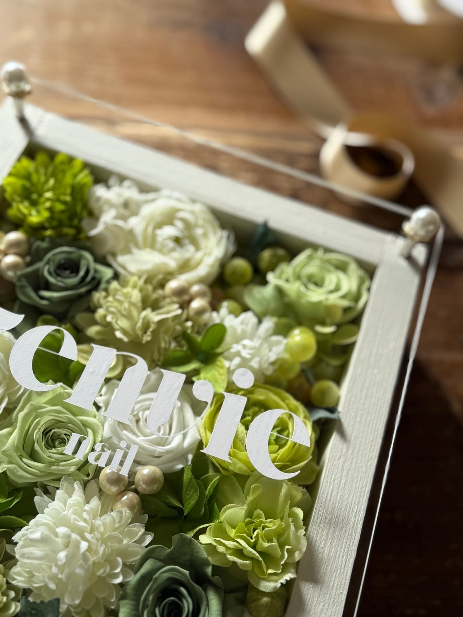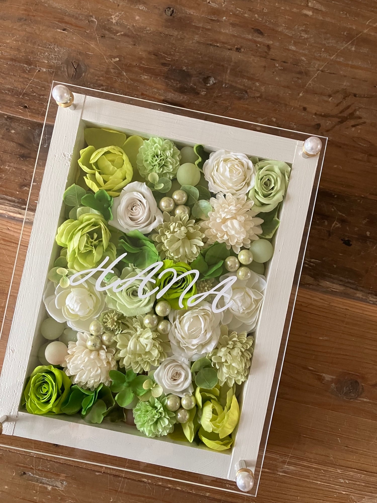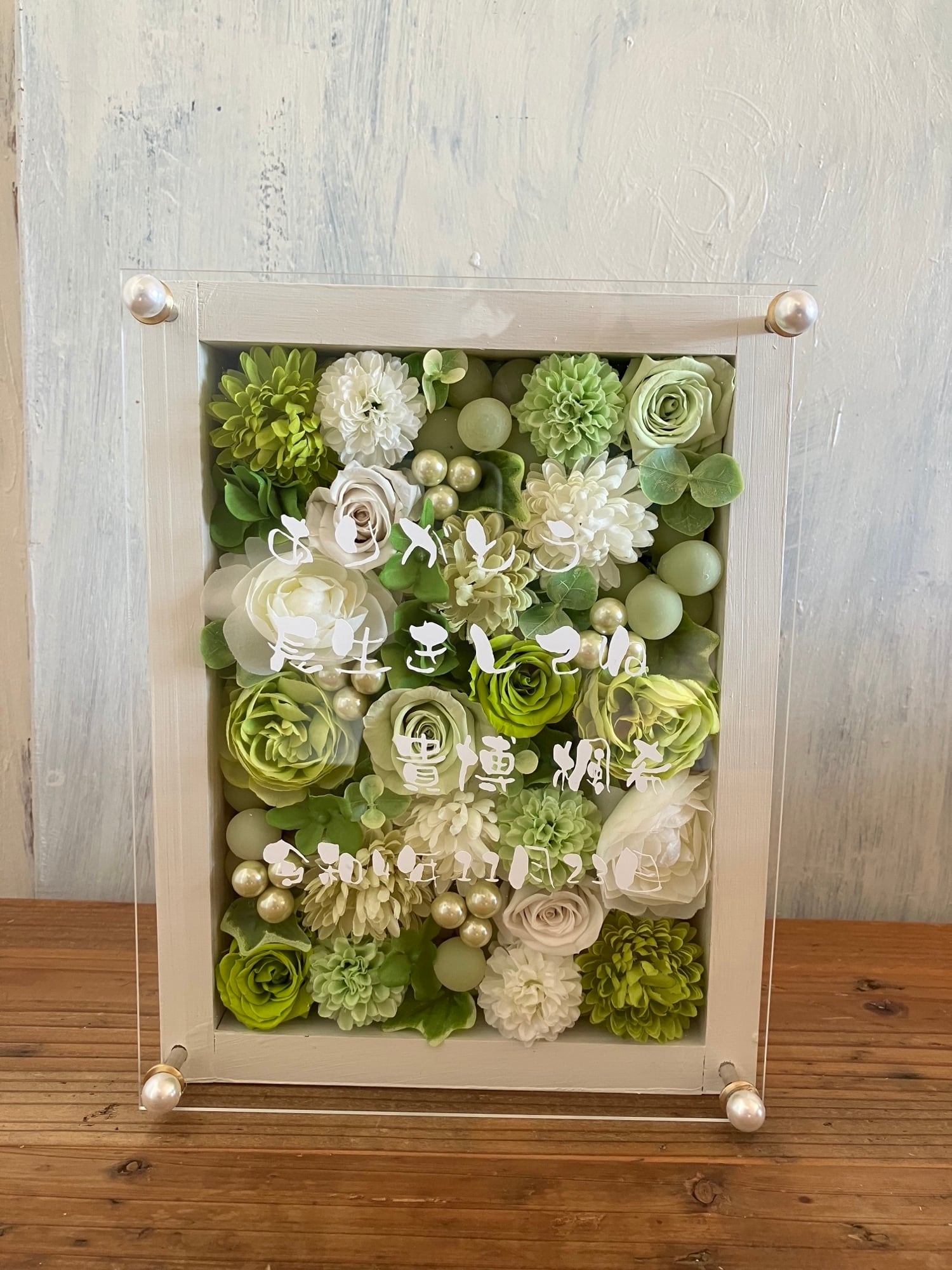 白色のウッドフレームにプリザーブドフラワーと造花をぎっしり詰め込み、アクリル板にはカッティングシートでメッセージをお入れします。