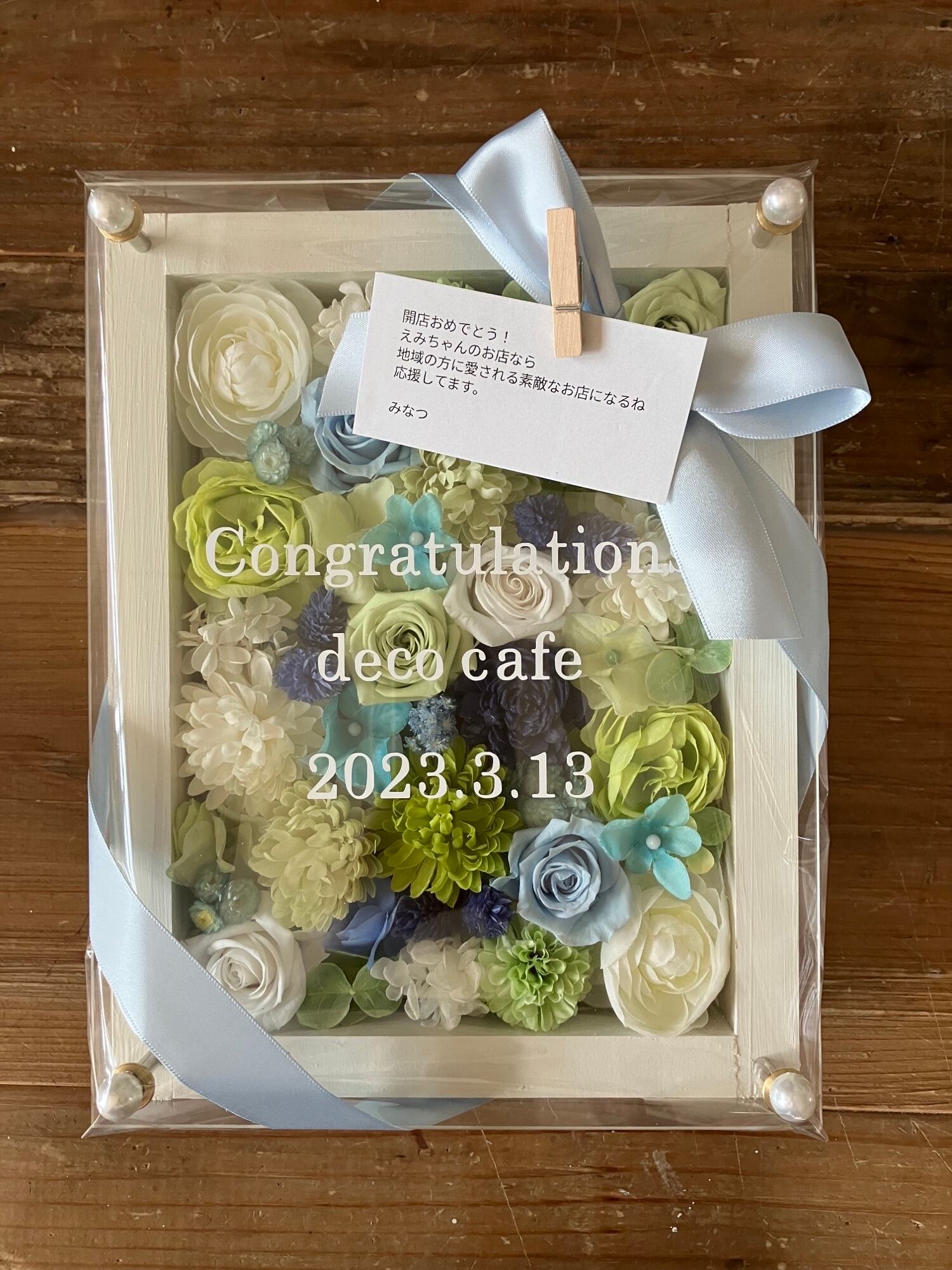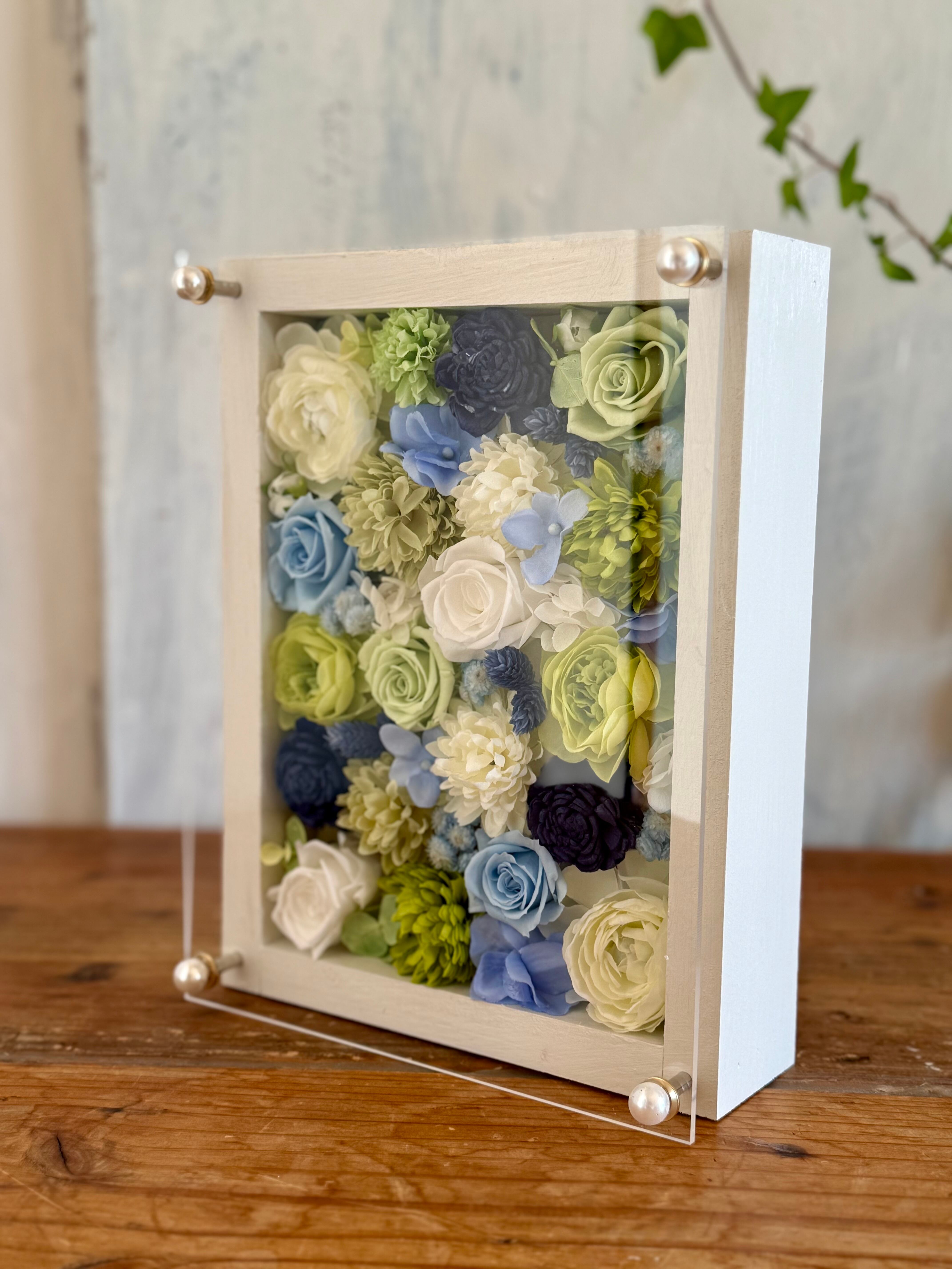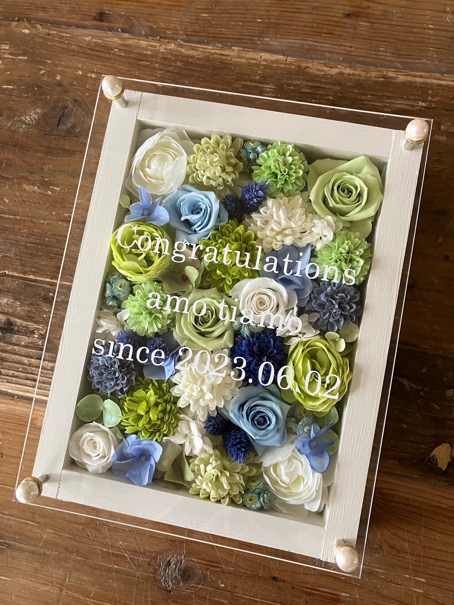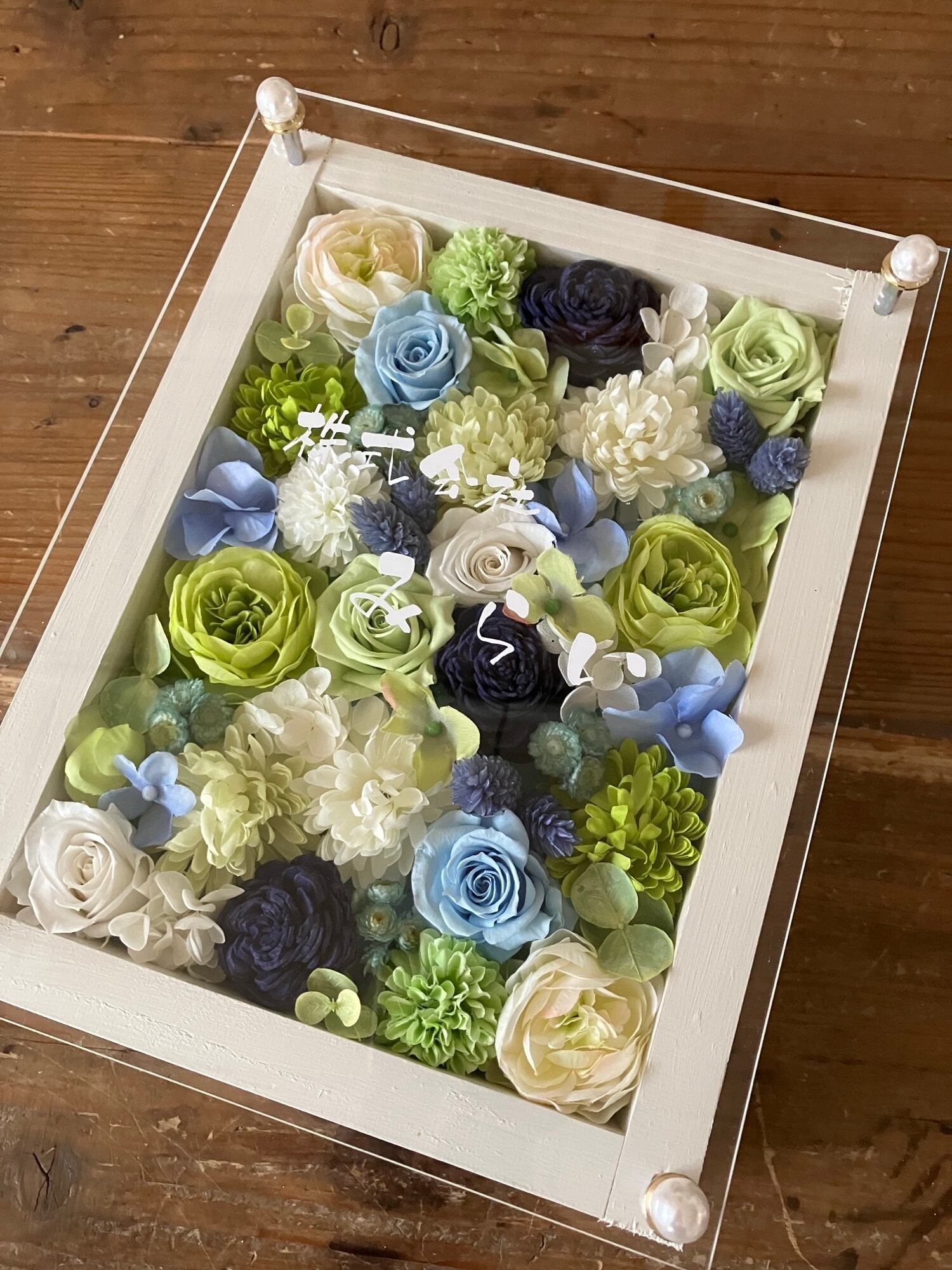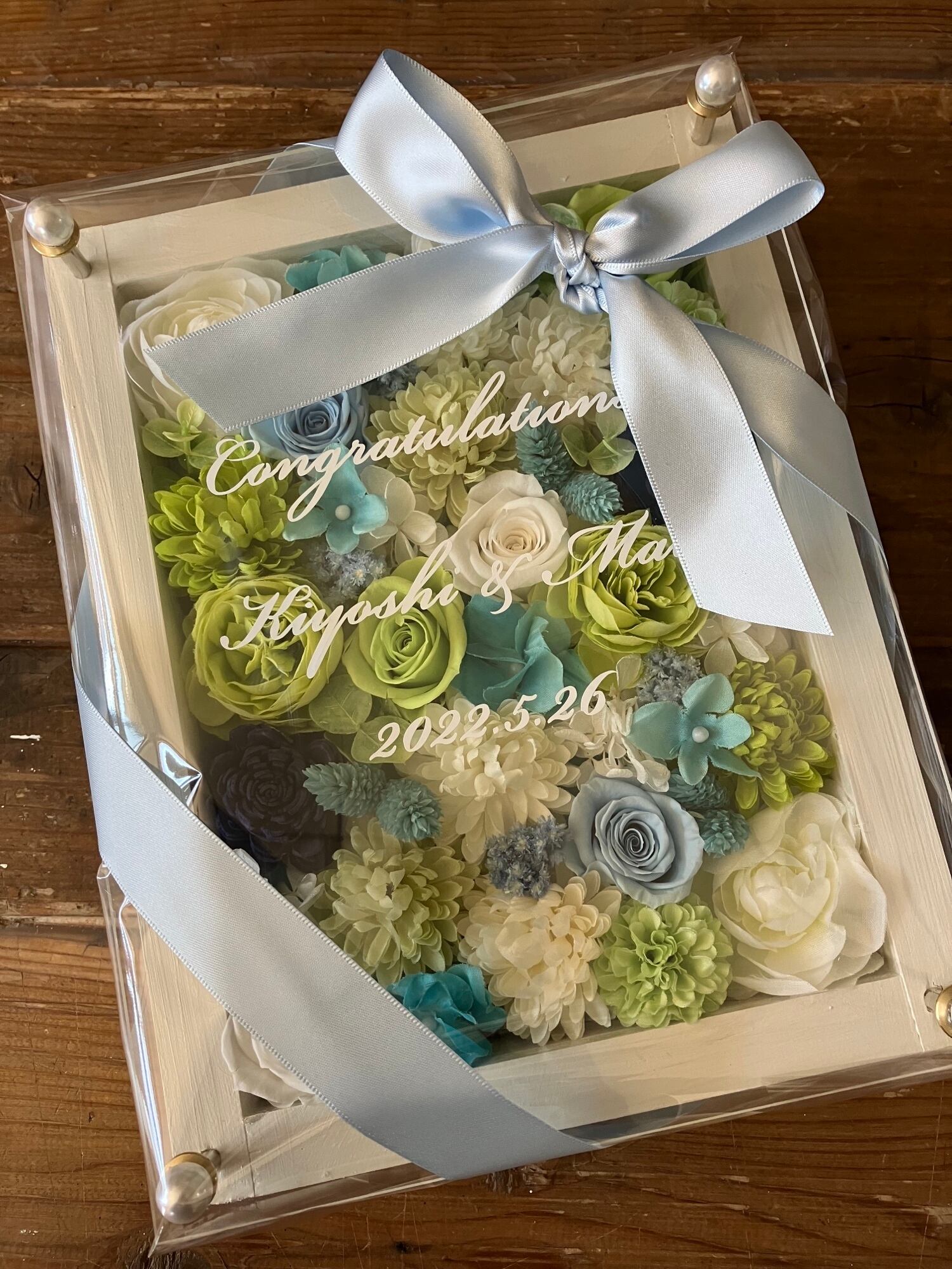 結婚祝い・開店祝い・開院祝い・サロンオープン祝い・周年祝い【名入れ】プリザーブドフラワーアレンジ ウッドフレーム 白木枠〈白グリーンブルー〉