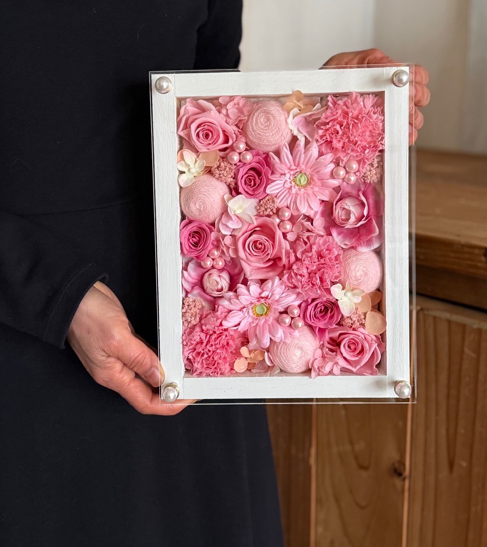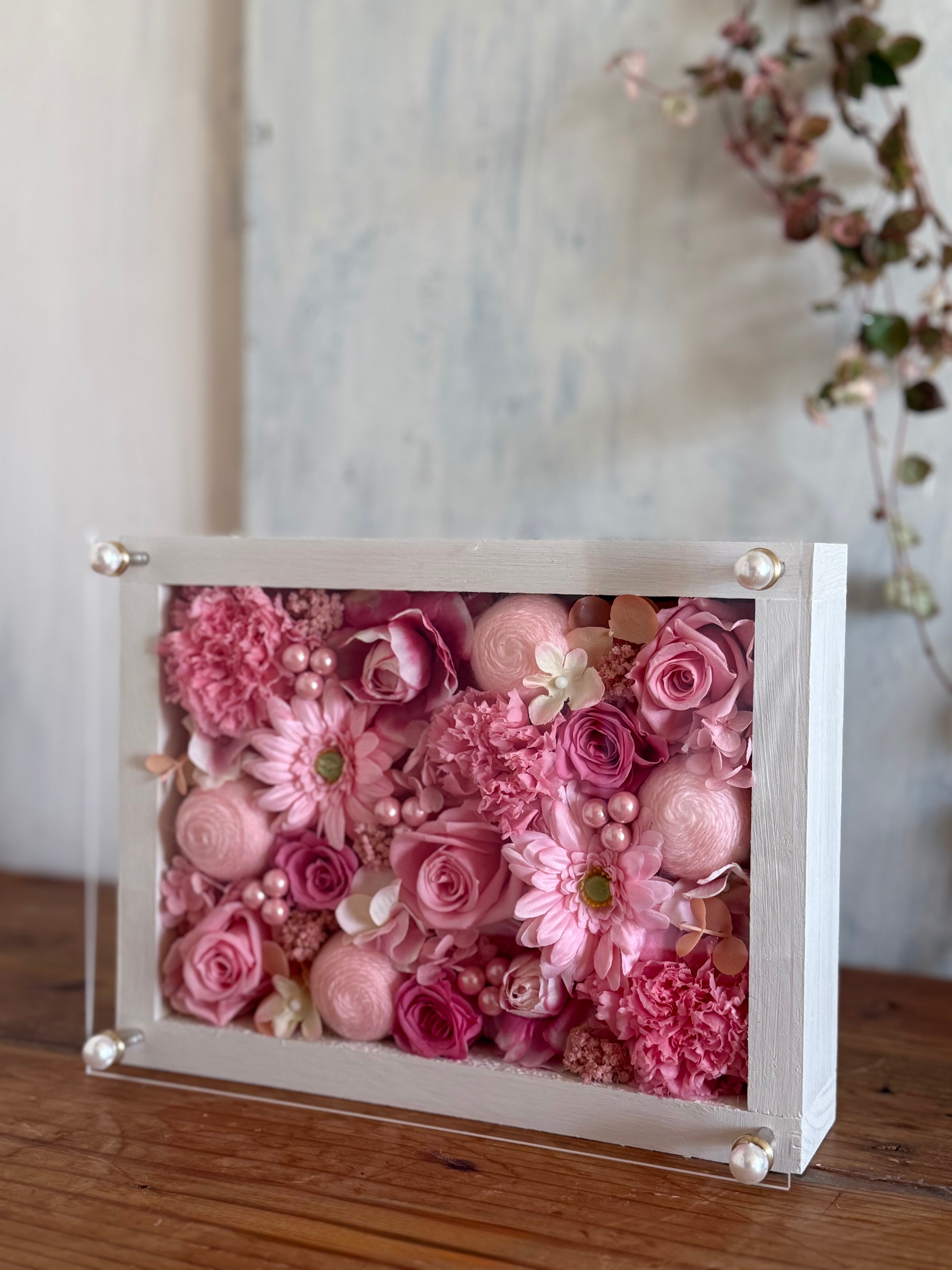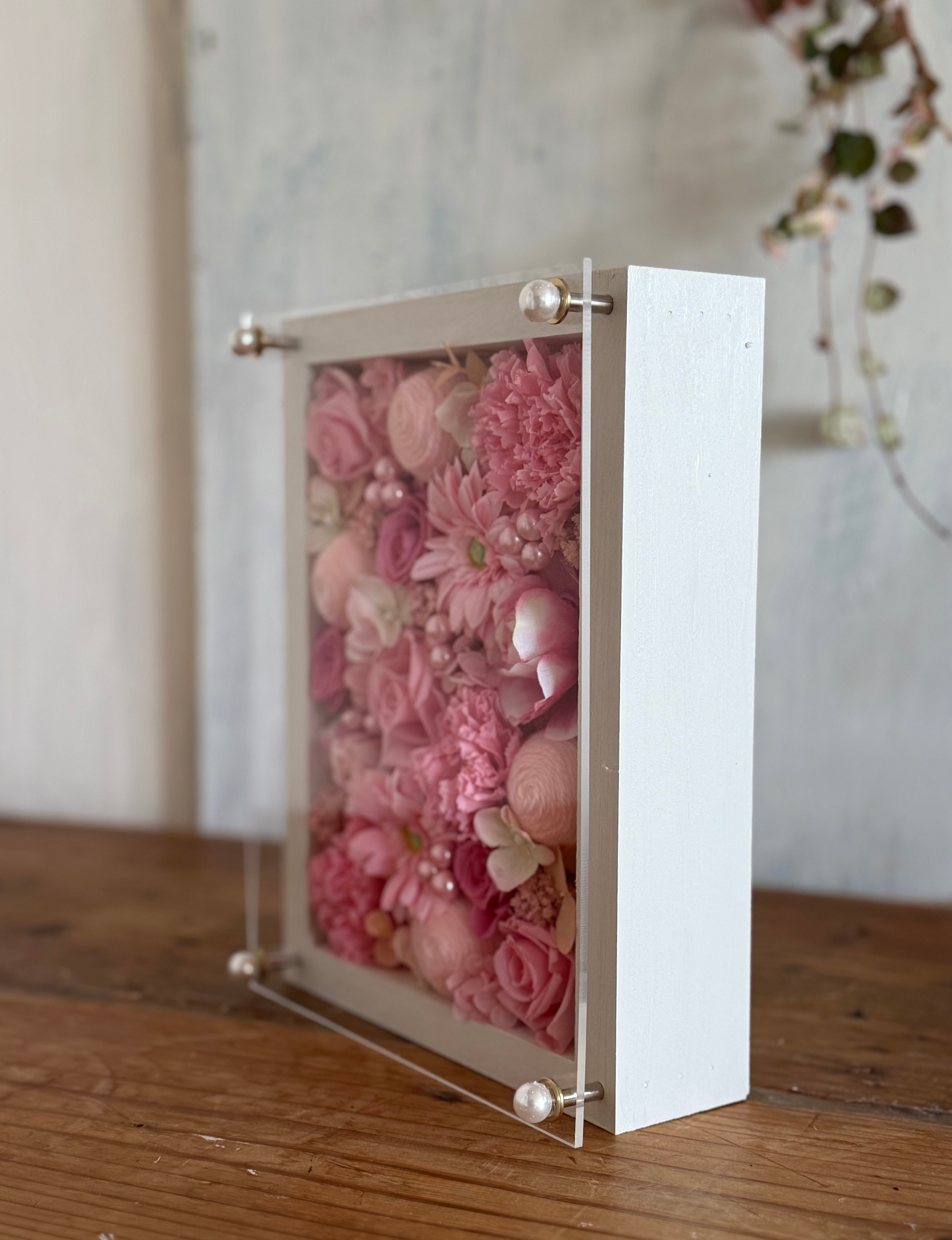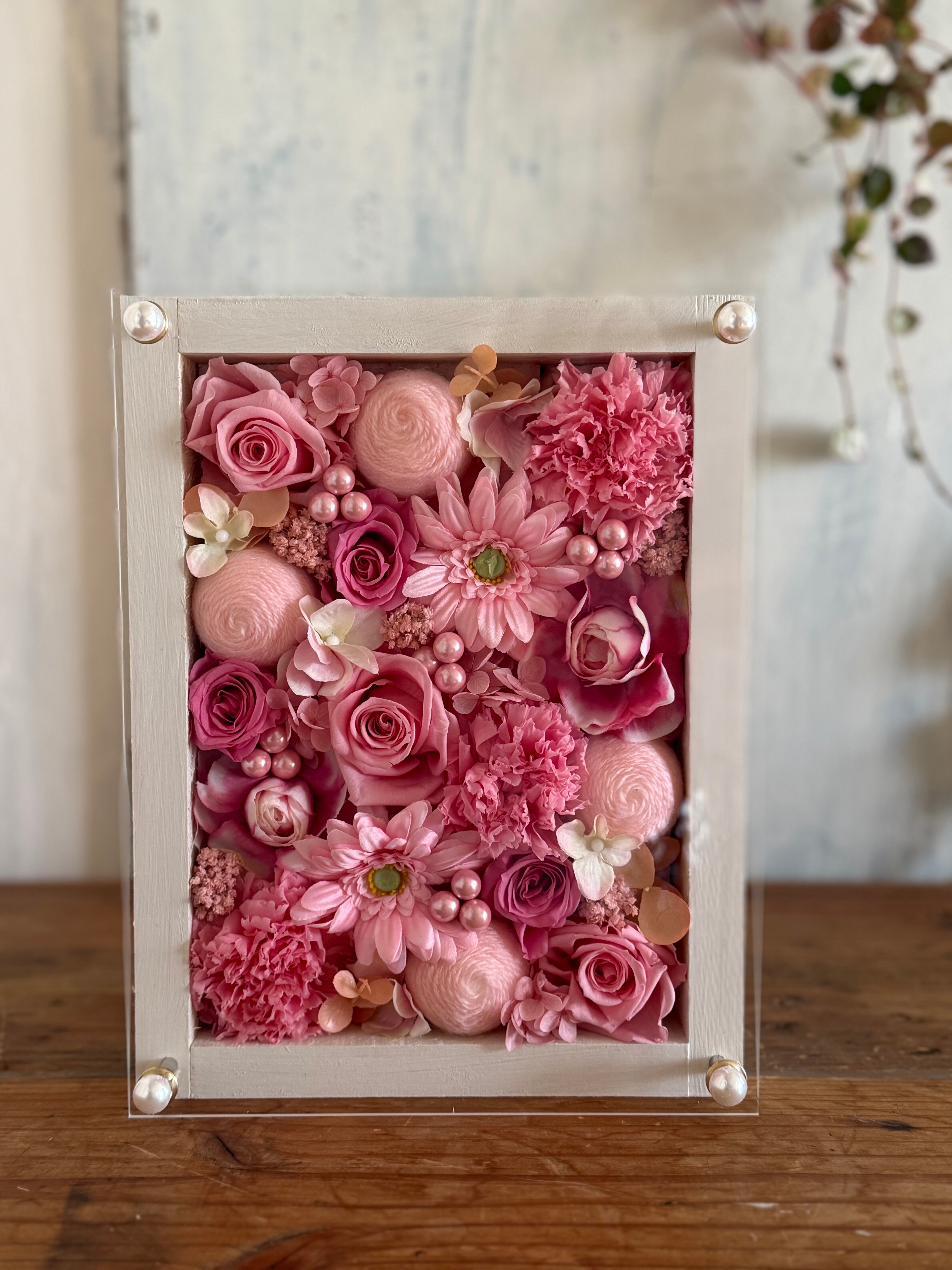ウッドフレームにプリザーブドフラワーと造花をぎっしり詰め込み、アクリル板にはカッティングシートでメッセージをお入れします。