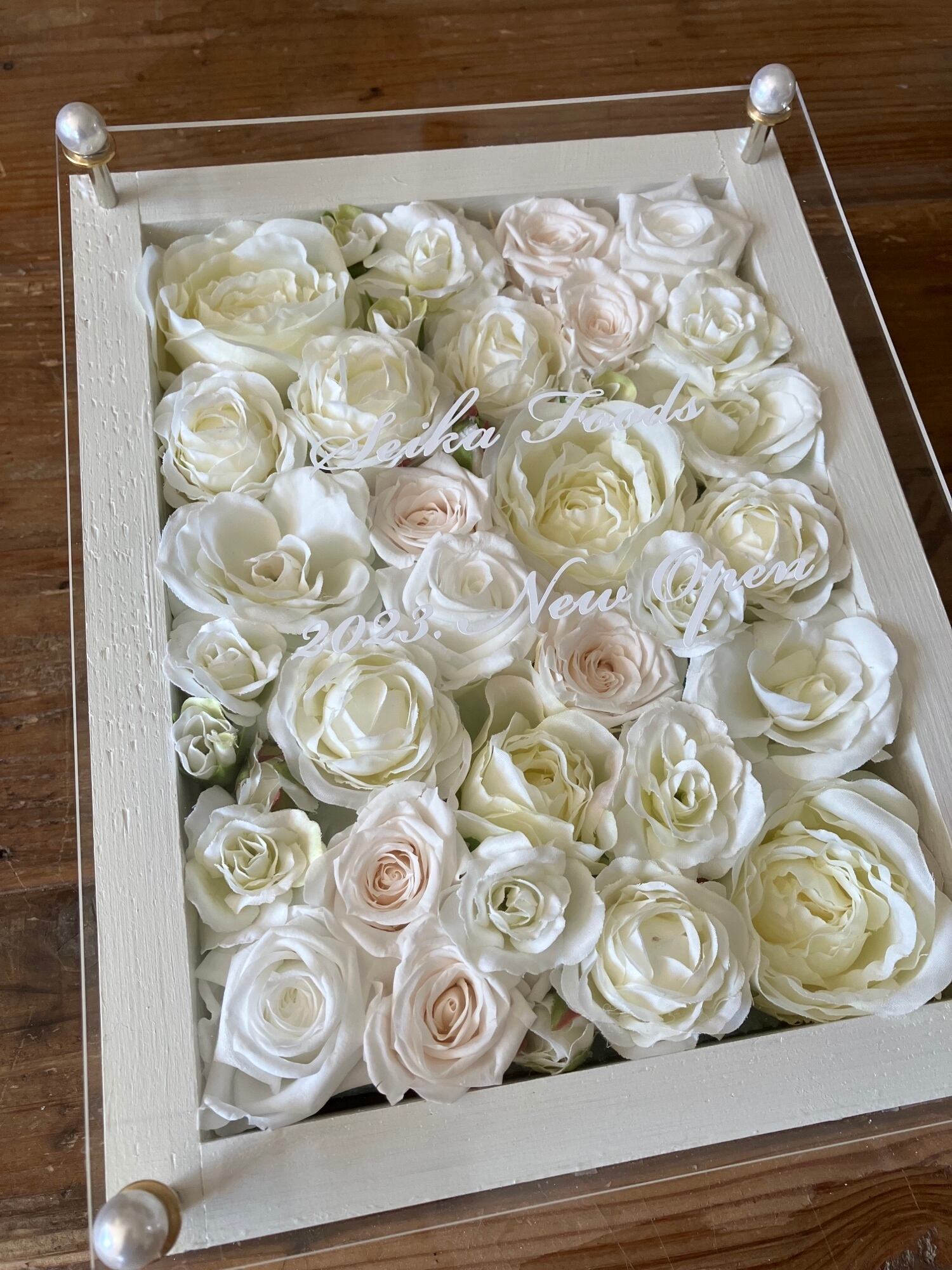白いウッドフレームに白バラのプリザーブドフラワーと造花をぎっしり詰め込み、アクリル板にはカッティングシートでメッセージをお入れします。