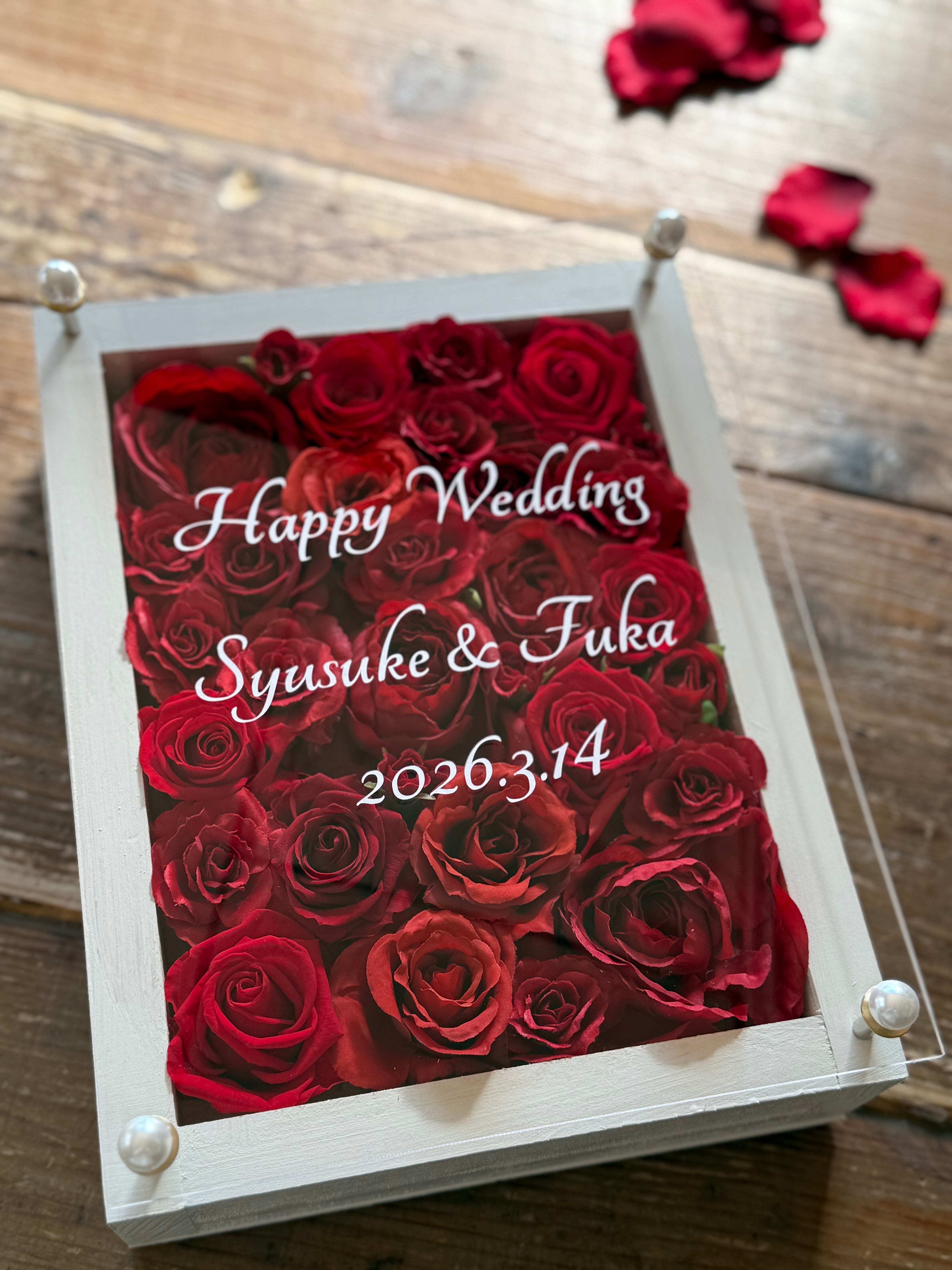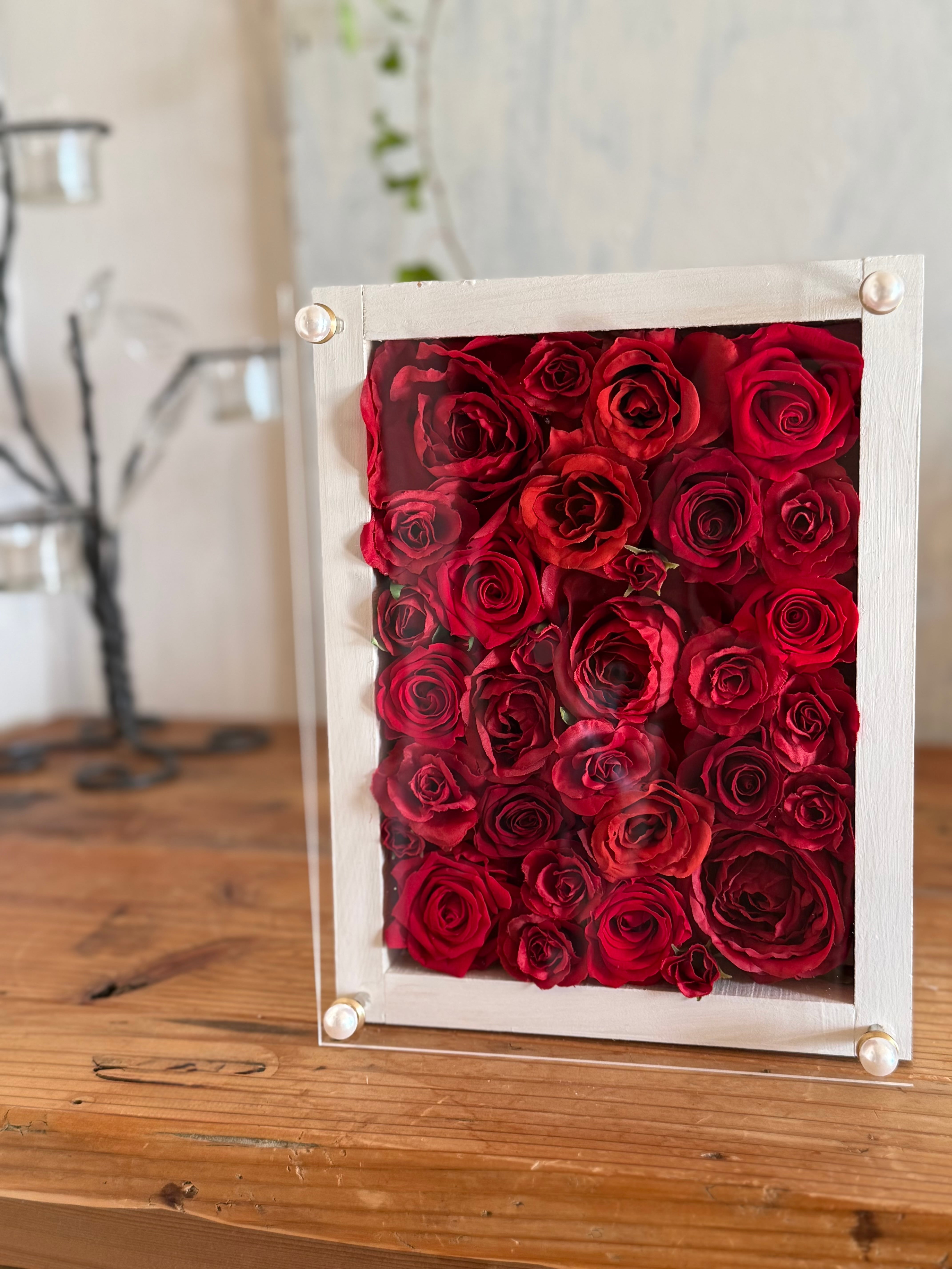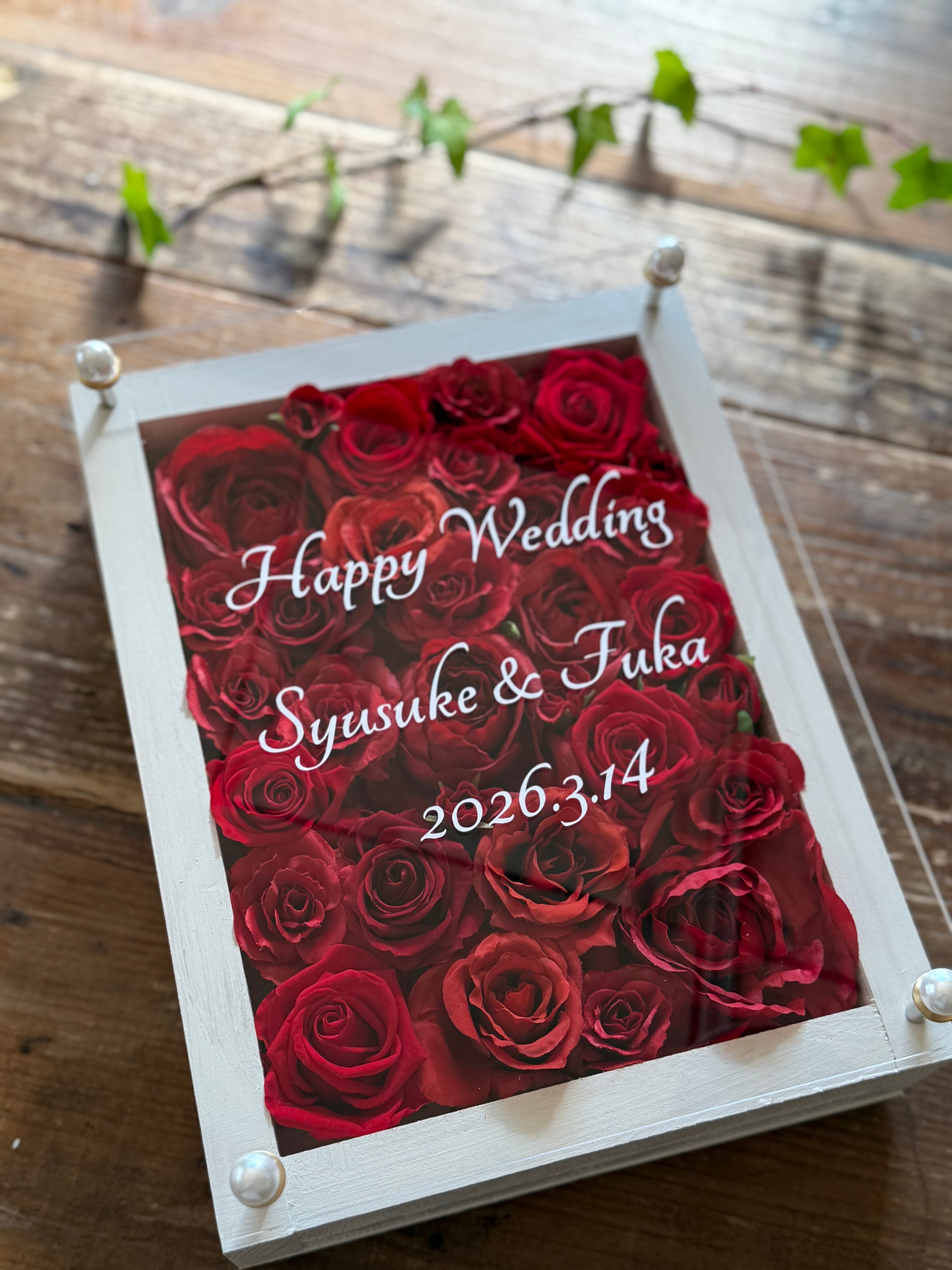ウッドフレームにプリザーブドフラワーと造花の赤バラをぎっしり詰め込みアクリル板にはカッティングシートでメッセージをお入れします。