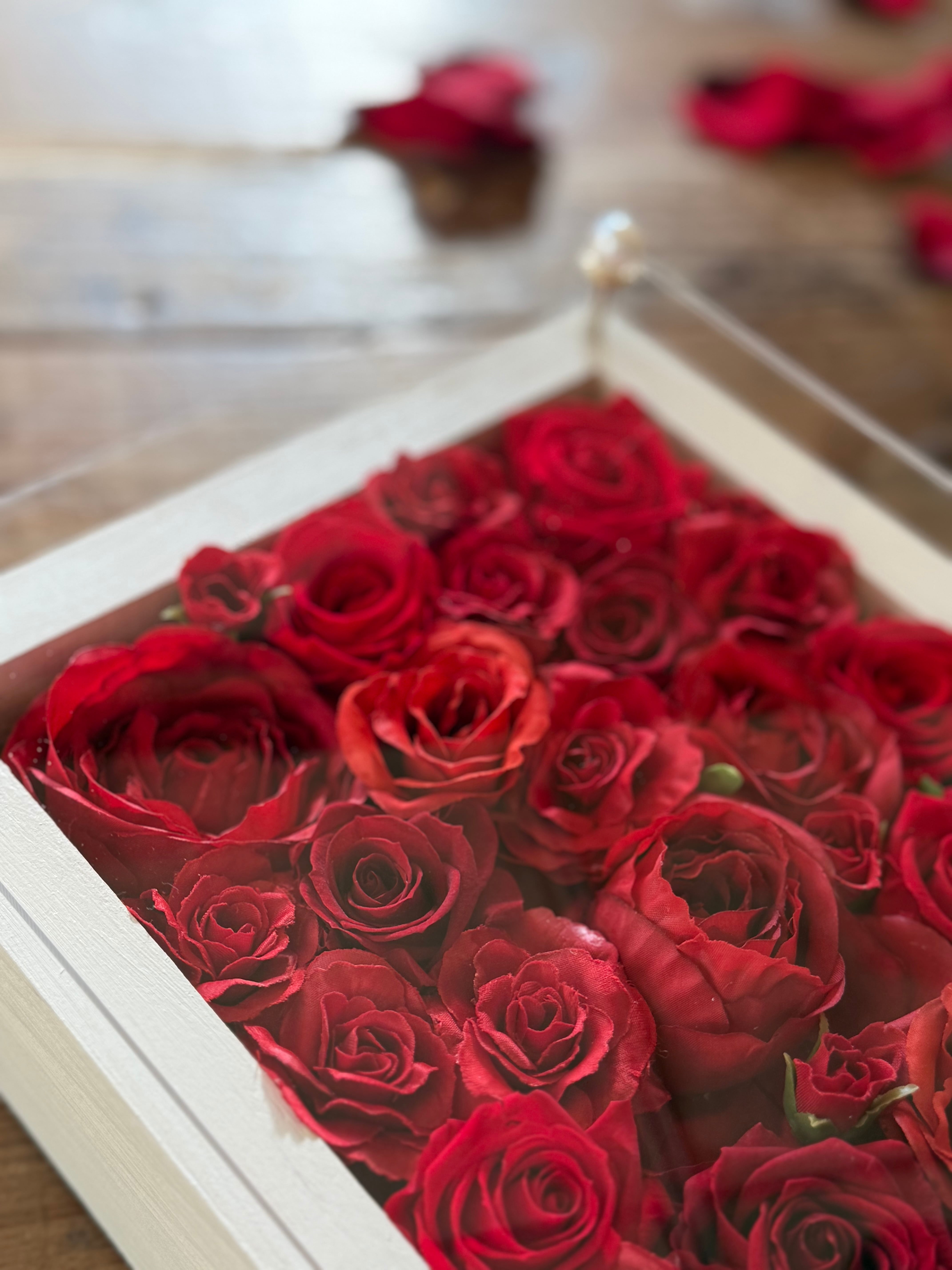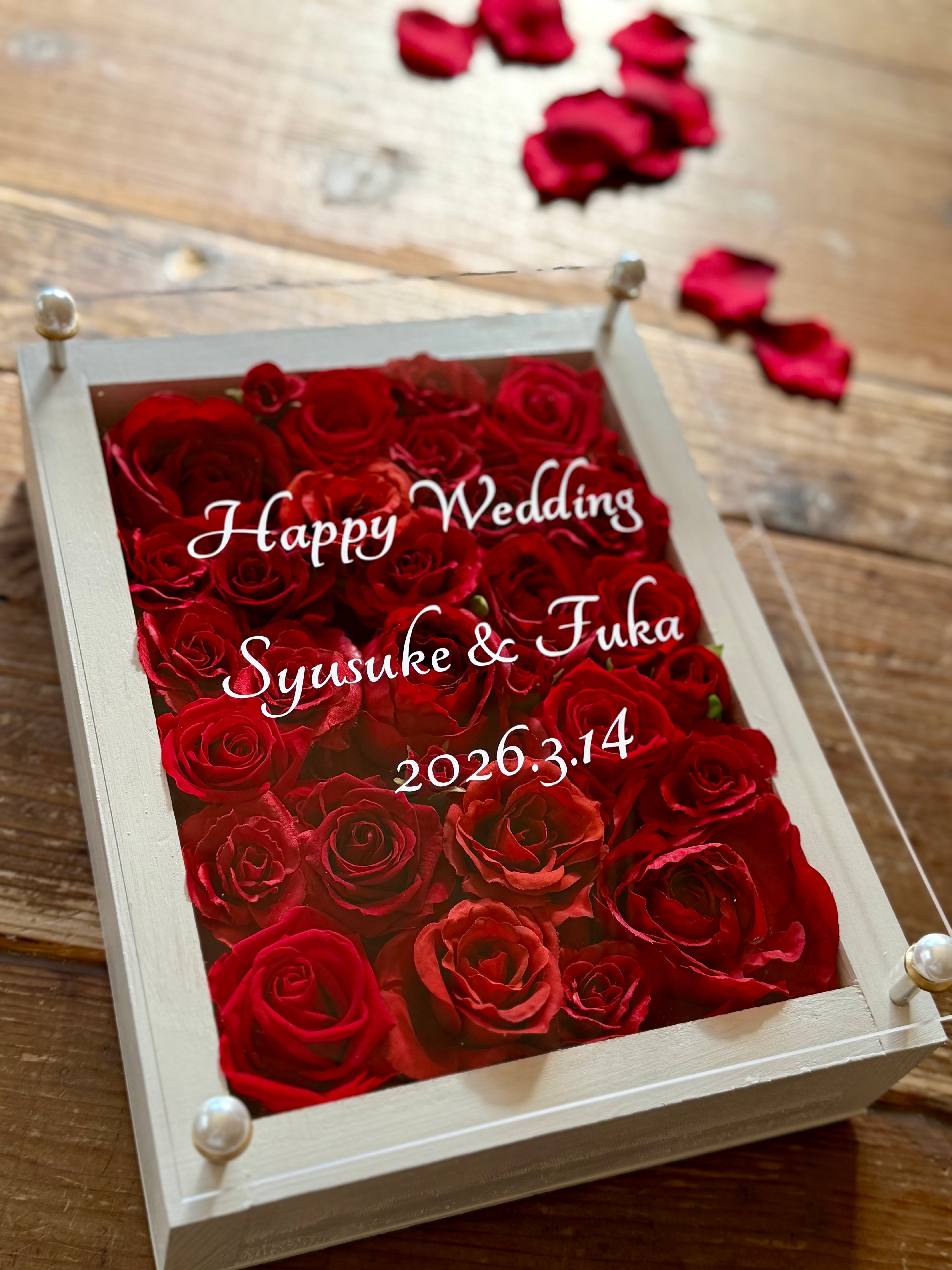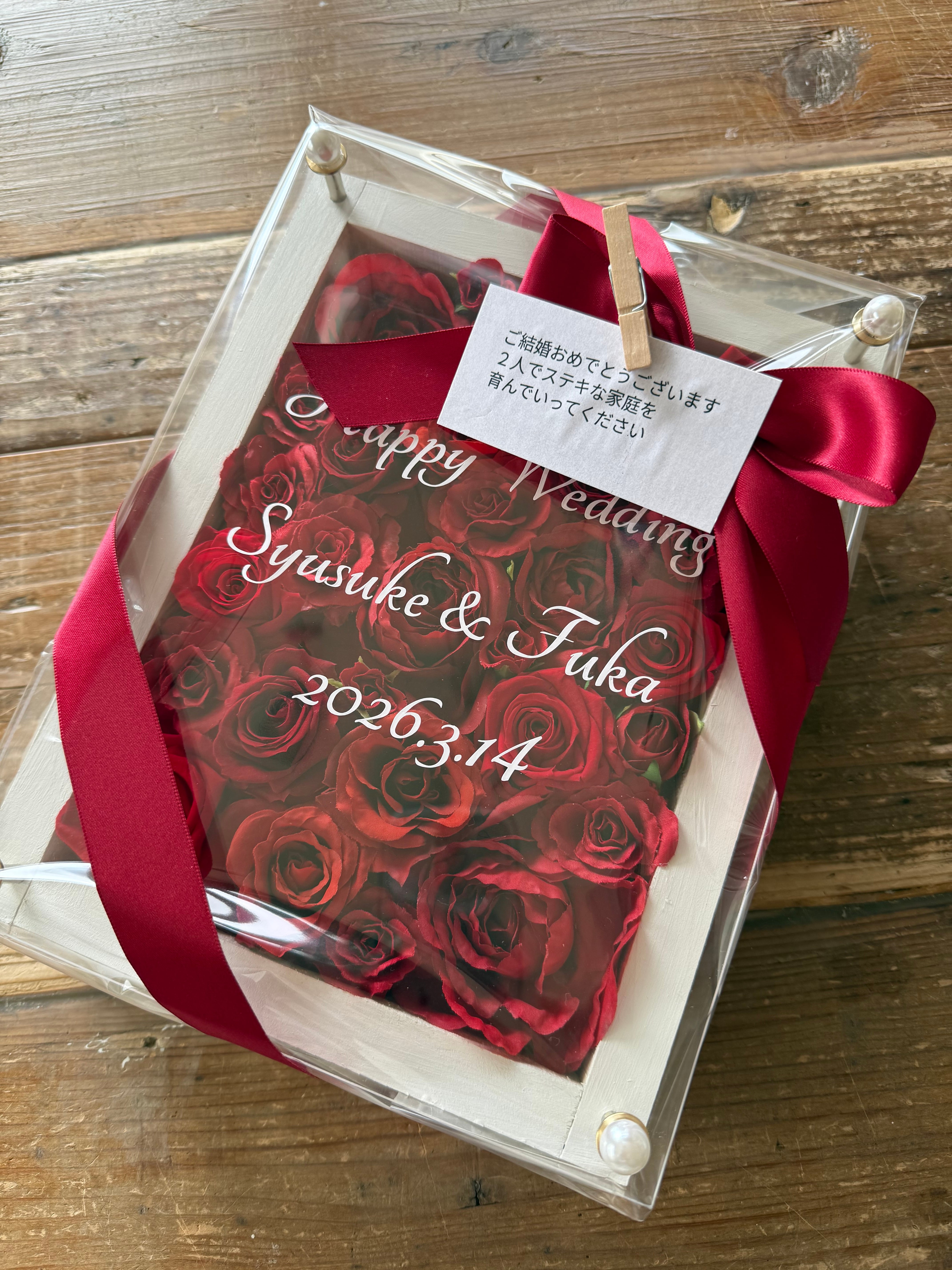 ウッドフレームにプリザーブドフラワーと造花の赤バラをぎっしり詰め込みアクリル板にはカッティングシートでメッセージをお入れします。