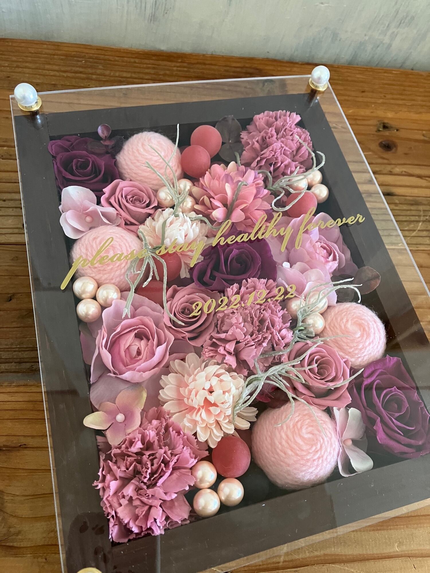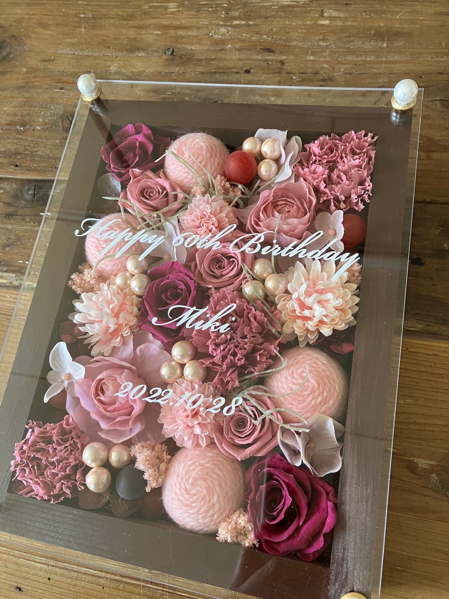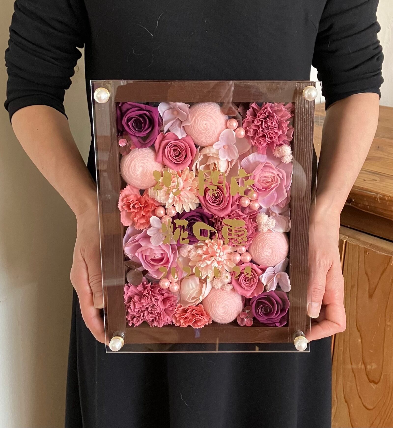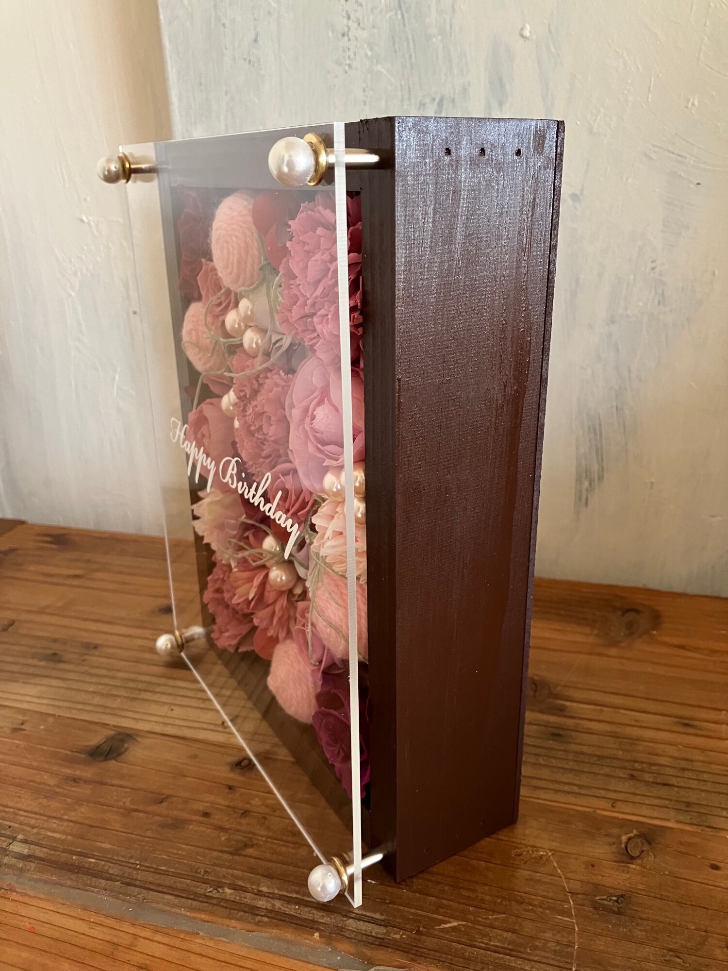 ウッドフレームにプリザーブドフラワーと造花をぎっしり詰め込み、アクリル板にはカッティングシートでメッセージをお入れします。
