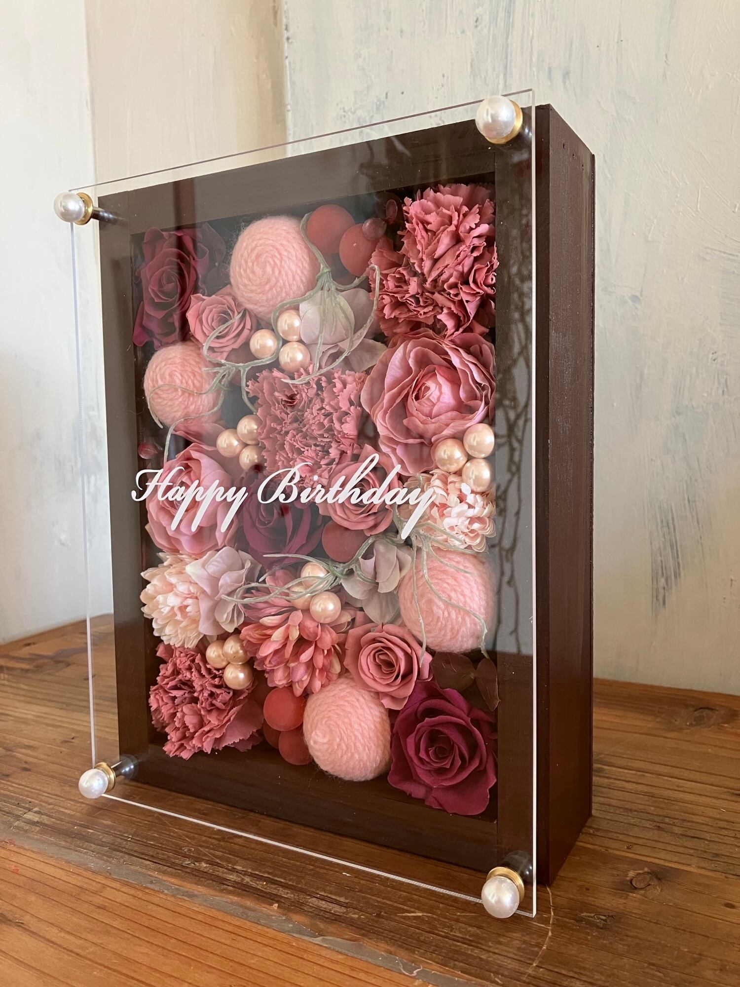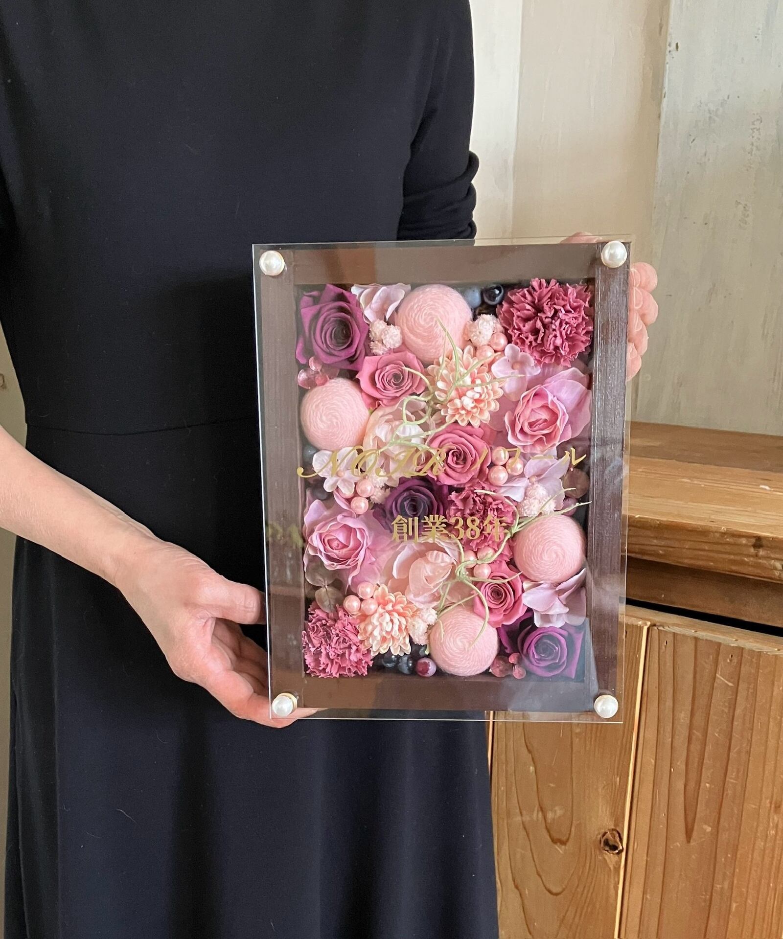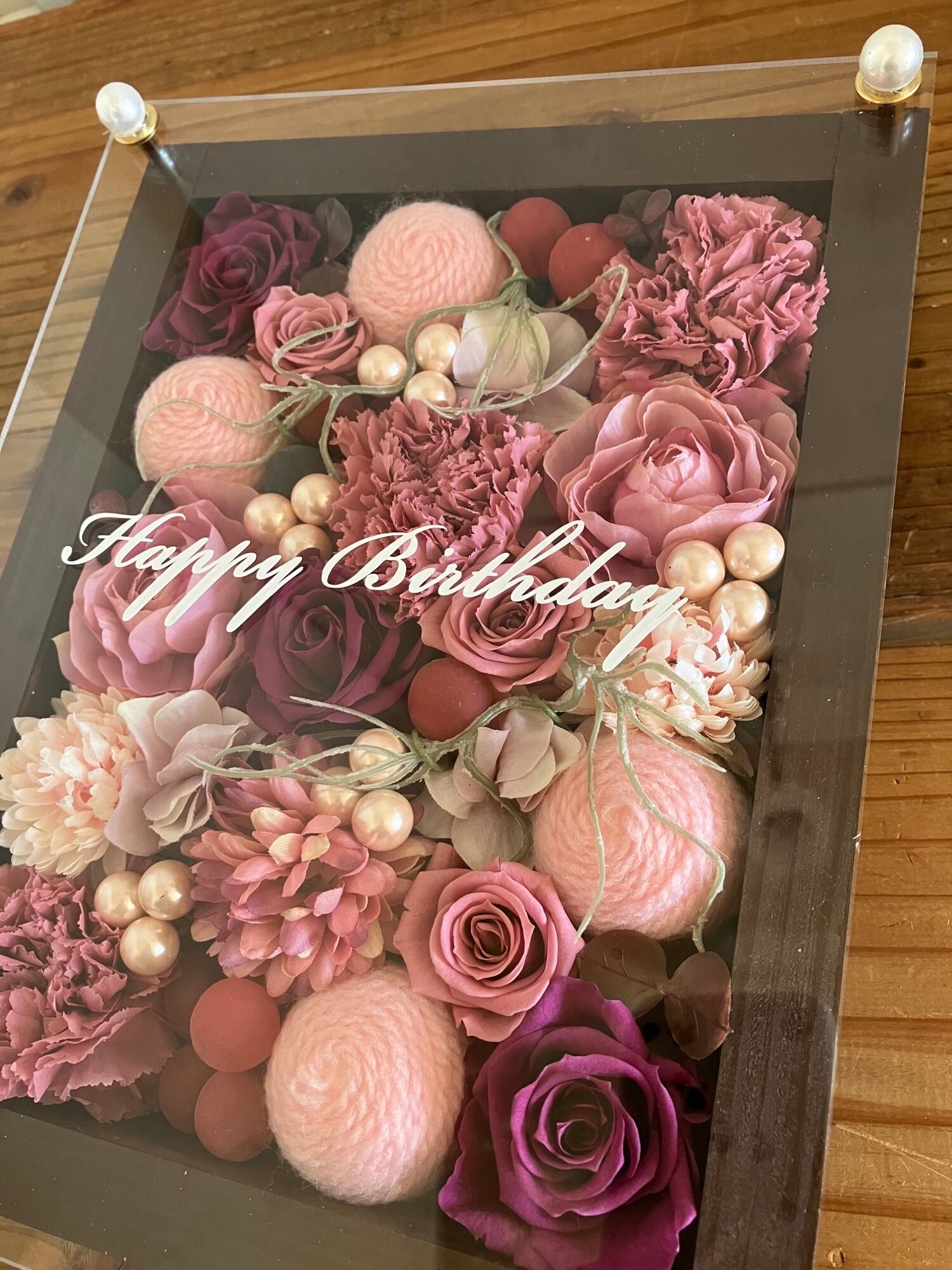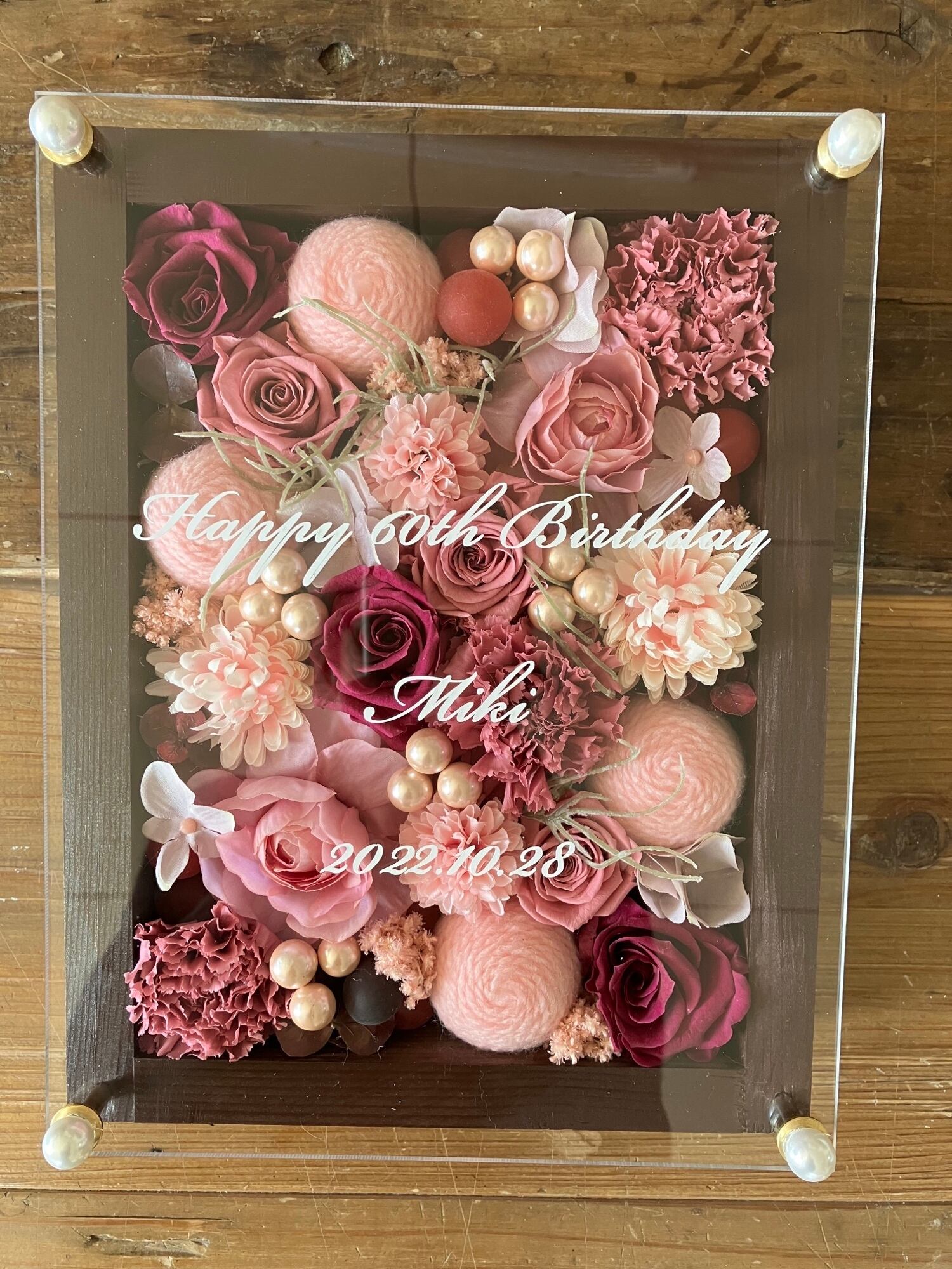 ウッドフレームにプリザーブドフラワーと造花をぎっしり詰め込み、アクリル板にはカッティングシートでメッセージをお入れします。