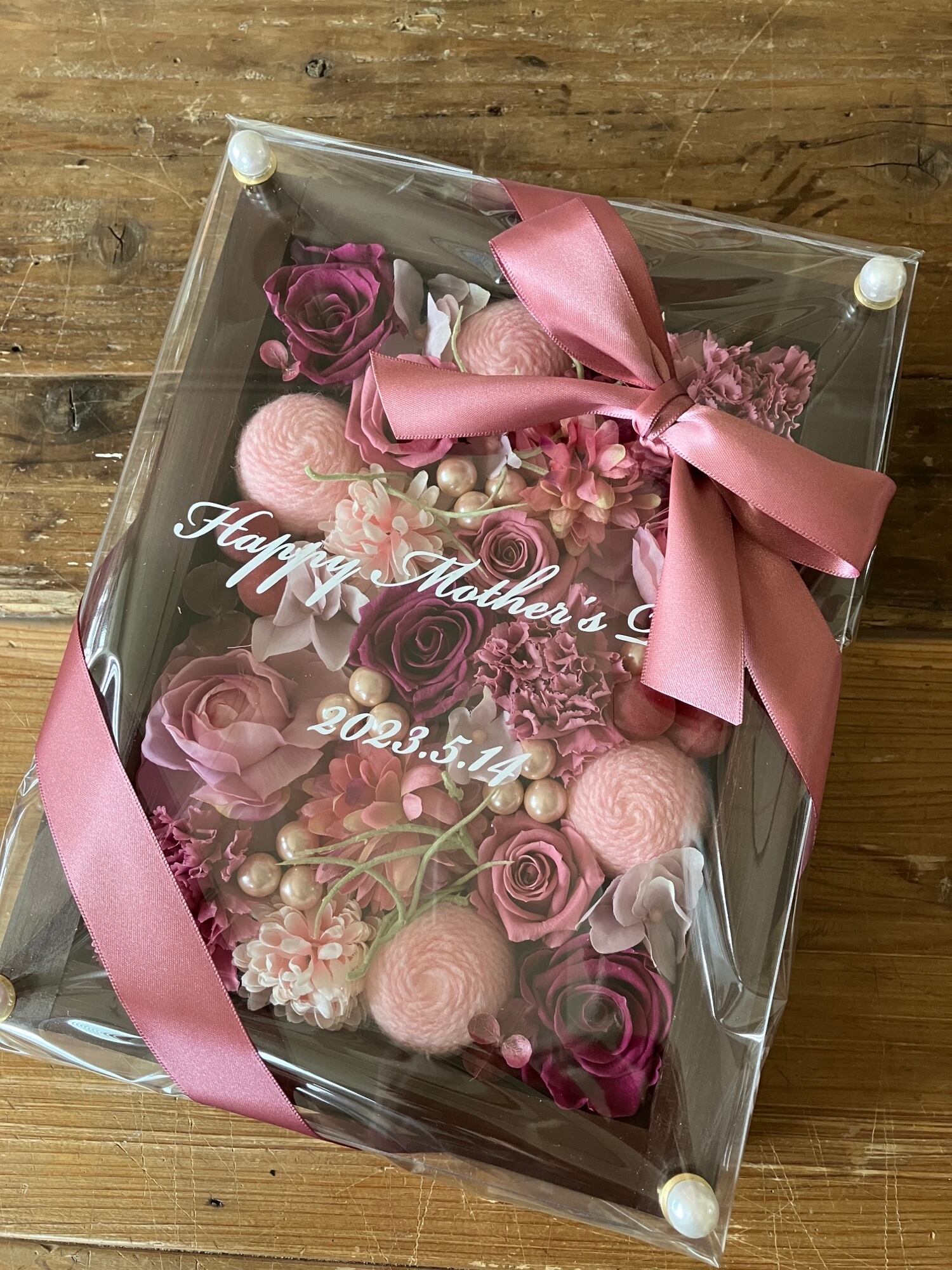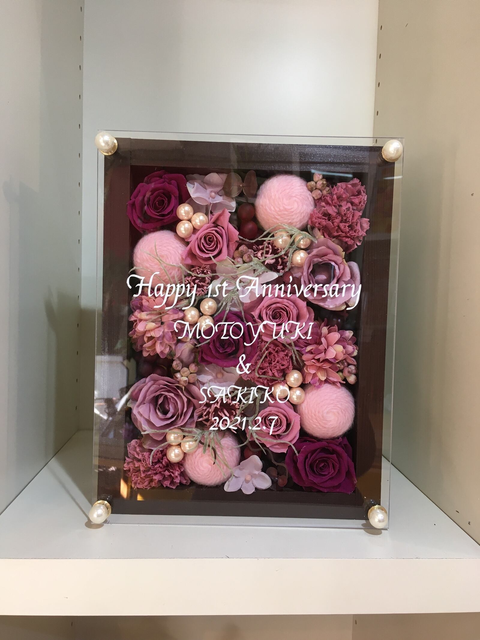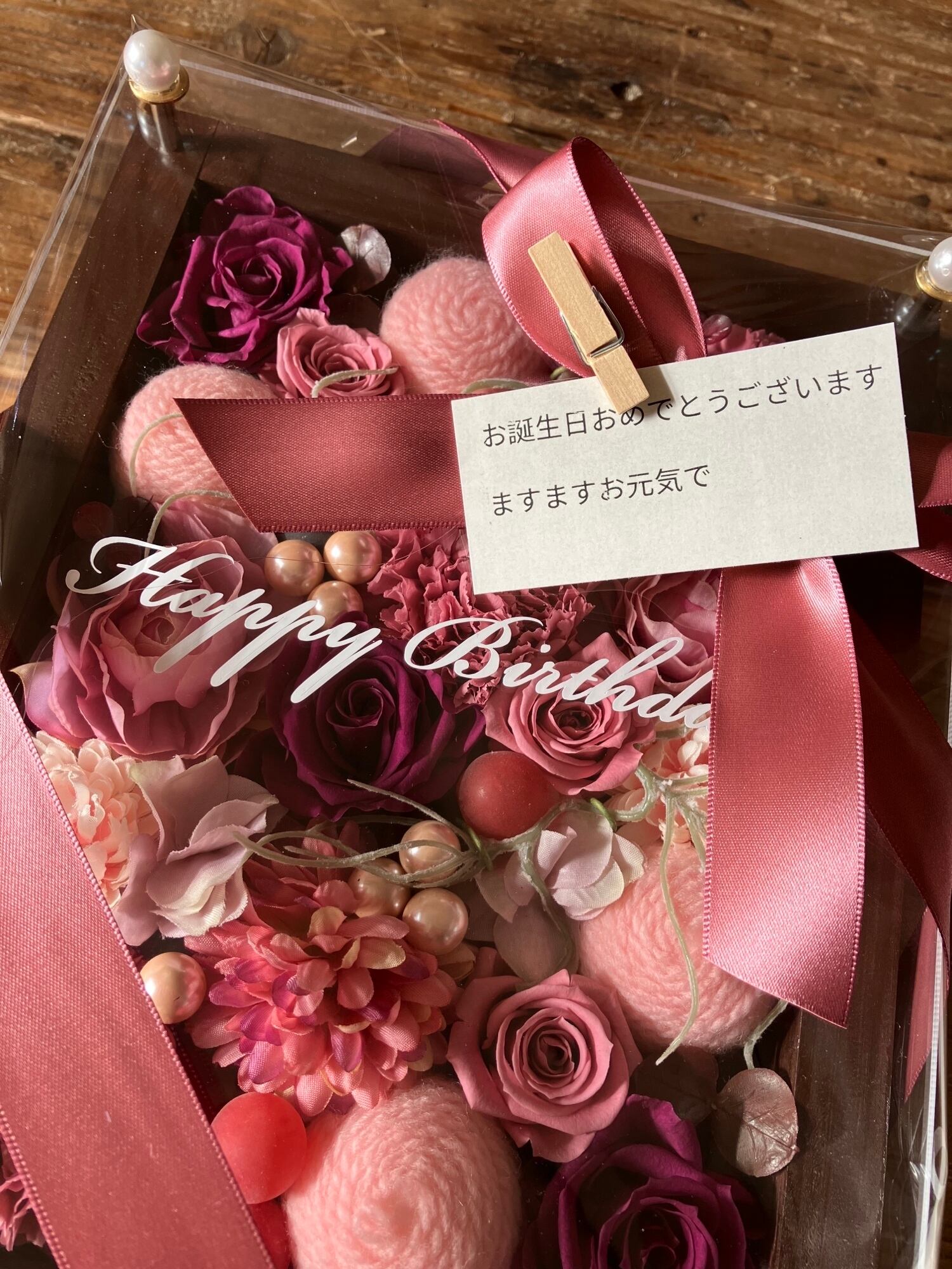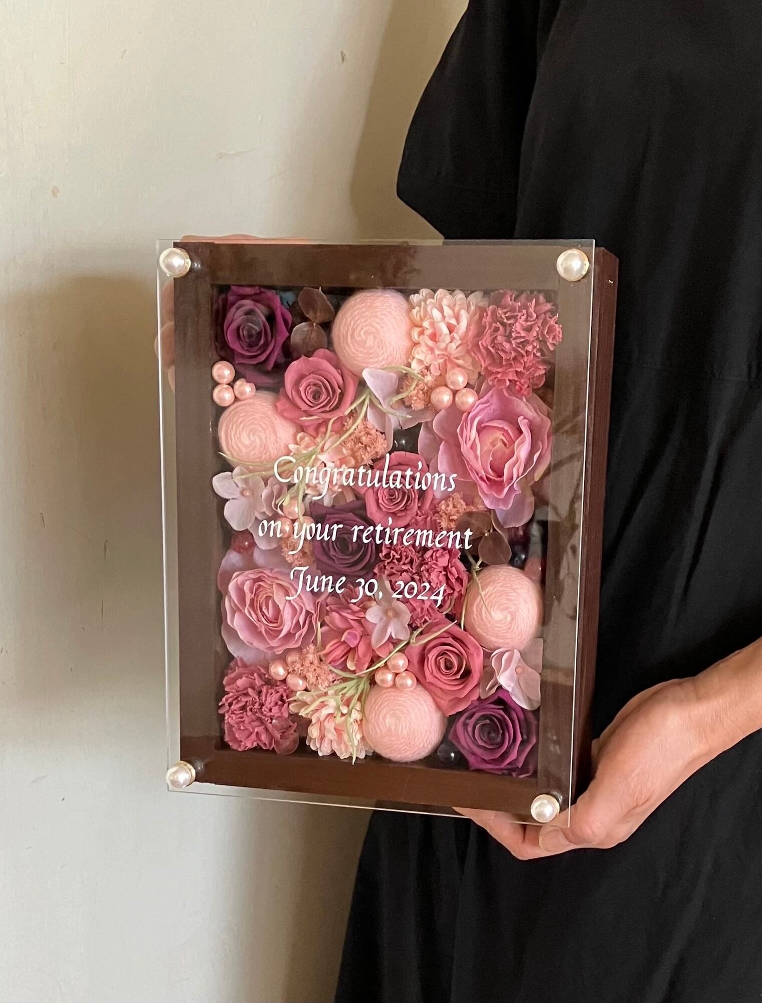 ウッドフレームにプリザーブドフラワーと造花をぎっしり詰め込み、アクリル板にはカッティングシートでメッセージをお入れします。