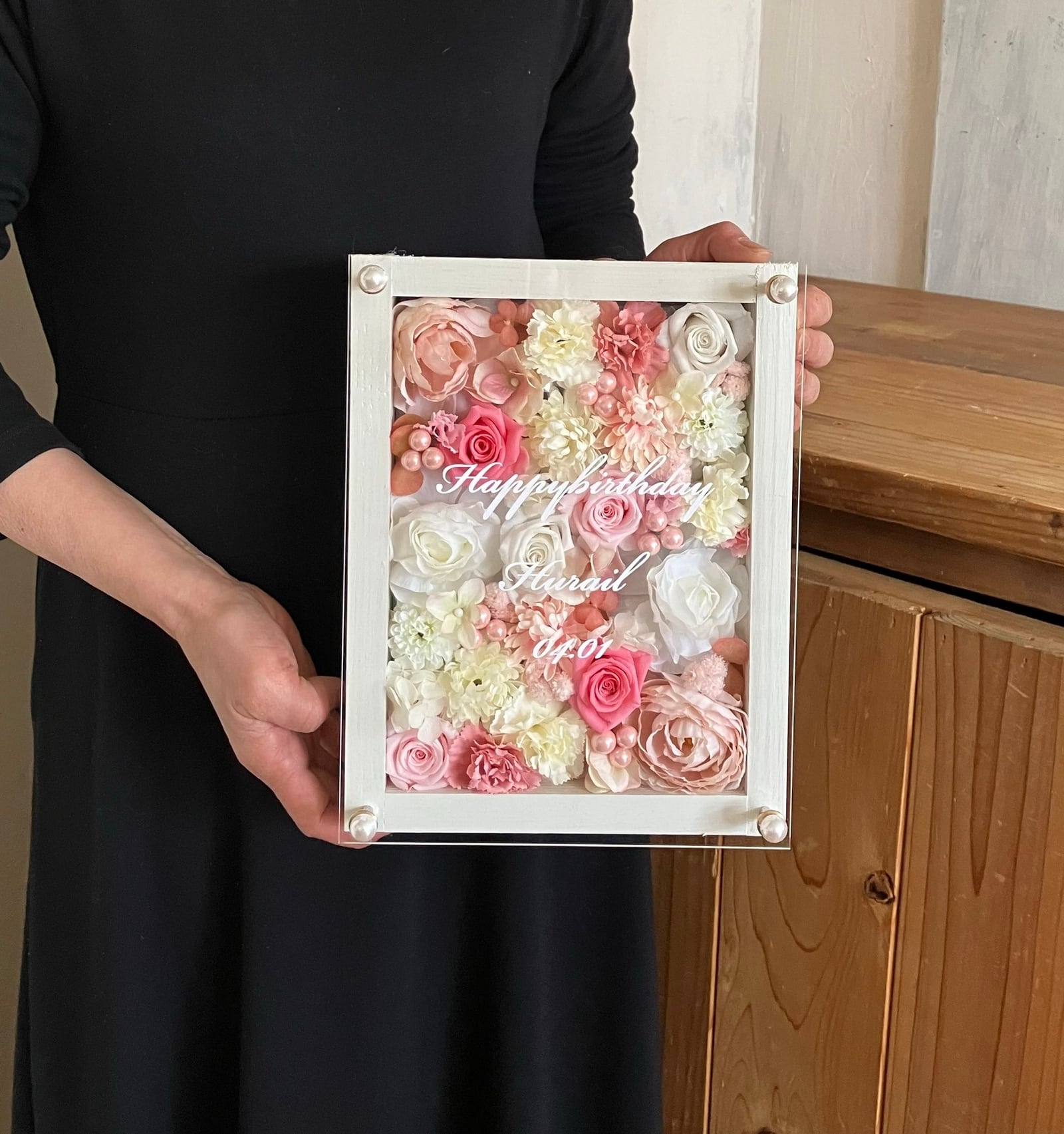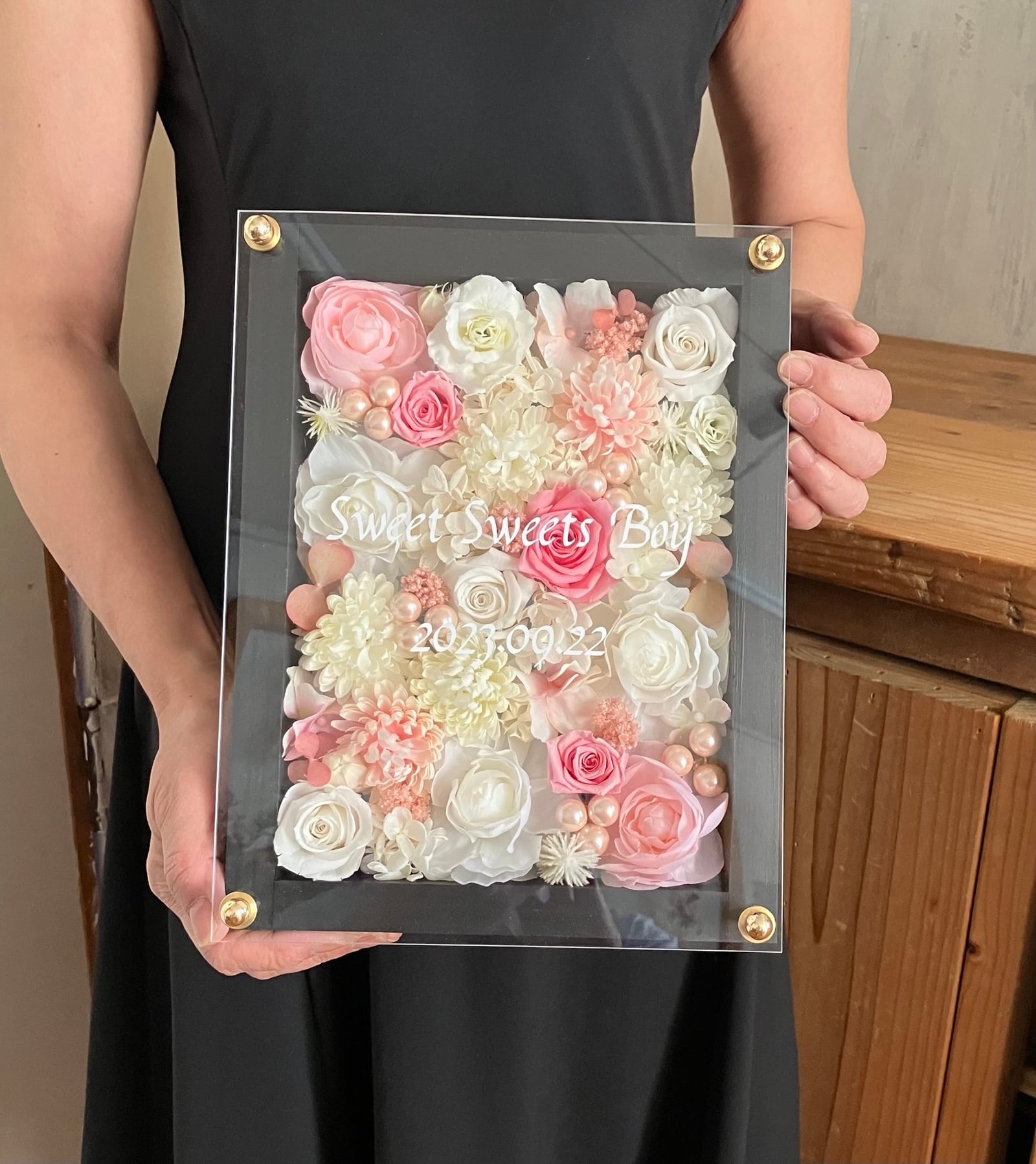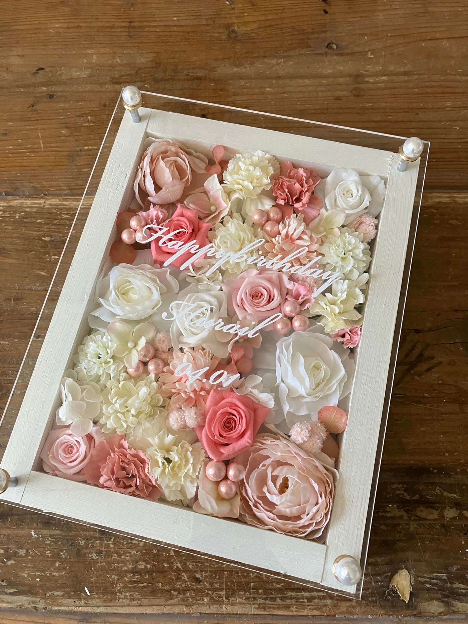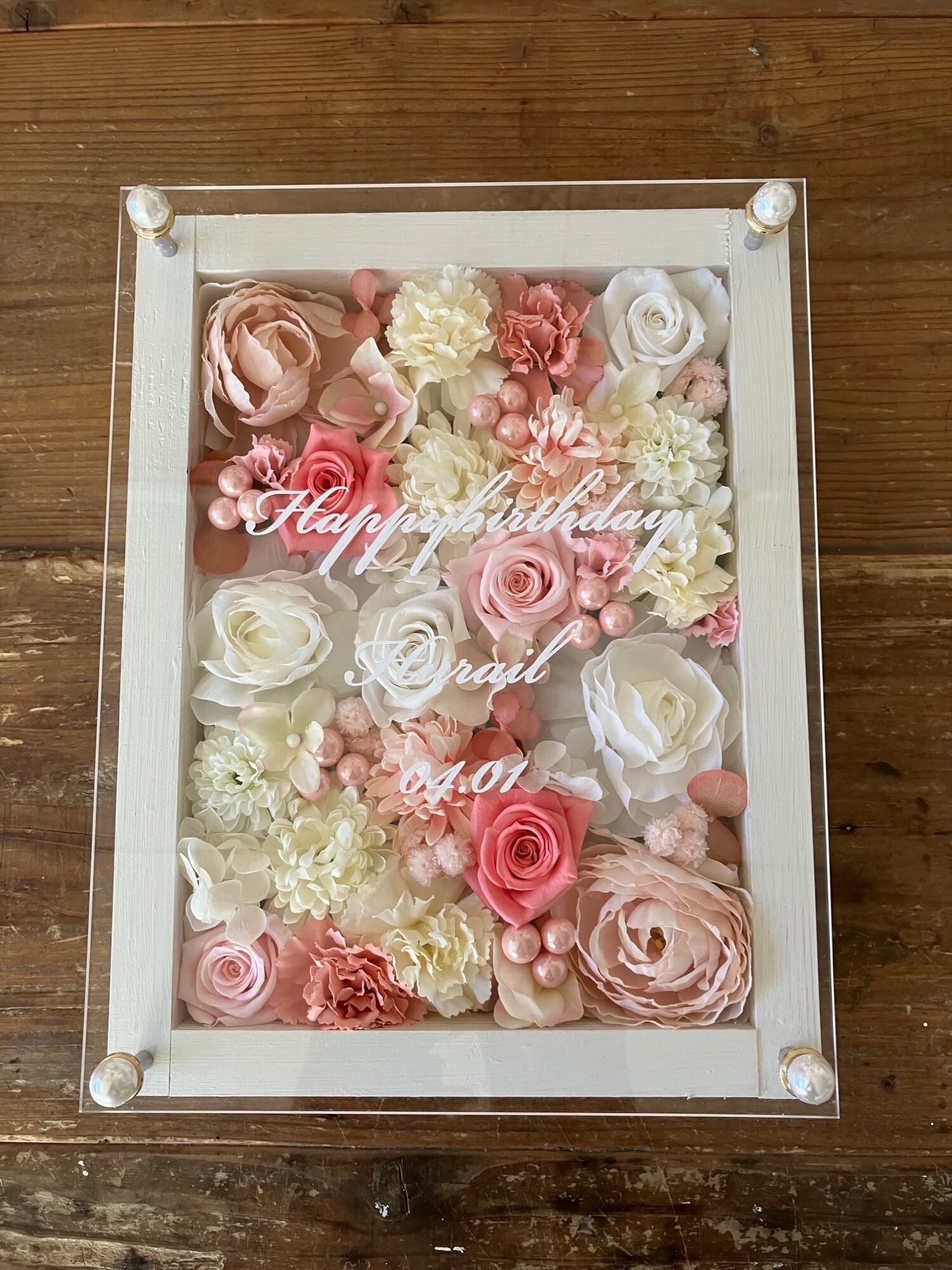 白色のウッドフレームにプリザーブドフラワーと造花をぎっしり詰め込み、アクリル板にはカッティングシートでメッセージをお入れします。