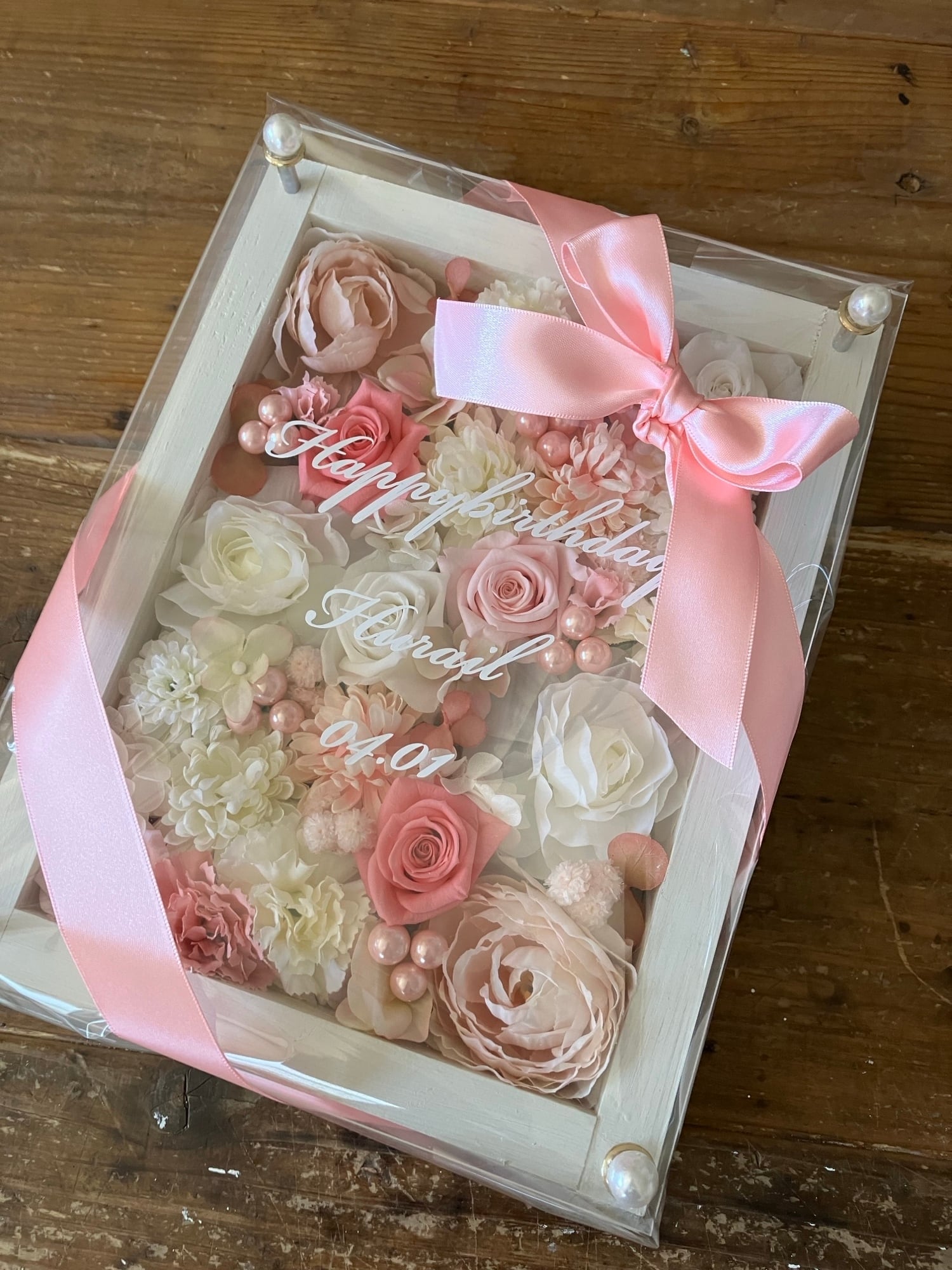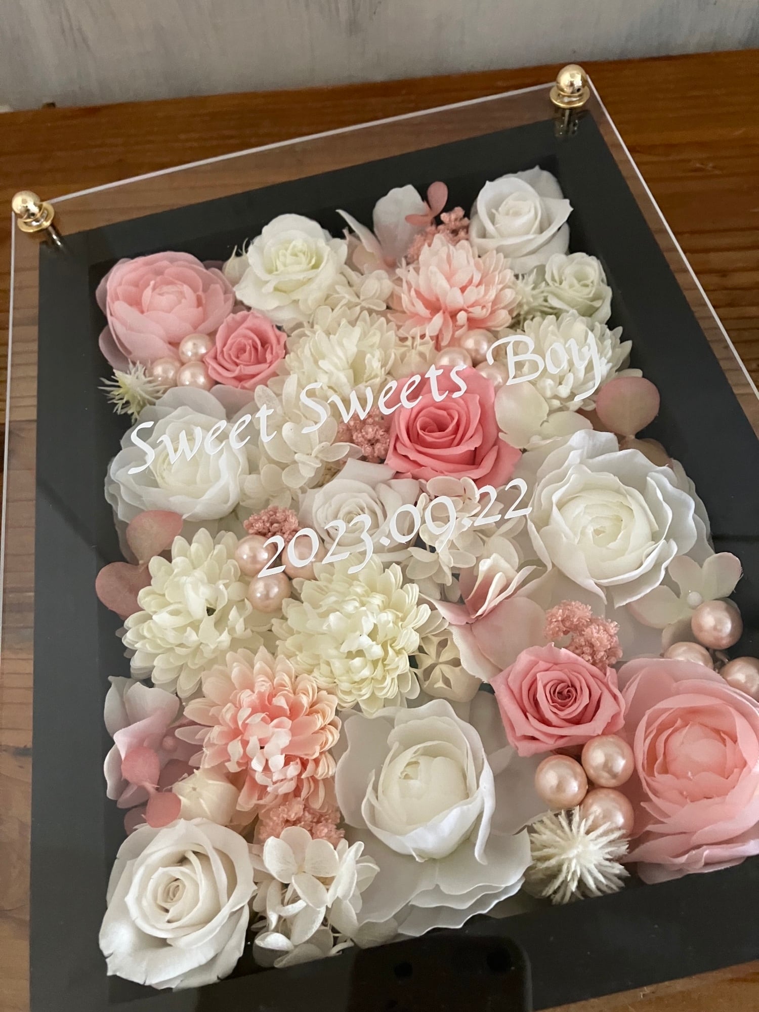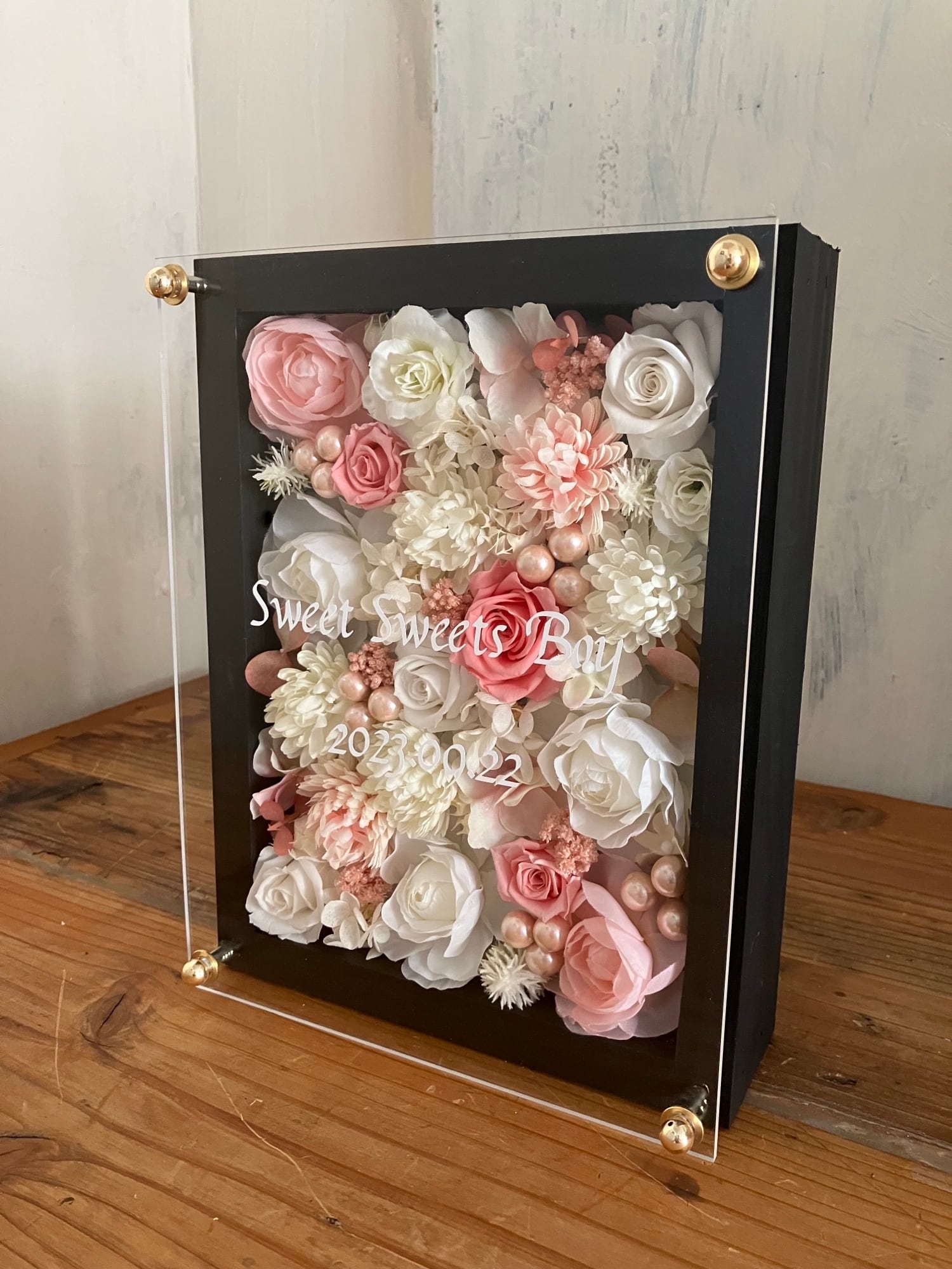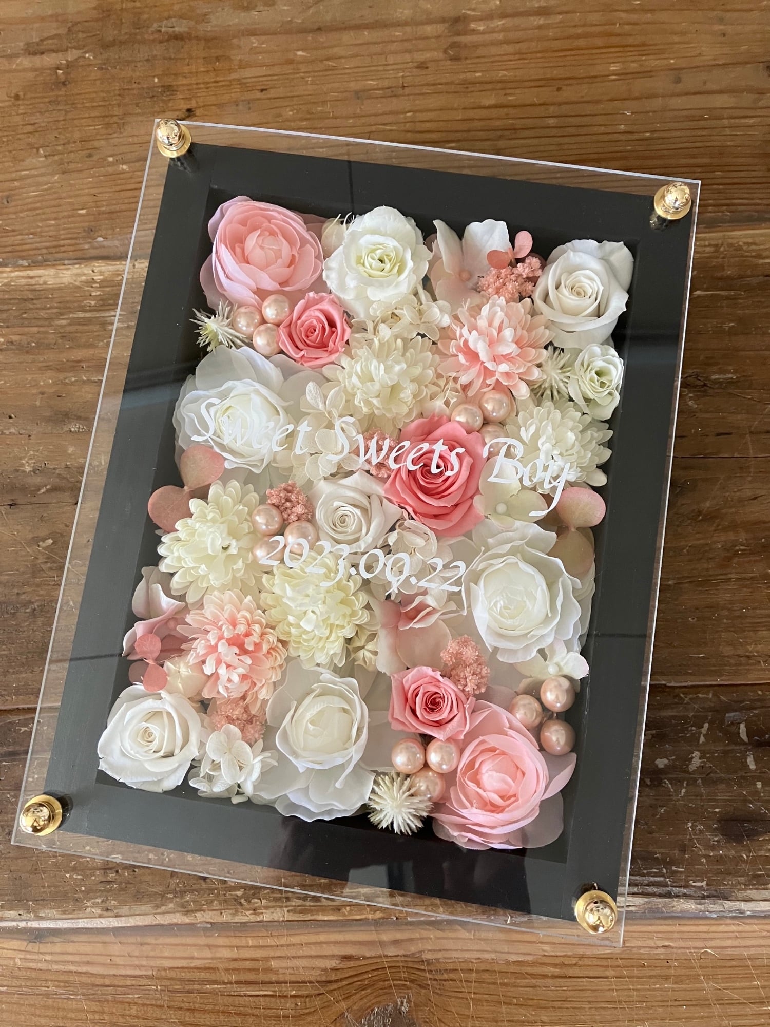 白色のウッドフレームにプリザーブドフラワーと造花をぎっしり詰め込み、アクリル板にはカッティングシートでメッセージをお入れします。