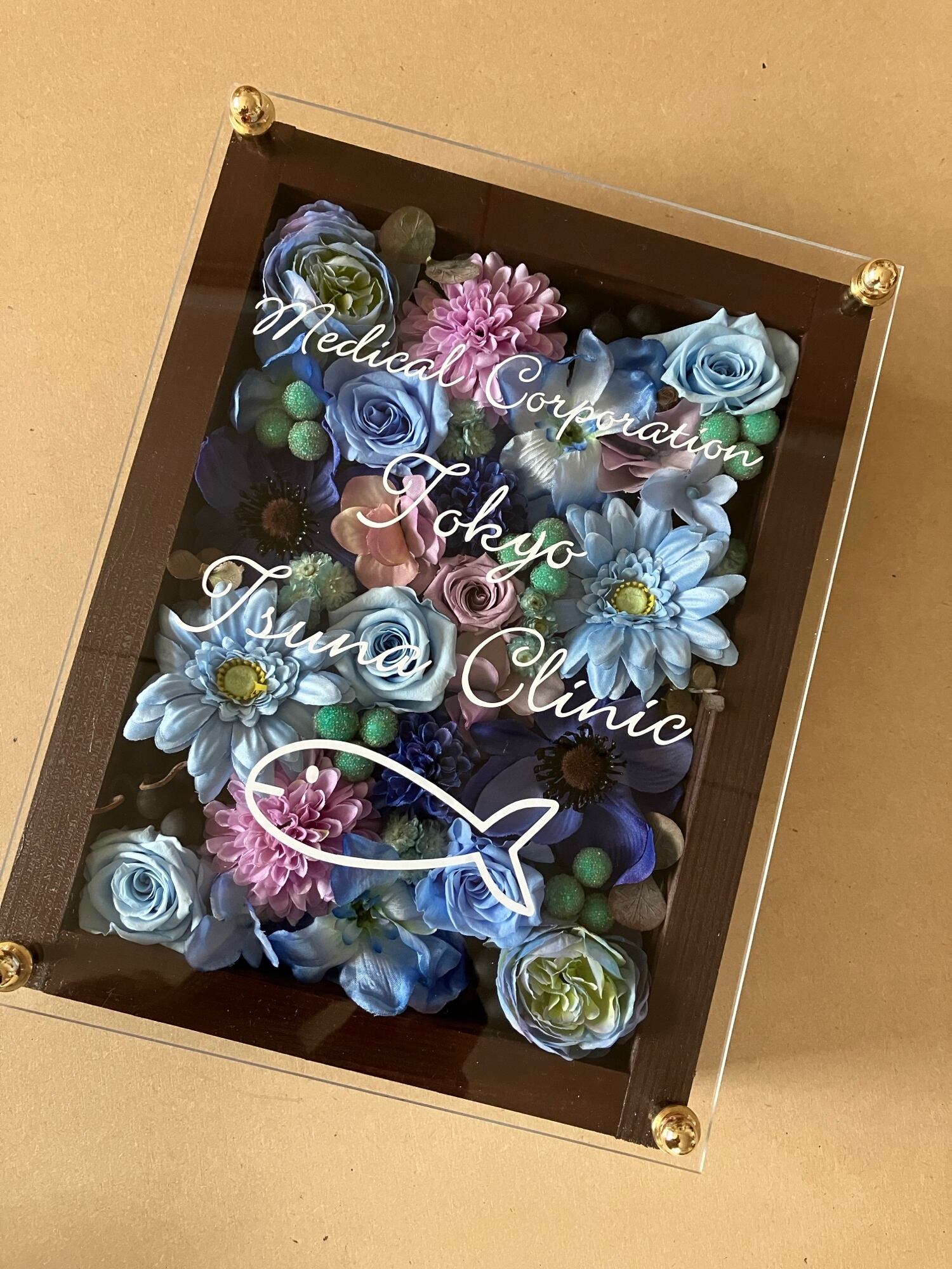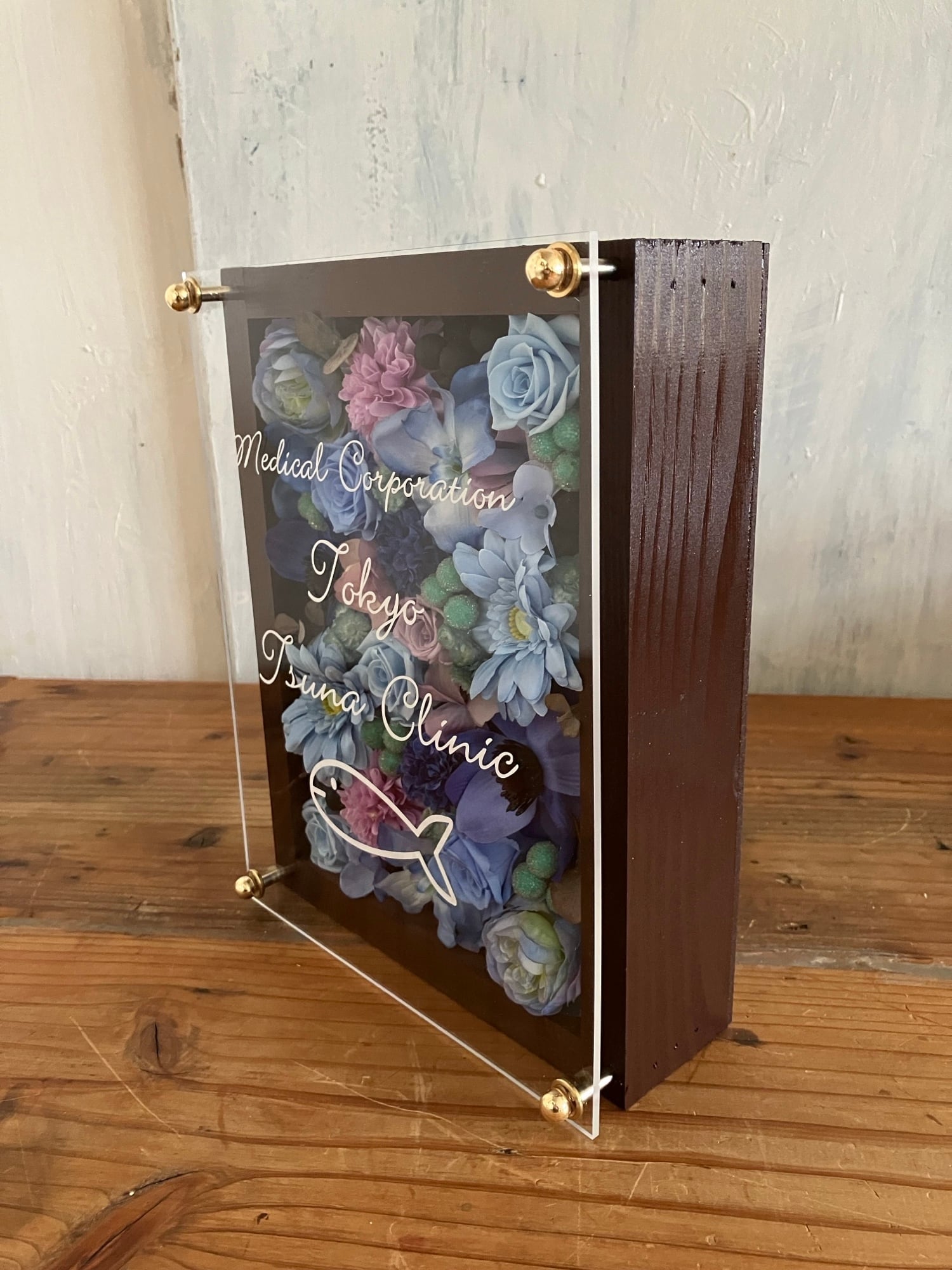 黒色のウッドフレームにプリザーブドフラワーと造花をぎっしり詰め込みアクリル板にはカッティングシートでメッセージをお入れします。