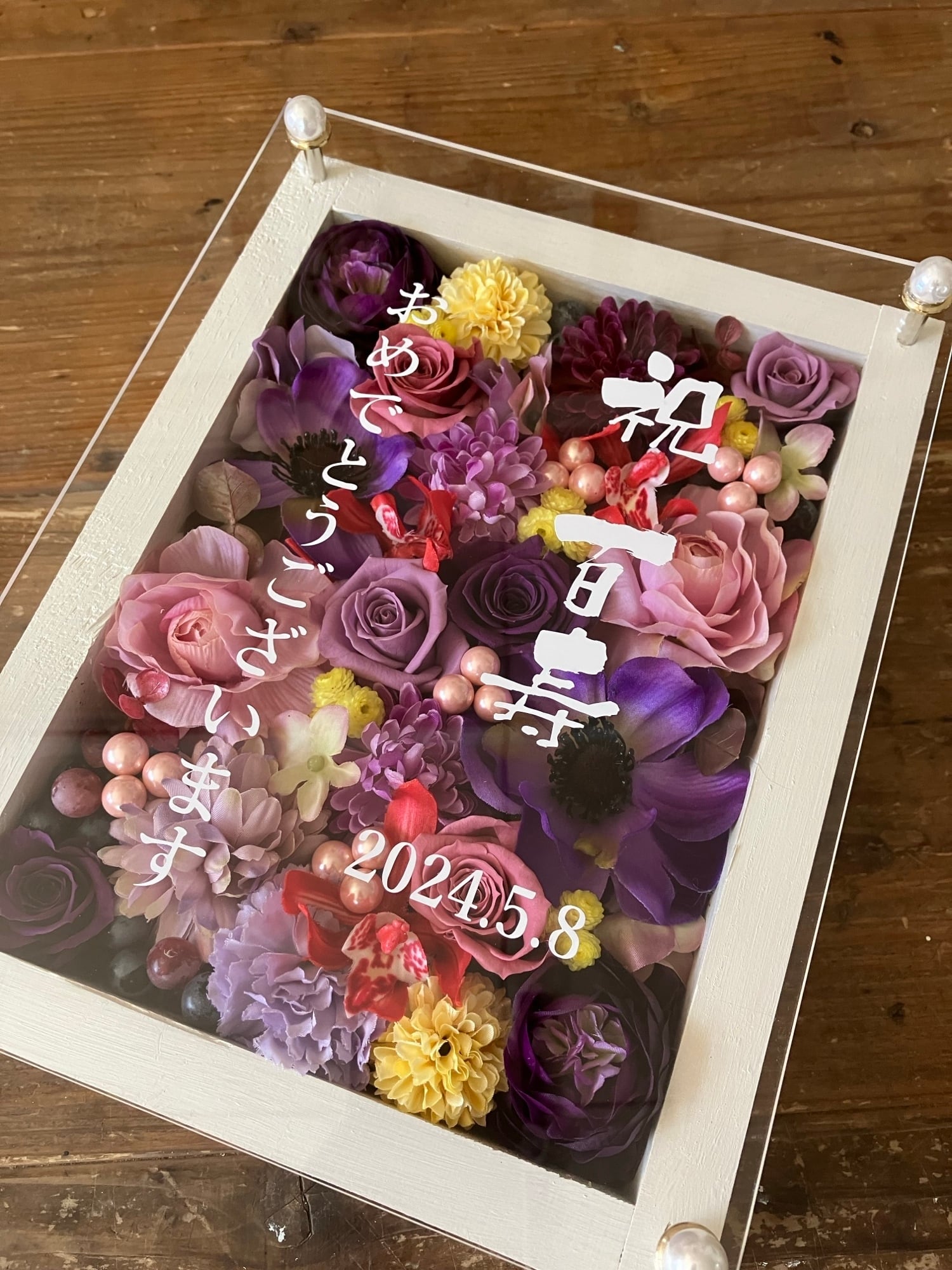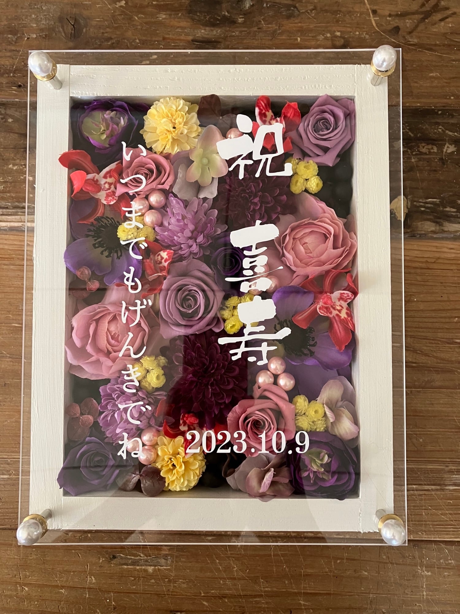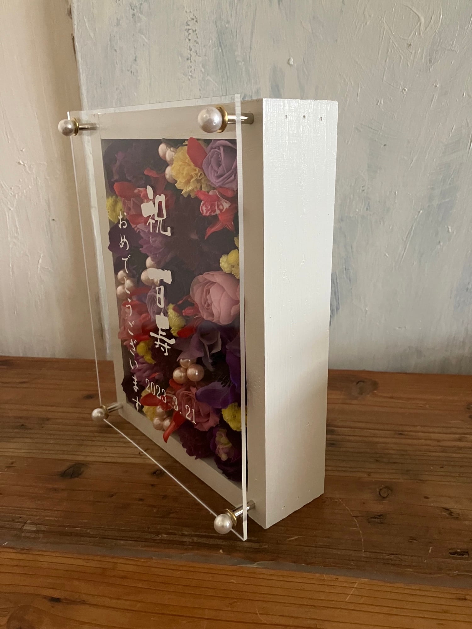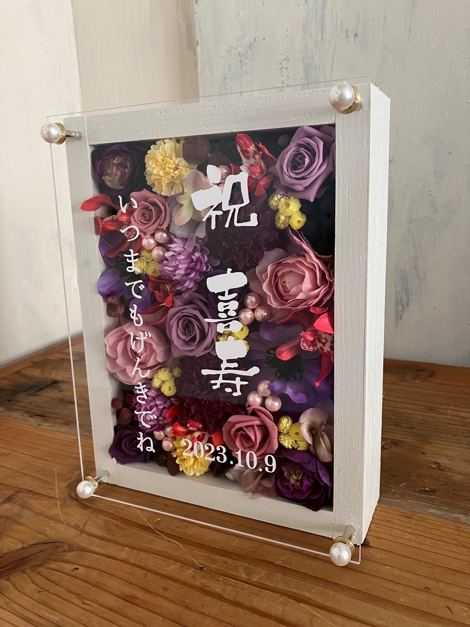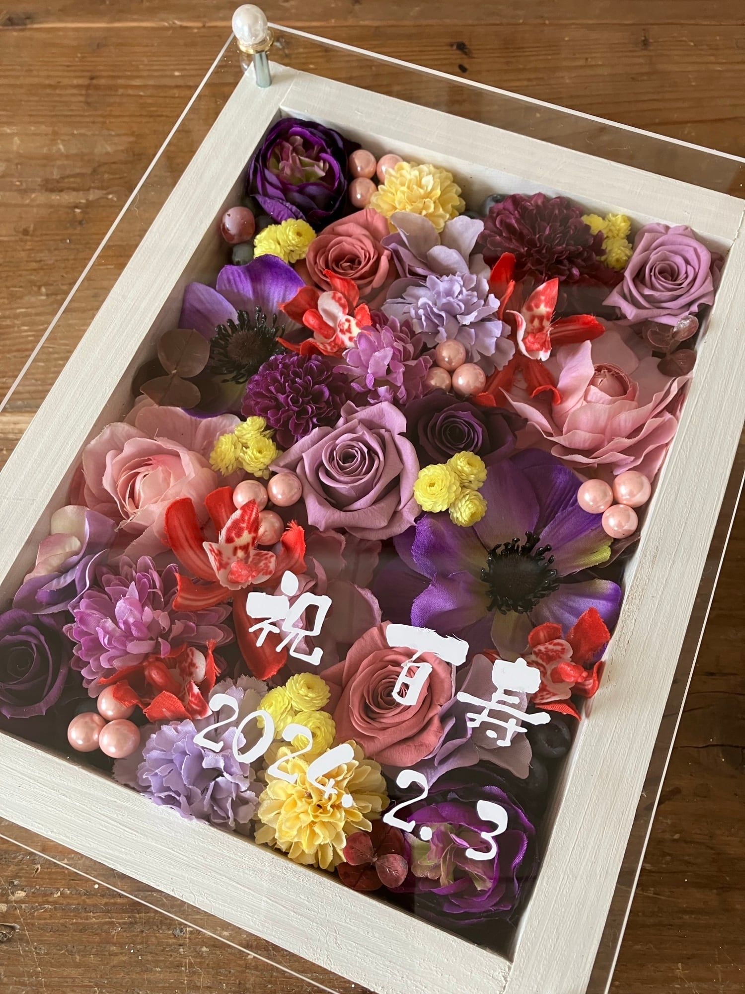 白色のウッドフレームにプリザーブドフラワーと造花をぎっしり詰め込み、アクリル板にはカッティングシートでメッセージをお入れします。