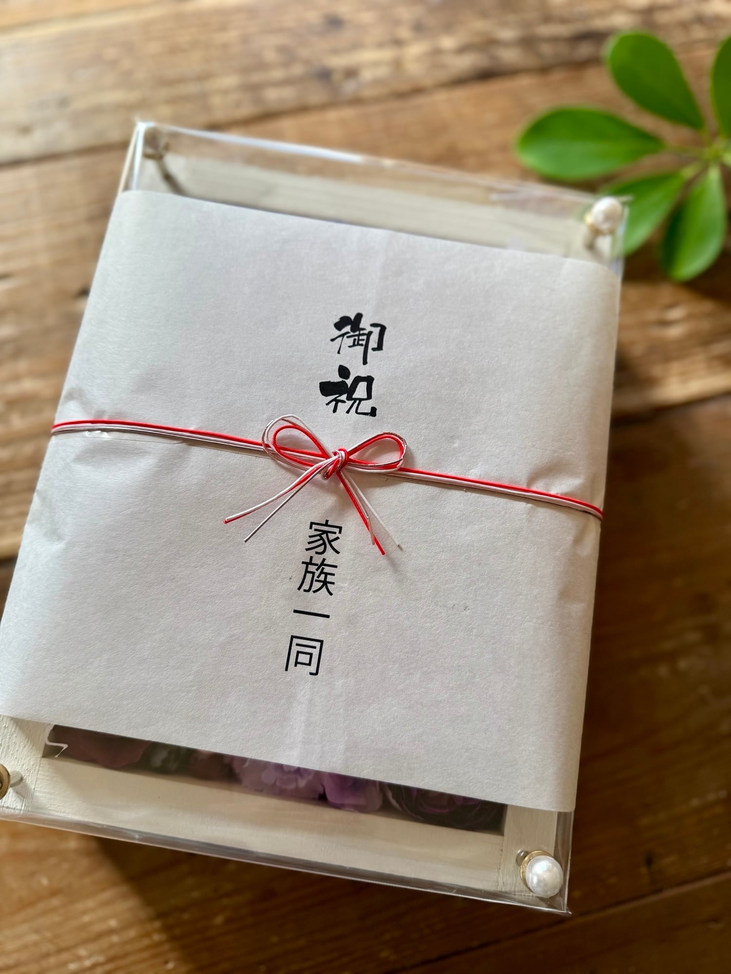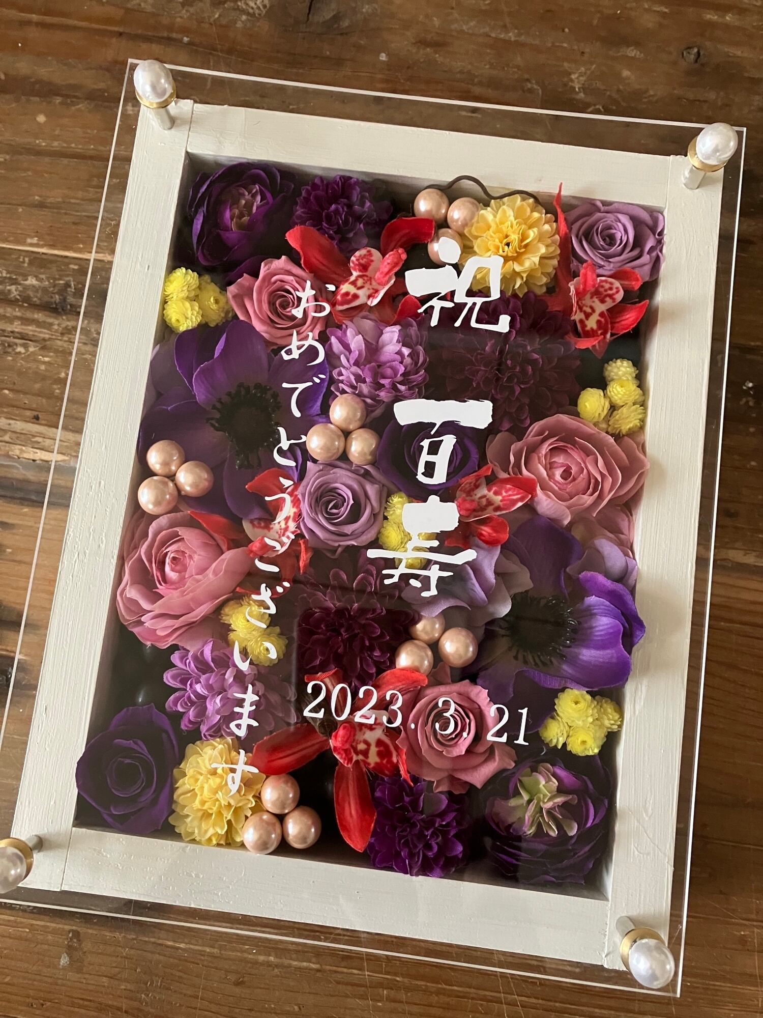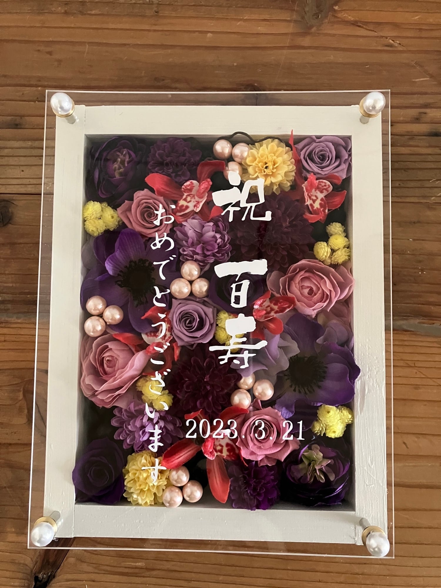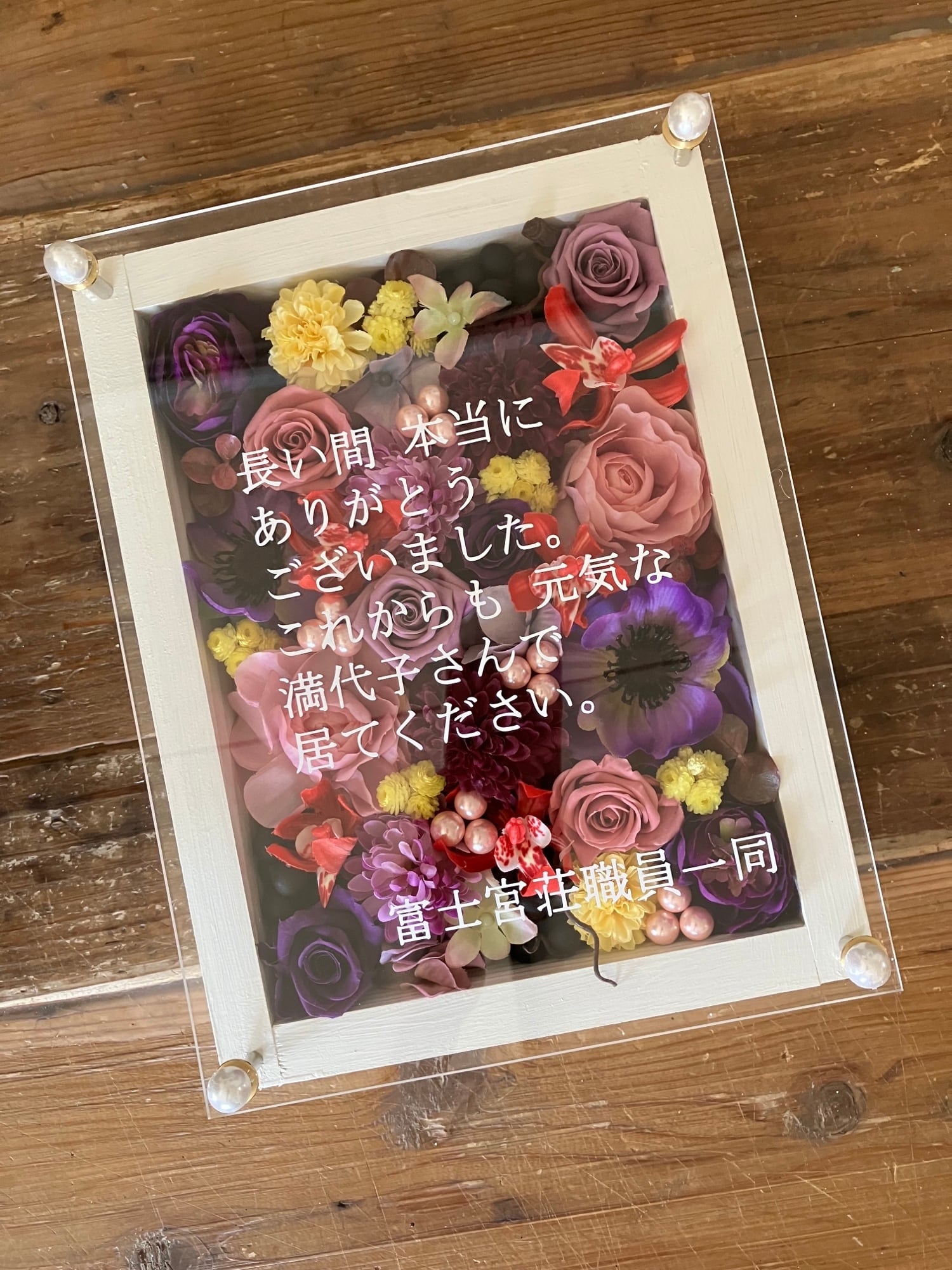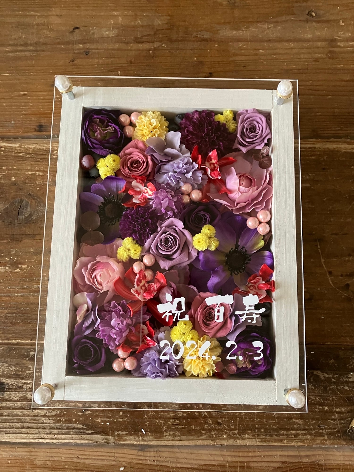 白色のウッドフレームにプリザーブドフラワーと造花をぎっしり詰め込み、アクリル板にはカッティングシートでメッセージをお入れします。
