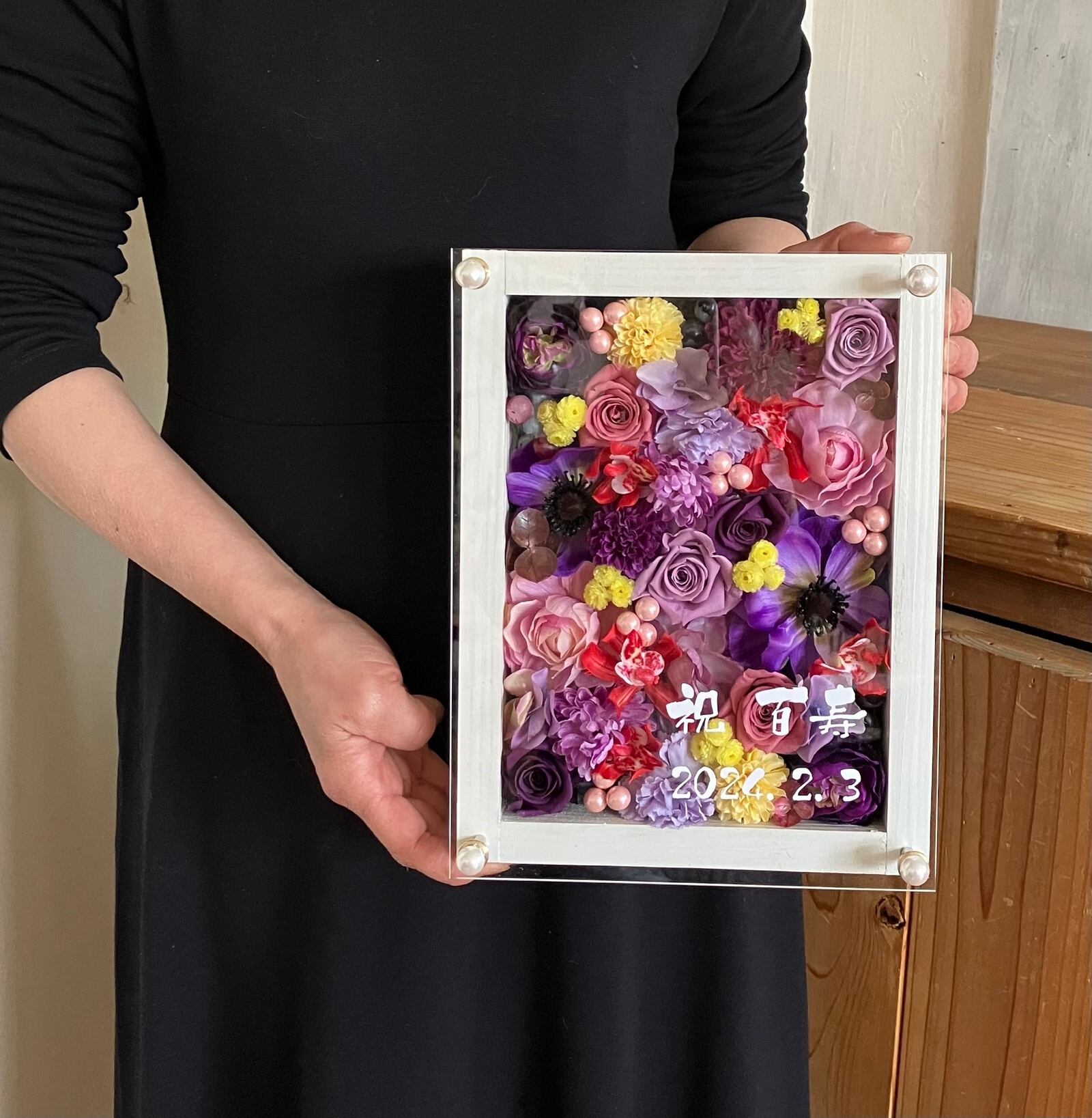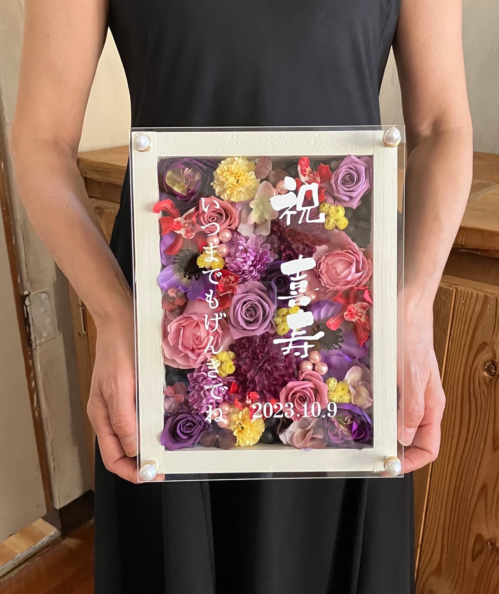 喜寿祝い・百寿祝い・退職祝い【名入れ】プリザーブドフラワーアレンジ ウッドフレーム 白木枠〈パープル赤イエロー〉