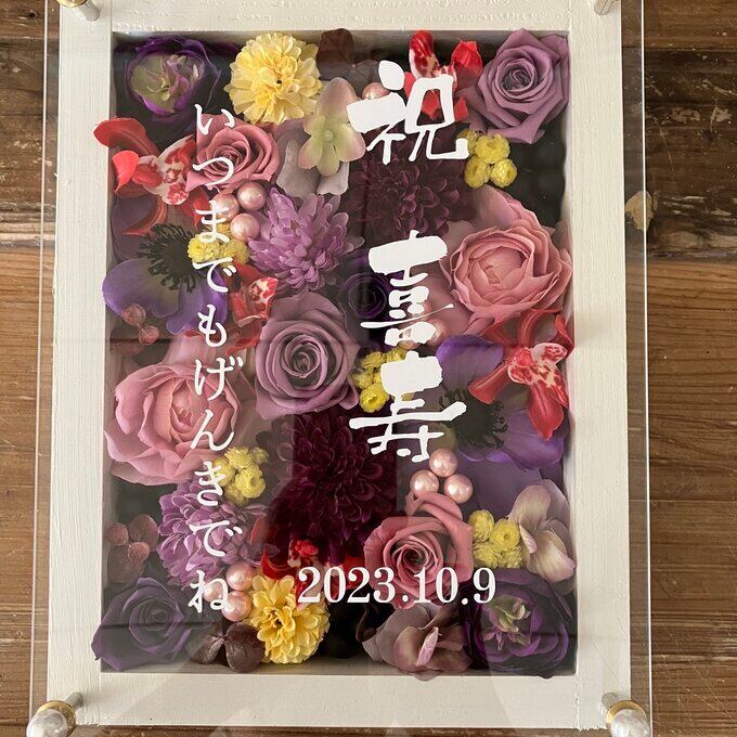 優雅で華やかなパープル、赤、イエローの花々を木枠にアレンジし、
