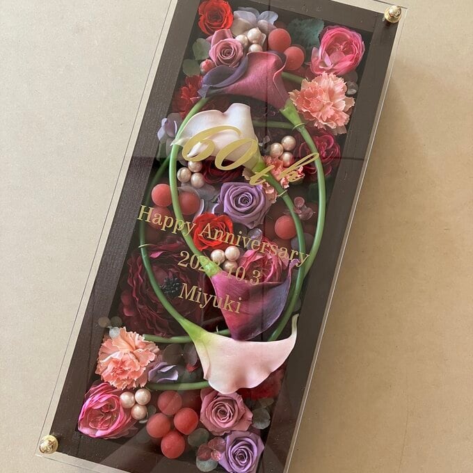 豪華なプリザーブドフラワーアレンジ木枠ロング〈ボルドー〉。