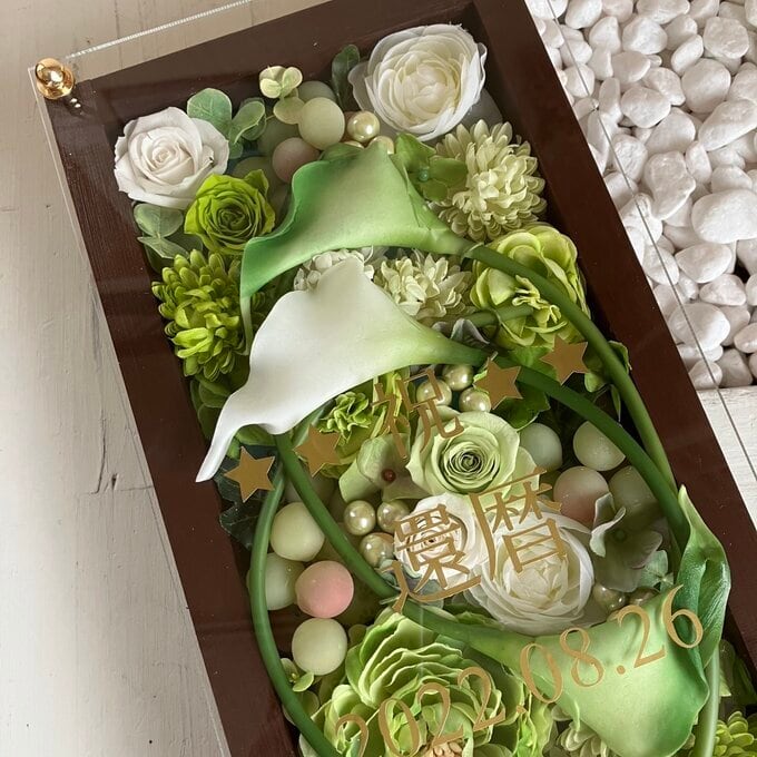 ※プリザーブドフラワーアレンジは、直射日光や高温多湿を避けて展示してください。木枠による製品特有のクタリ感がある場合がございます。予めご了承ください。