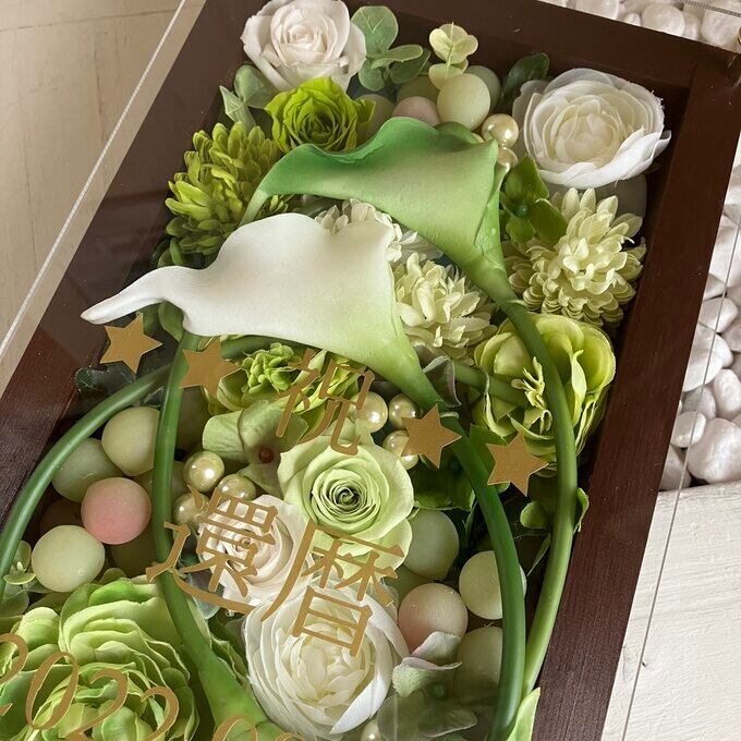 白とグリーンの爽やかな色合いで、どんなお祝いの場にもぴったりです。