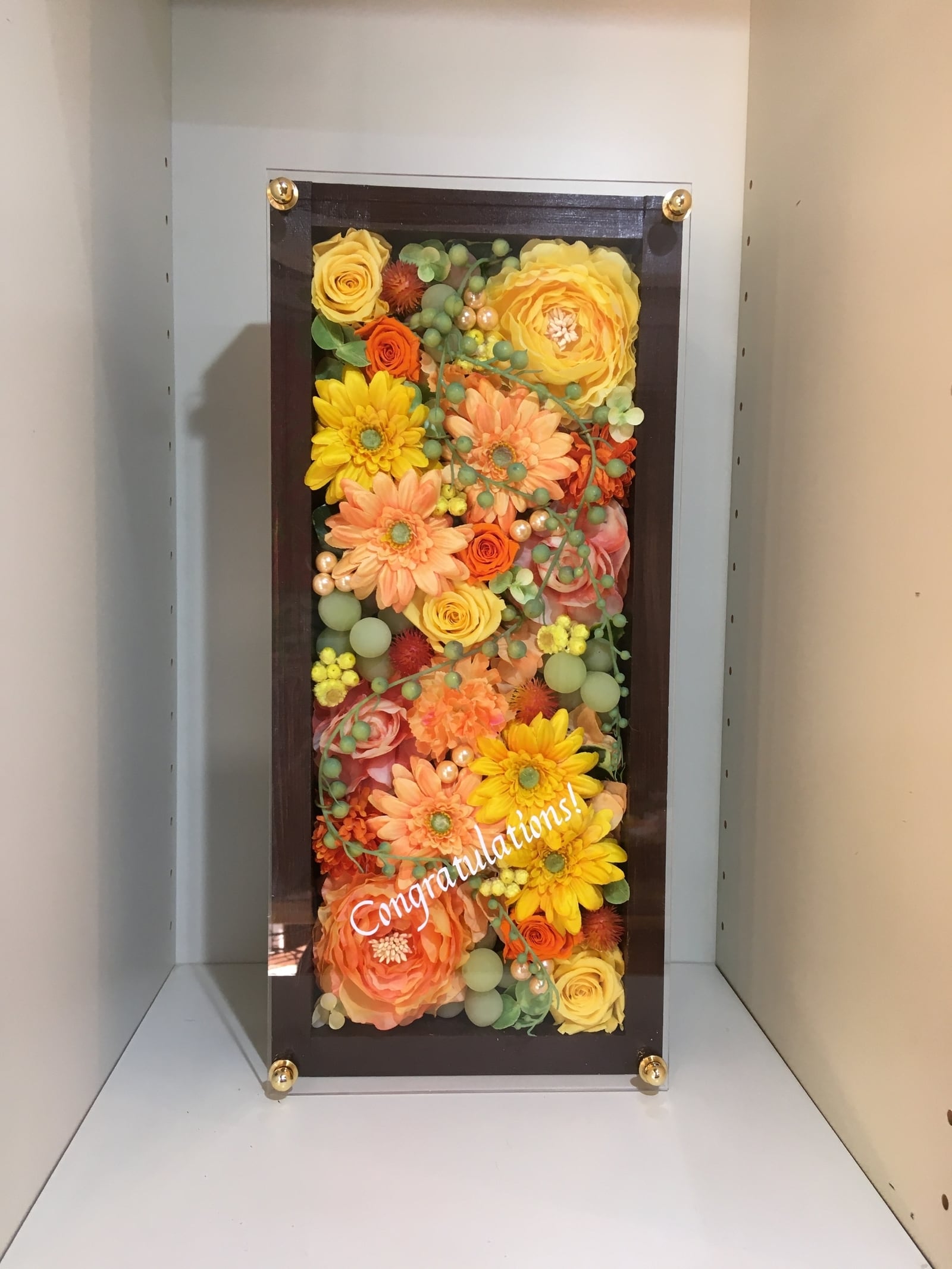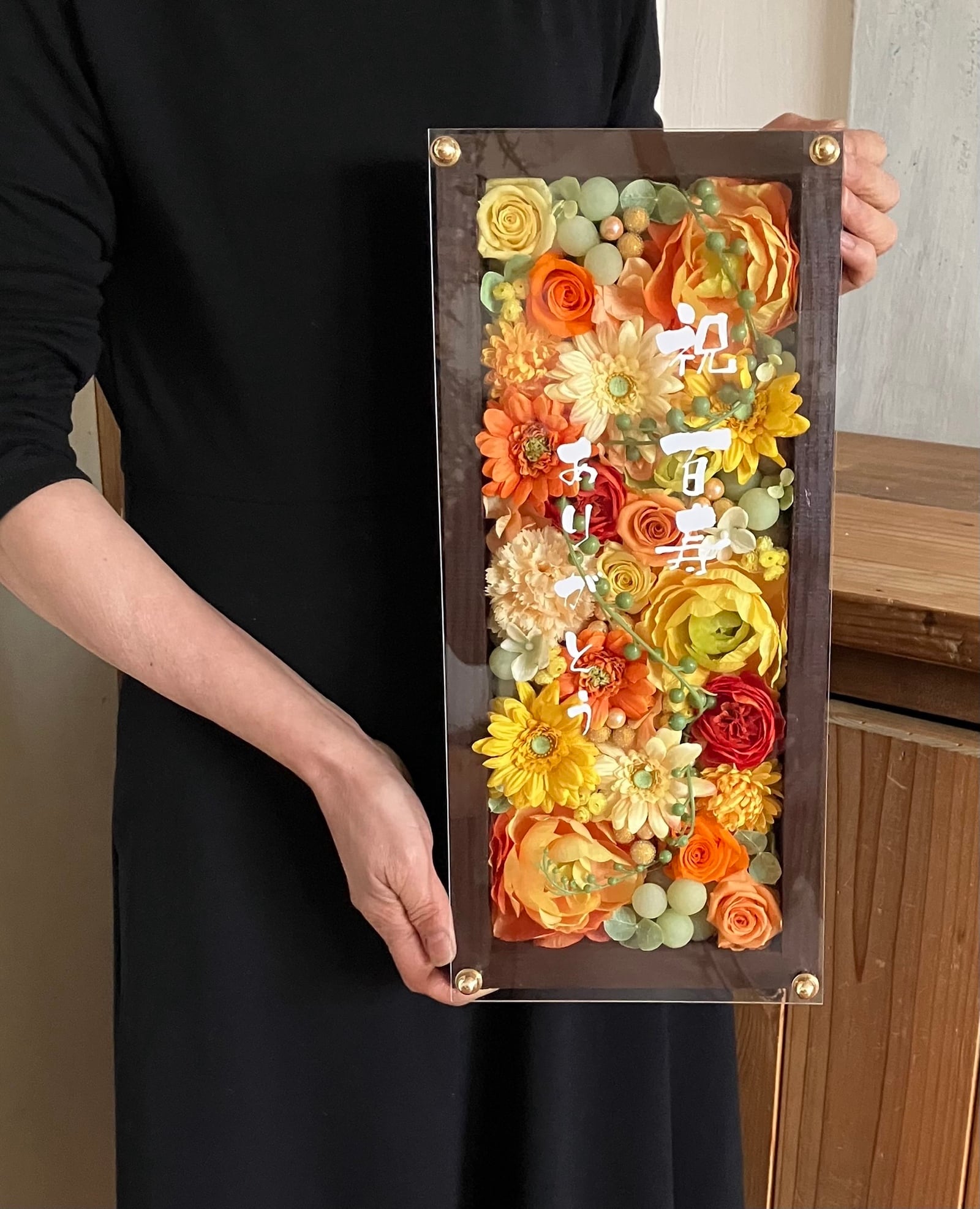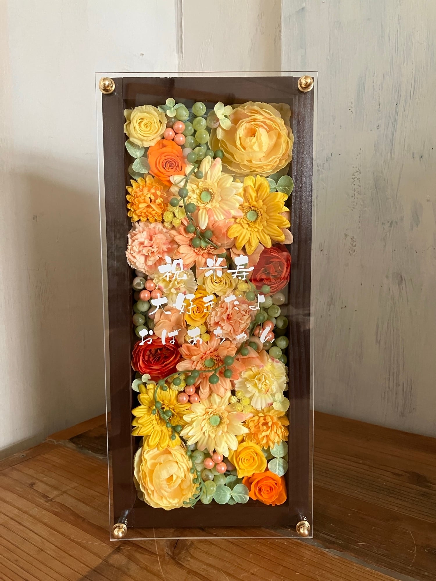 開店祝い・米寿祝い・百寿祝い・周年祝い【名入れ】プリザーブドフラワーアレンジ ウッドフレーム ロング木枠〈イエローオレンジ〉