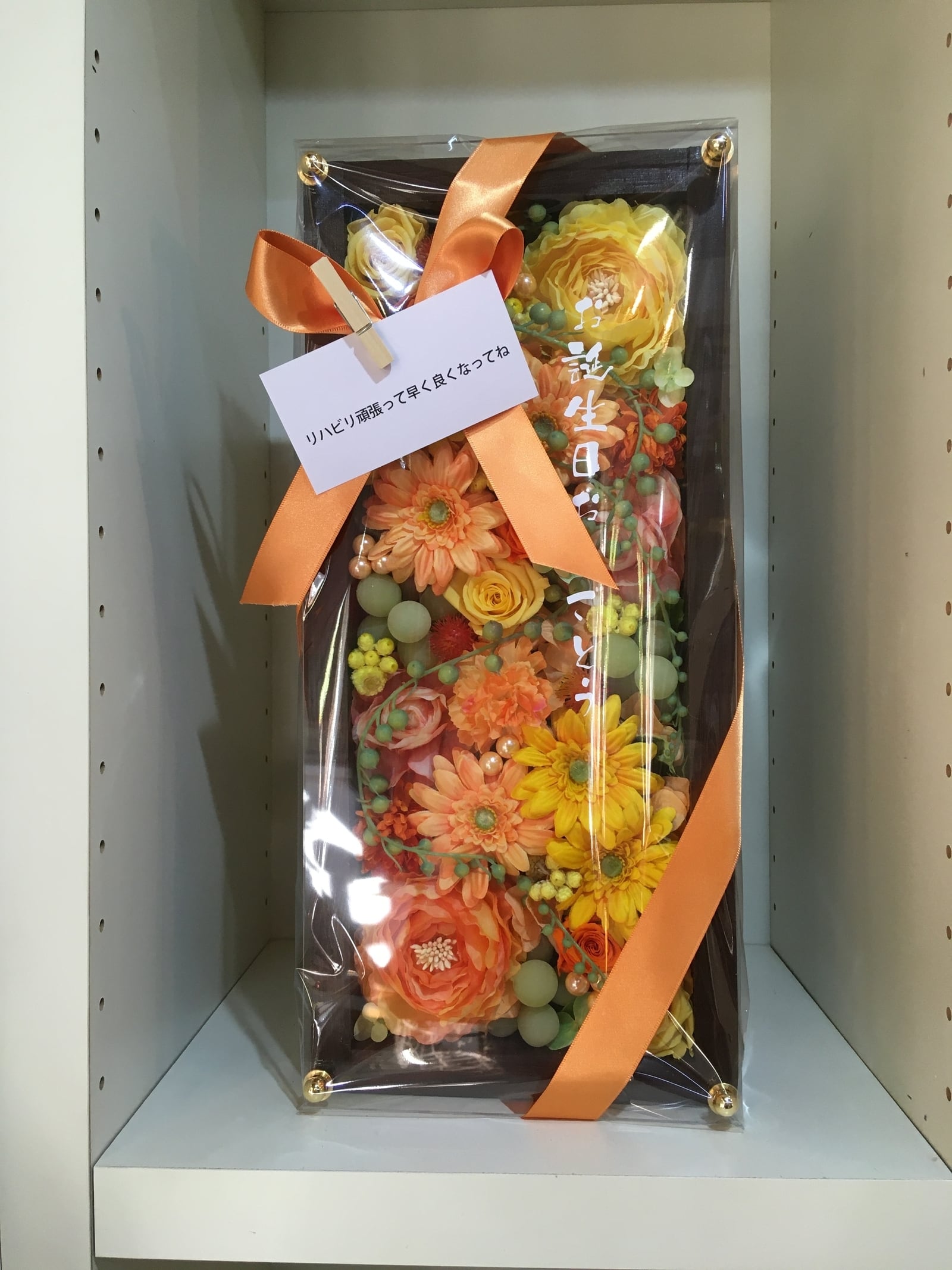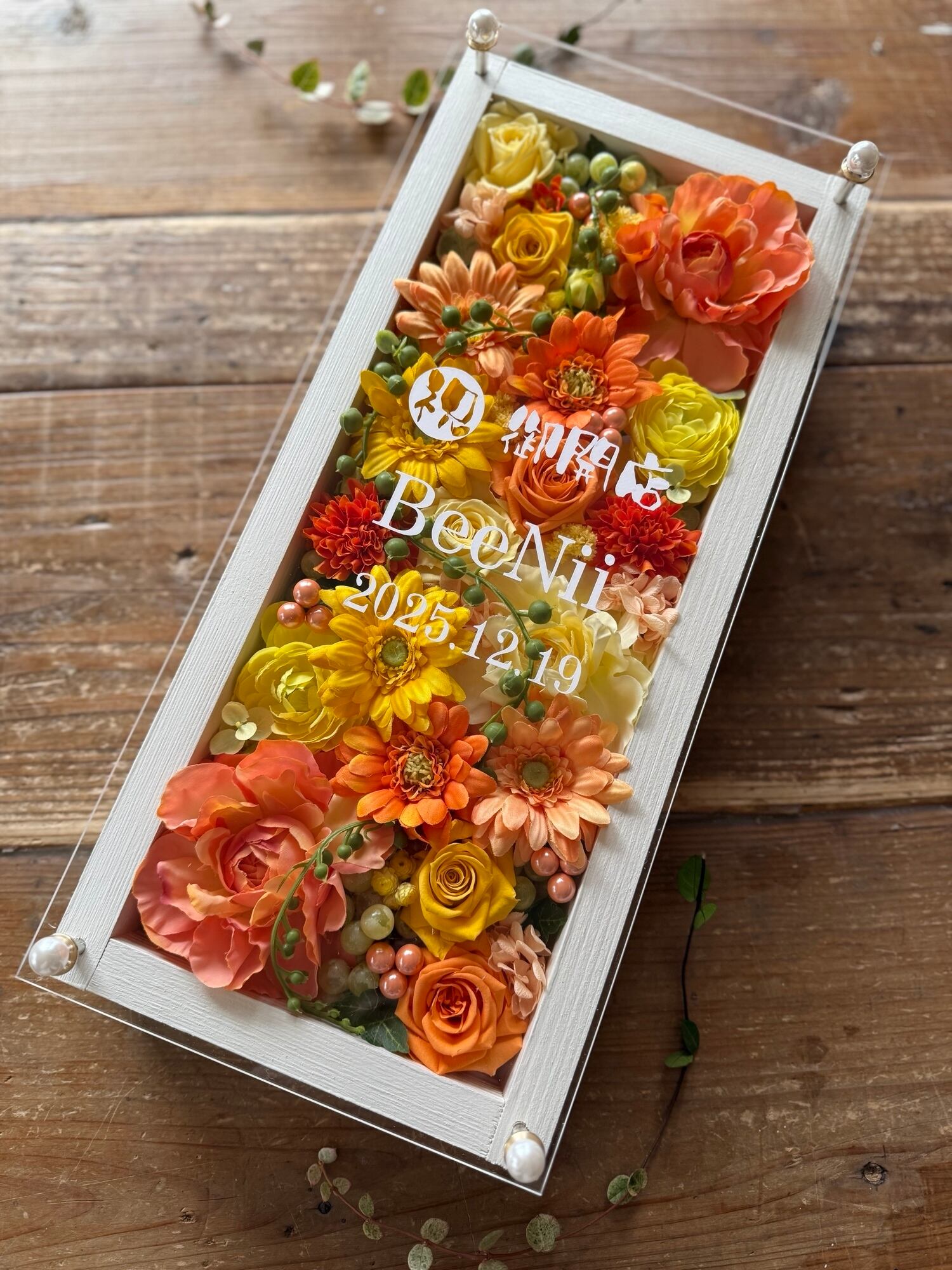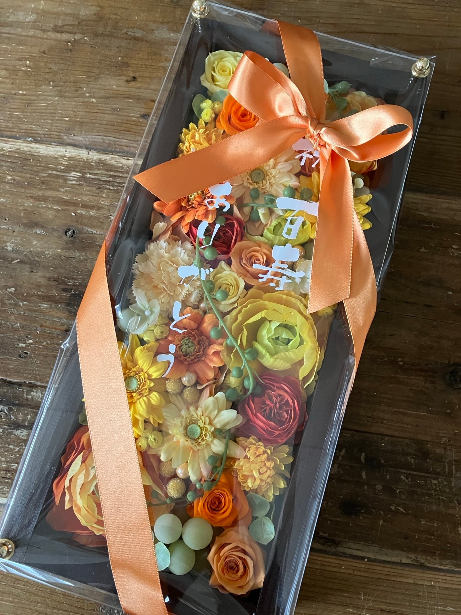開店祝い・米寿祝い・百寿祝い・周年祝い【名入れ】プリザーブドフラワーアレンジ ウッドフレーム ロング木枠〈イエローオレンジ〉
