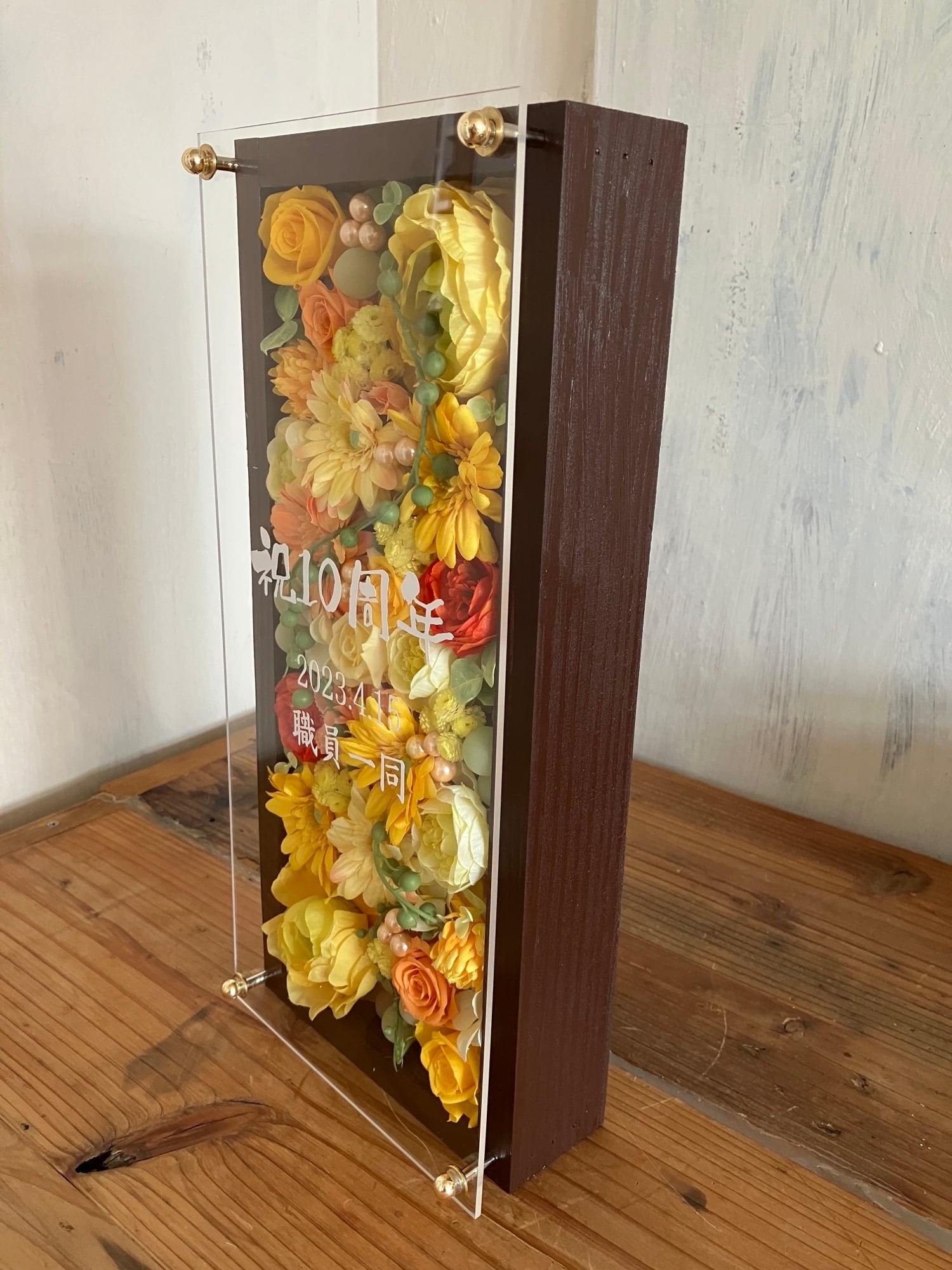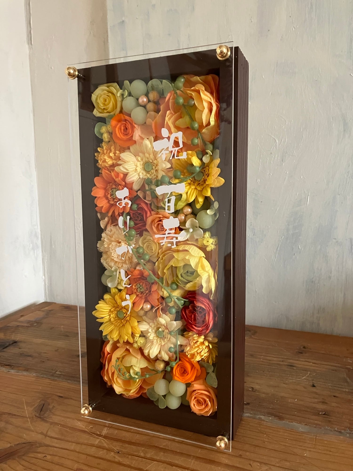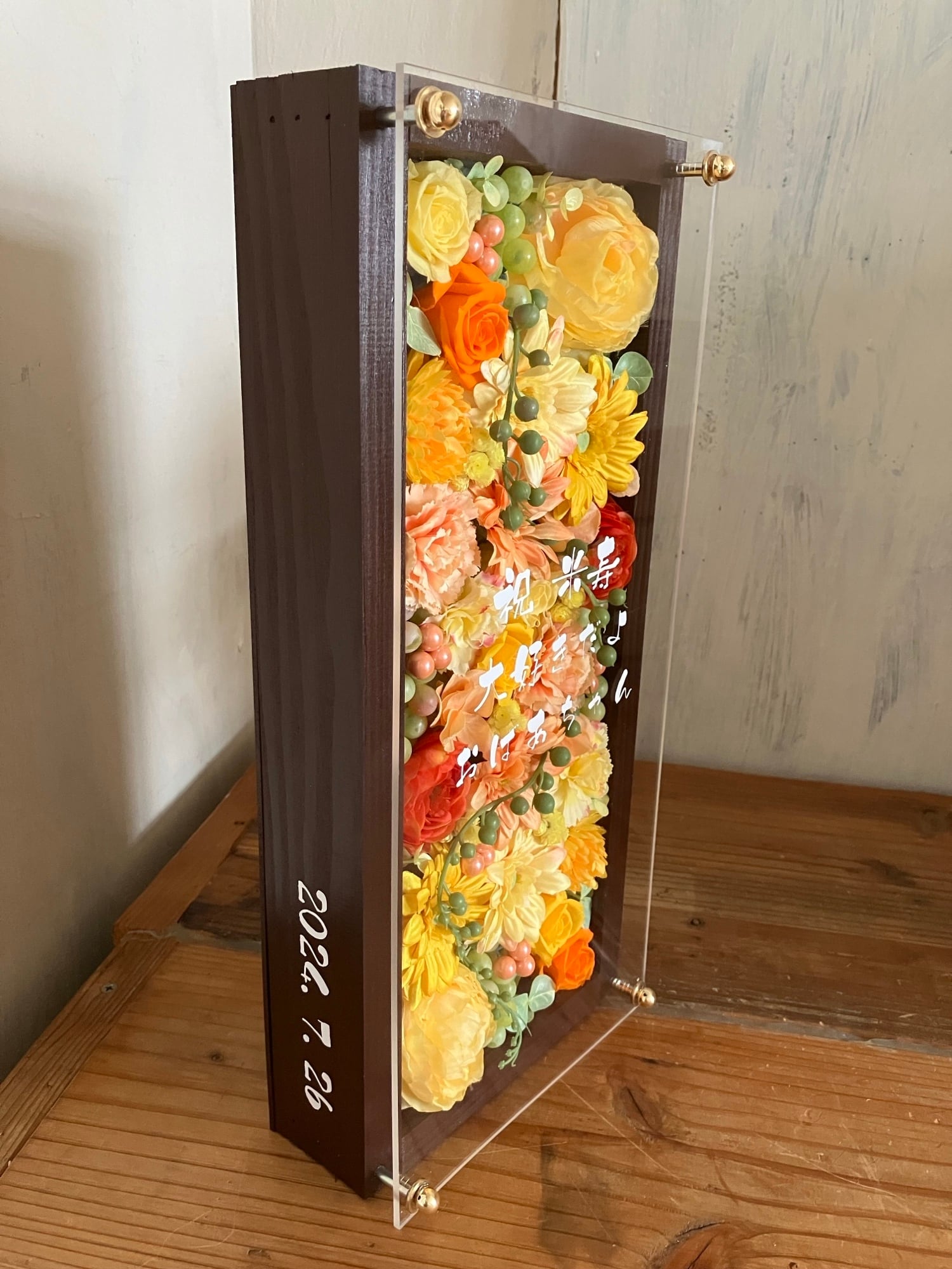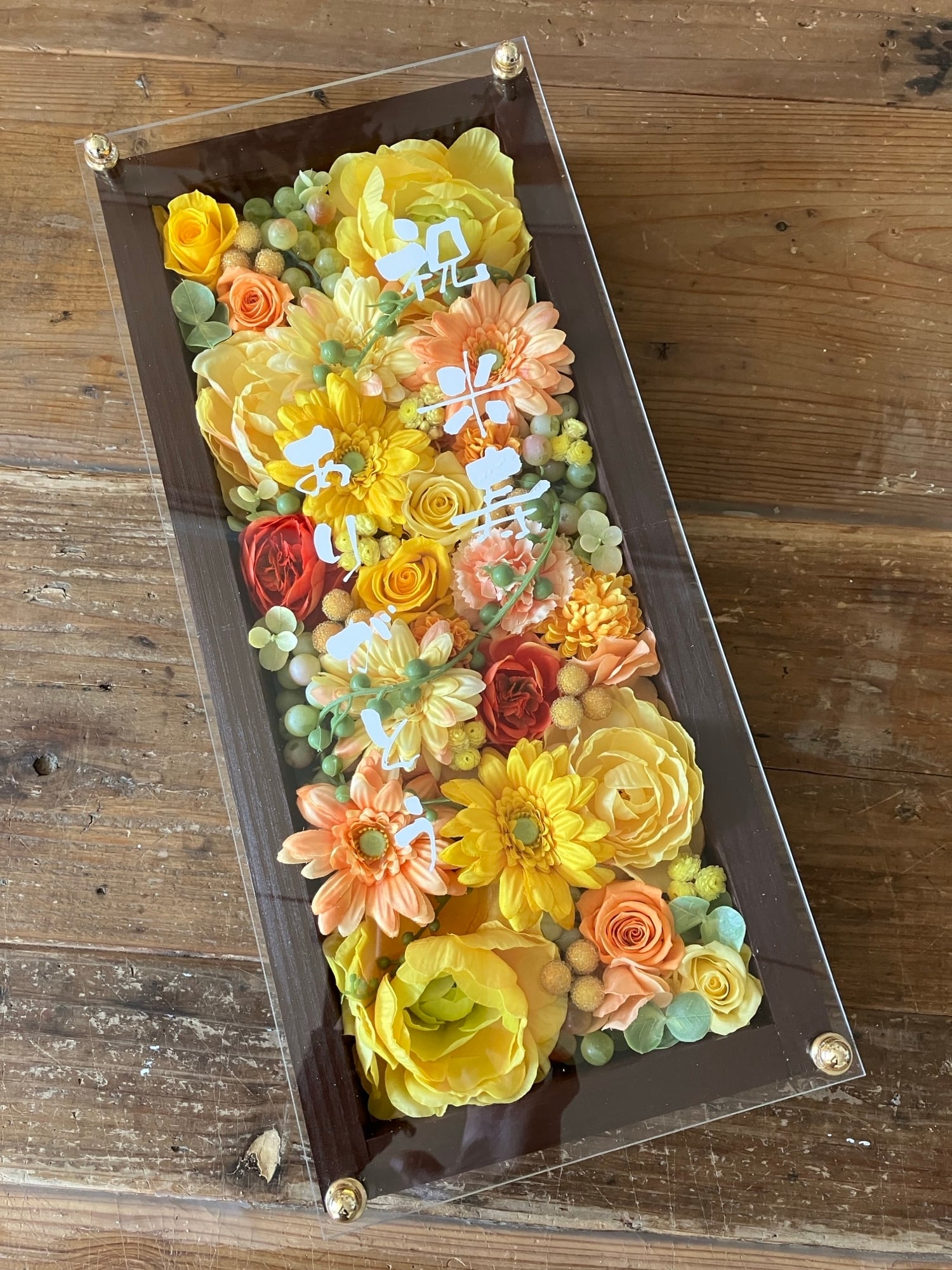 ロングサイズのウッドフレームにプリザーブドフラワーと造花をぎっしり詰め込み、アクリル板にはカッティングシートでメッセージをお入れします。