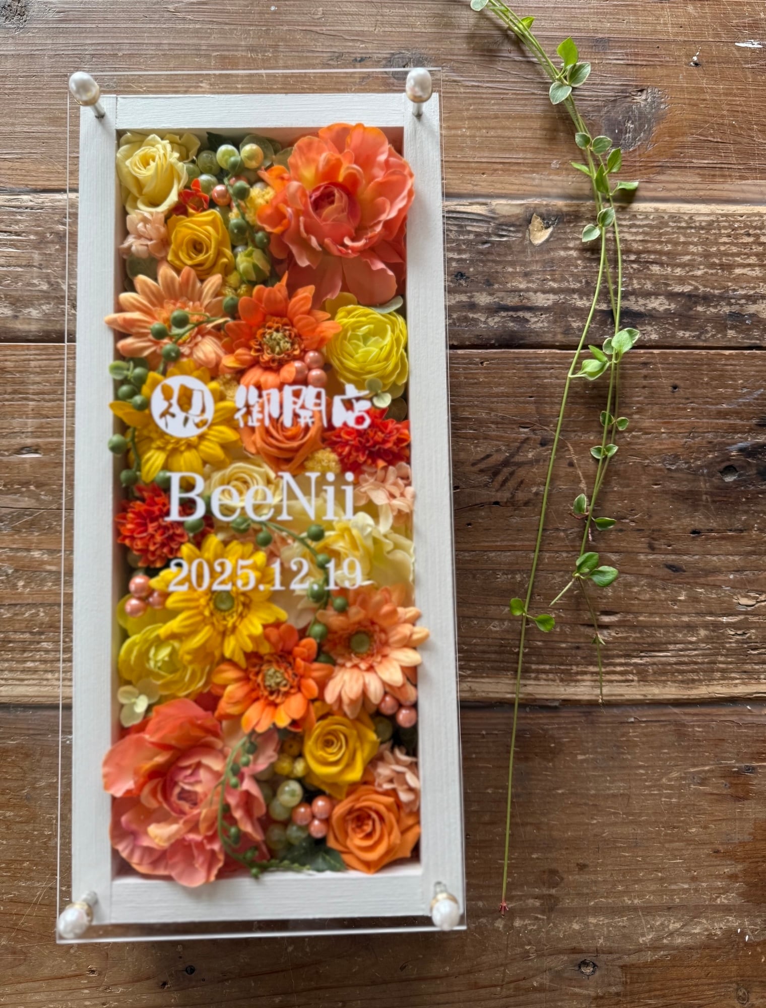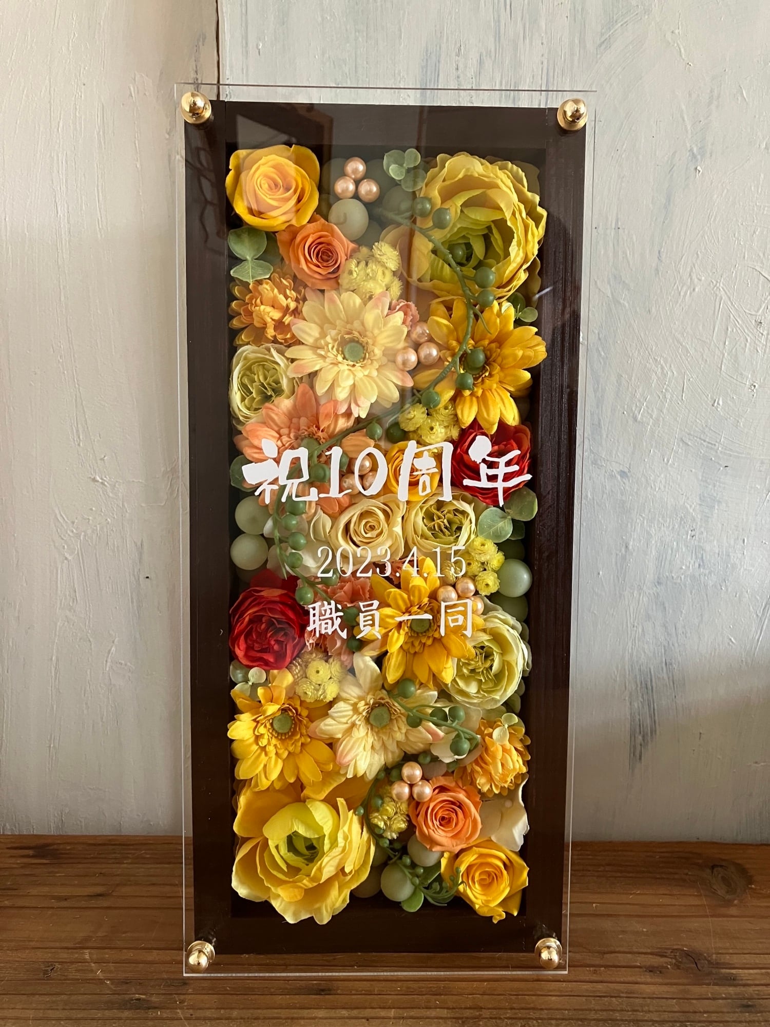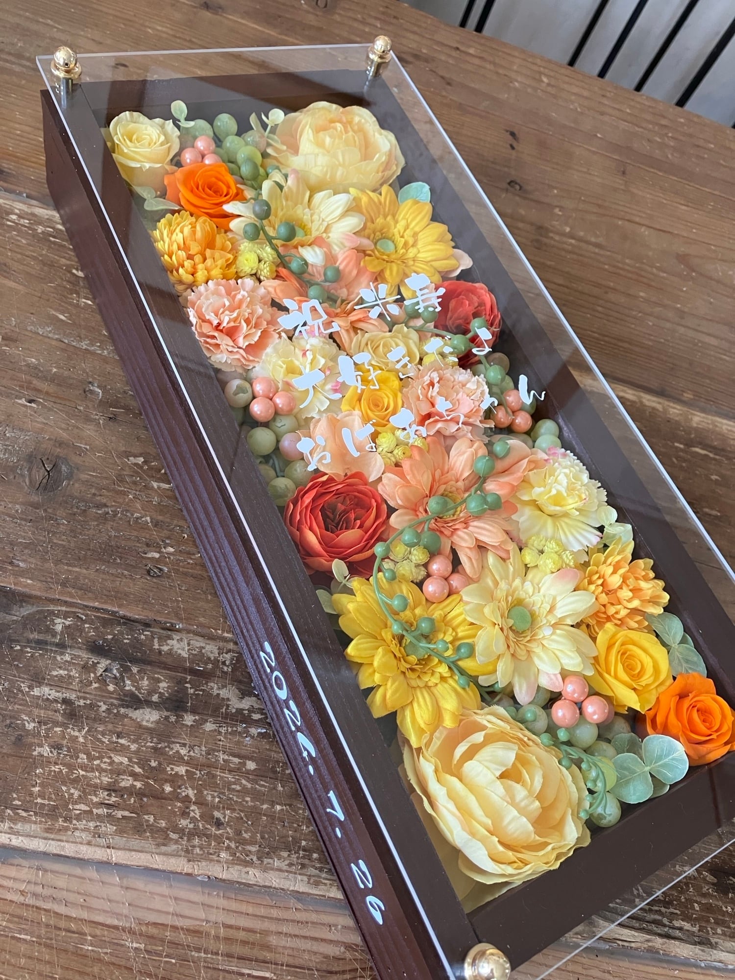 ロングサイズのウッドフレームにプリザーブドフラワーと造花をぎっしり詰め込み、アクリル板にはカッティングシートでメッセージをお入れします。