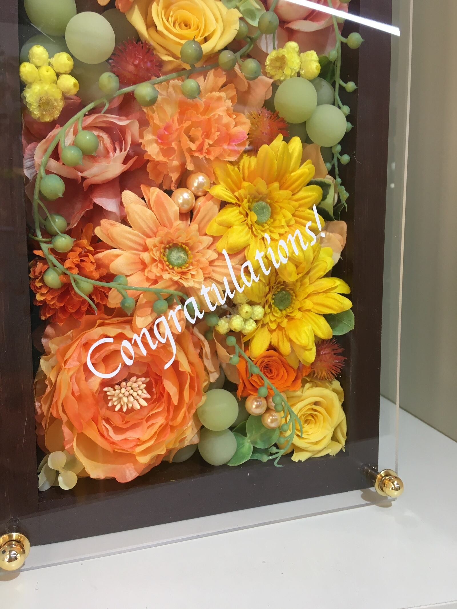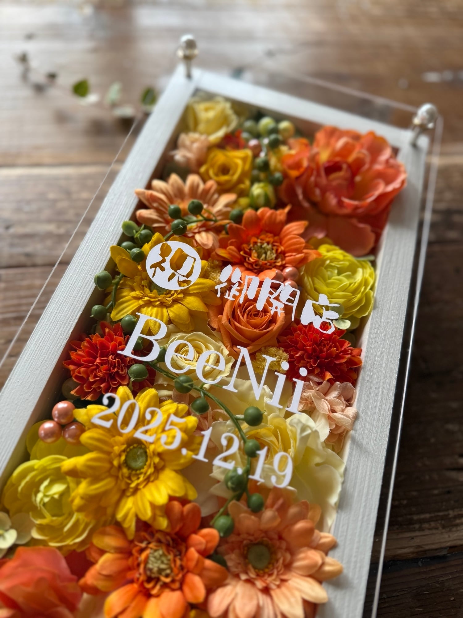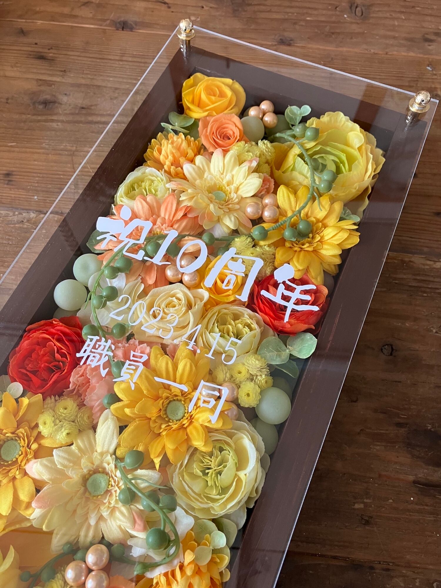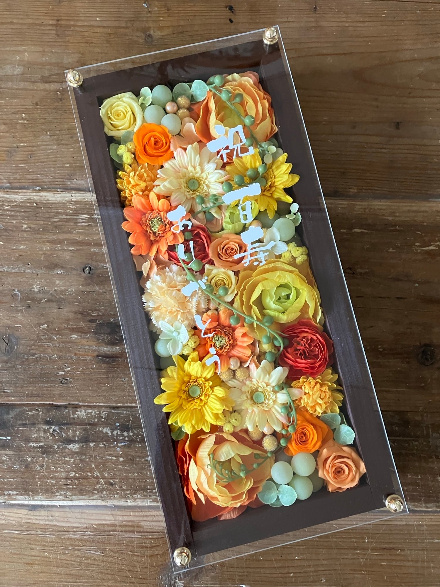 ロングサイズのウッドフレームにプリザーブドフラワーと造花をぎっしり詰め込み、アクリル板にはカッティングシートでメッセージをお入れします。