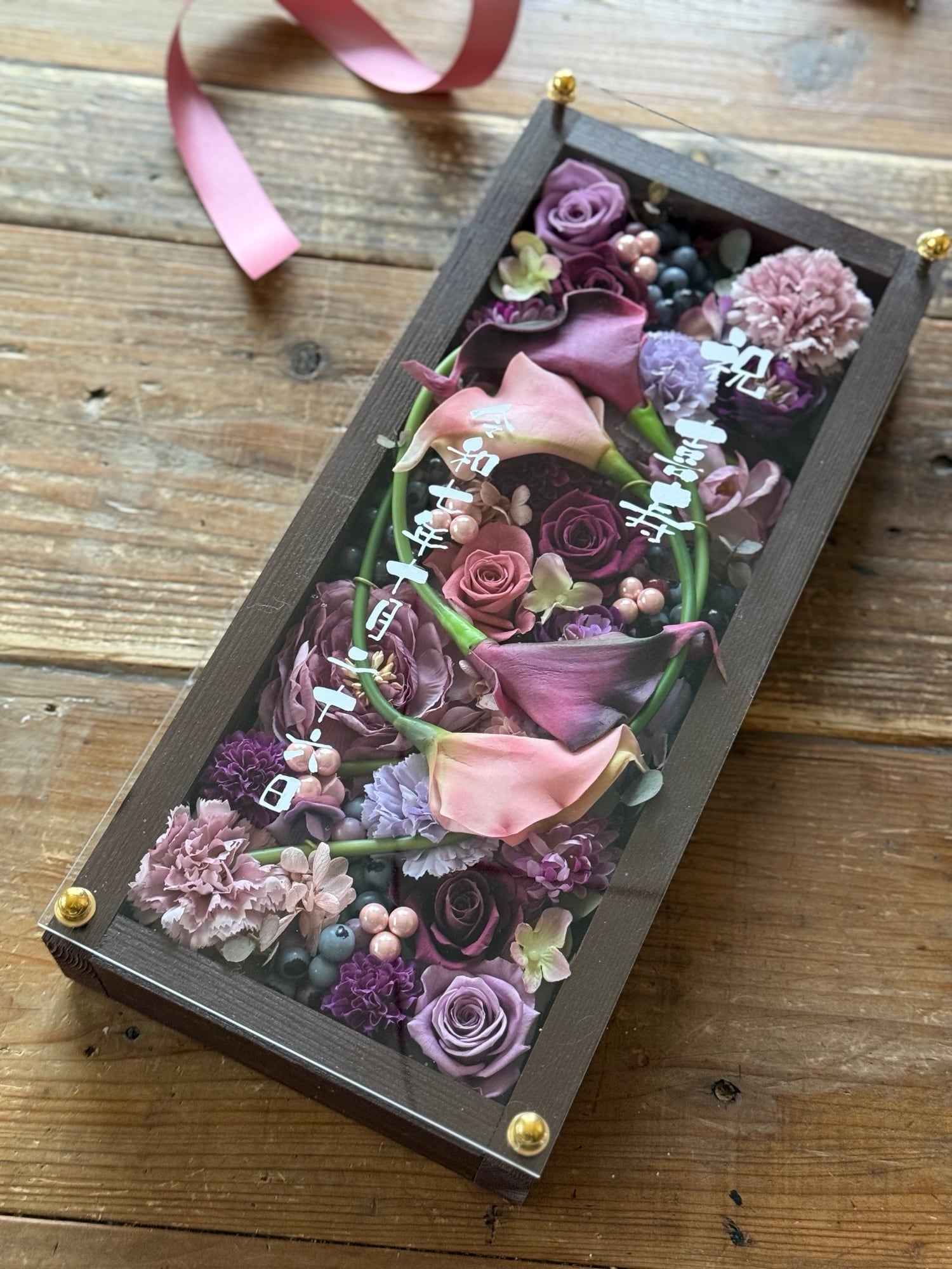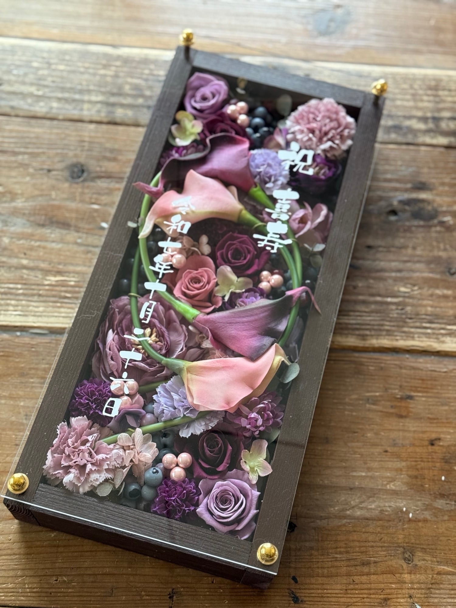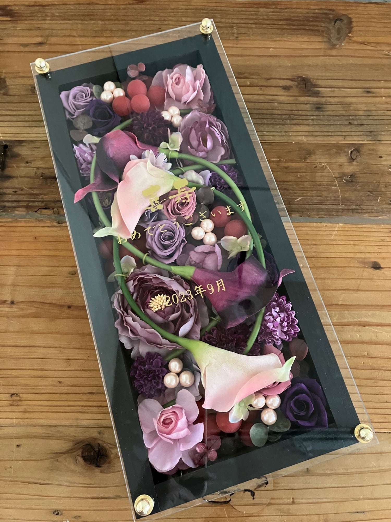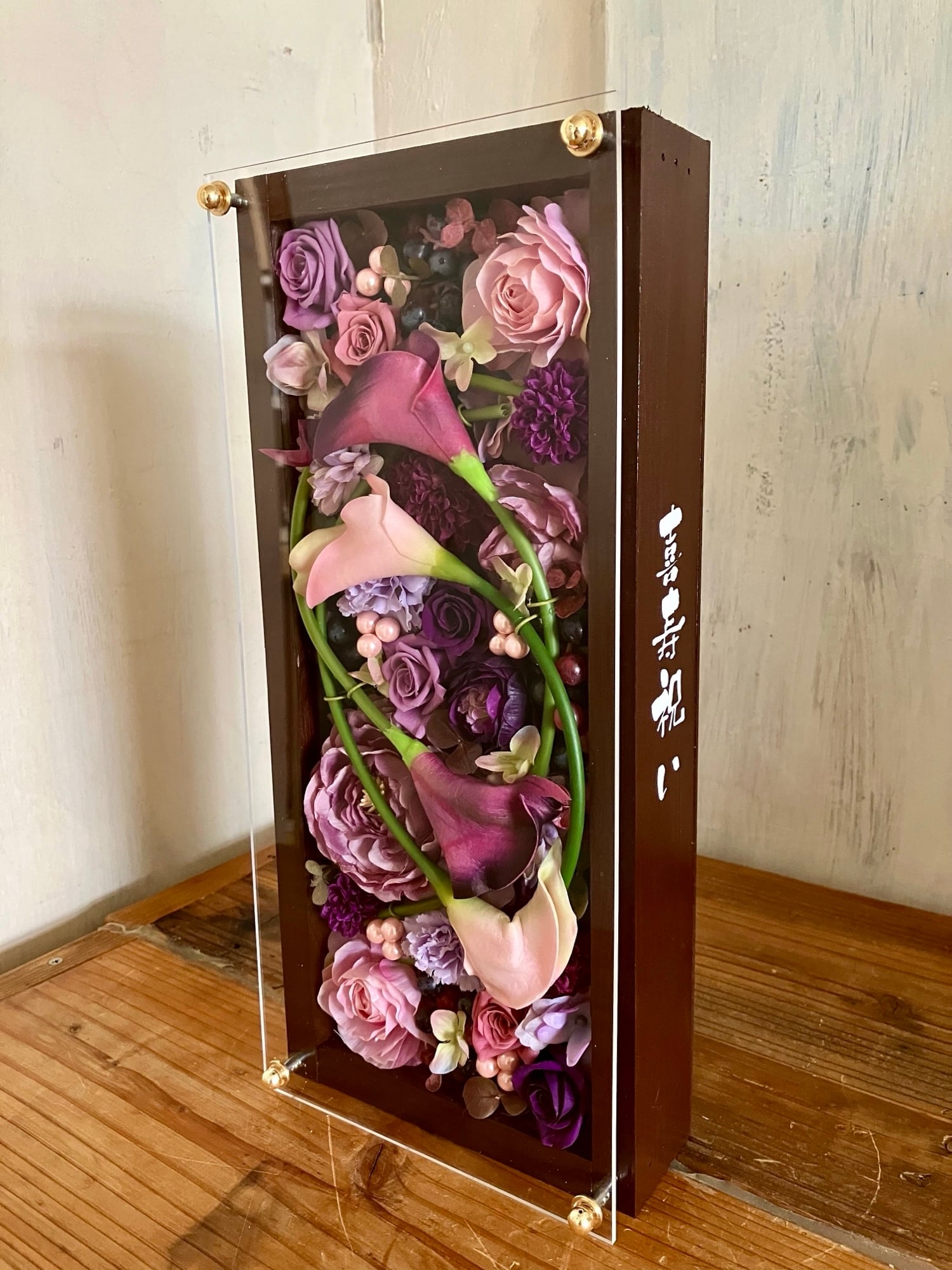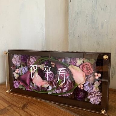 ロングサイズのウッドフレームにプリザーブドフラワーと造花をぎっしり詰め込み、アクリル板にはカッティングシートでメッセージをお入れします(木枠にも文字入れ可能)