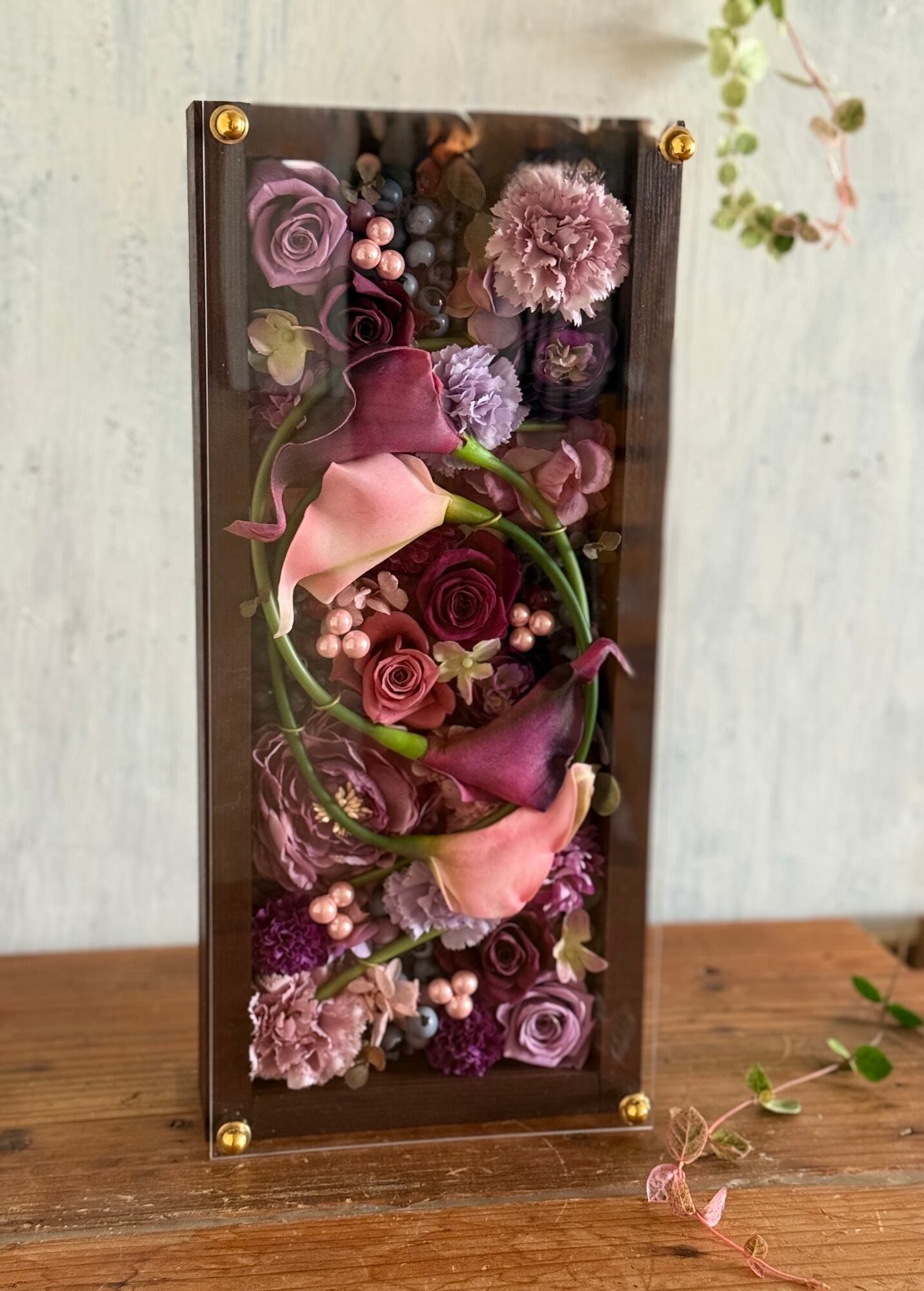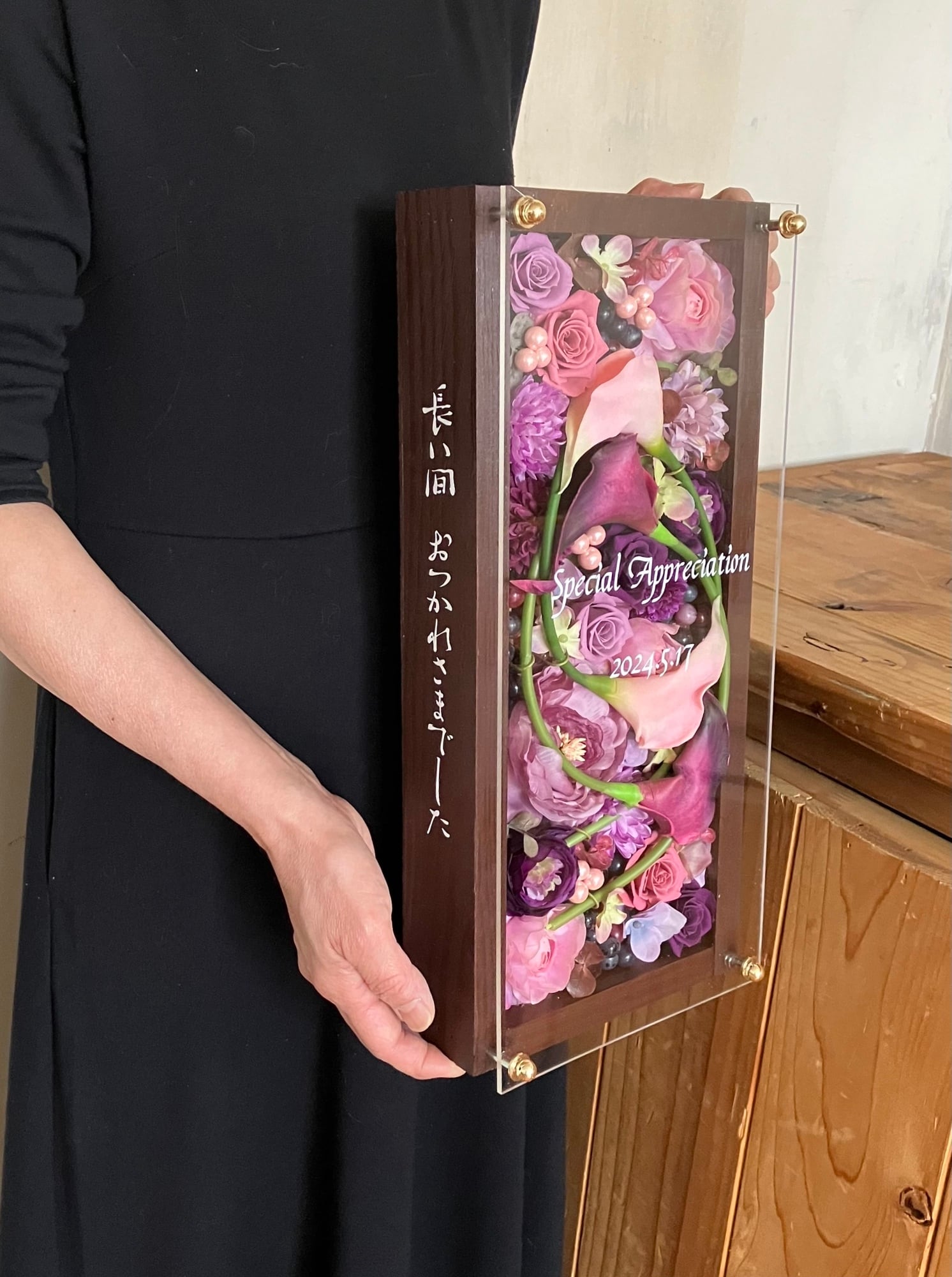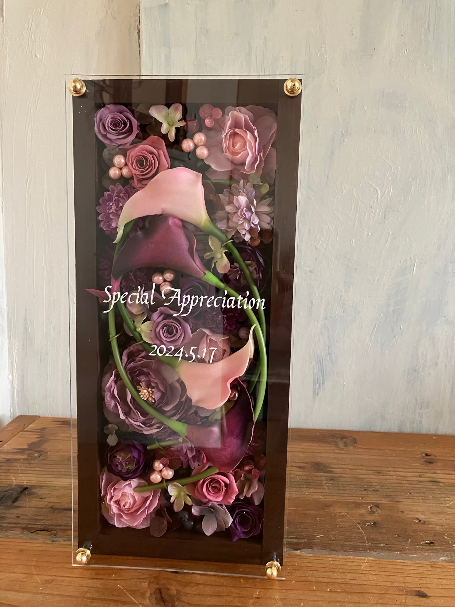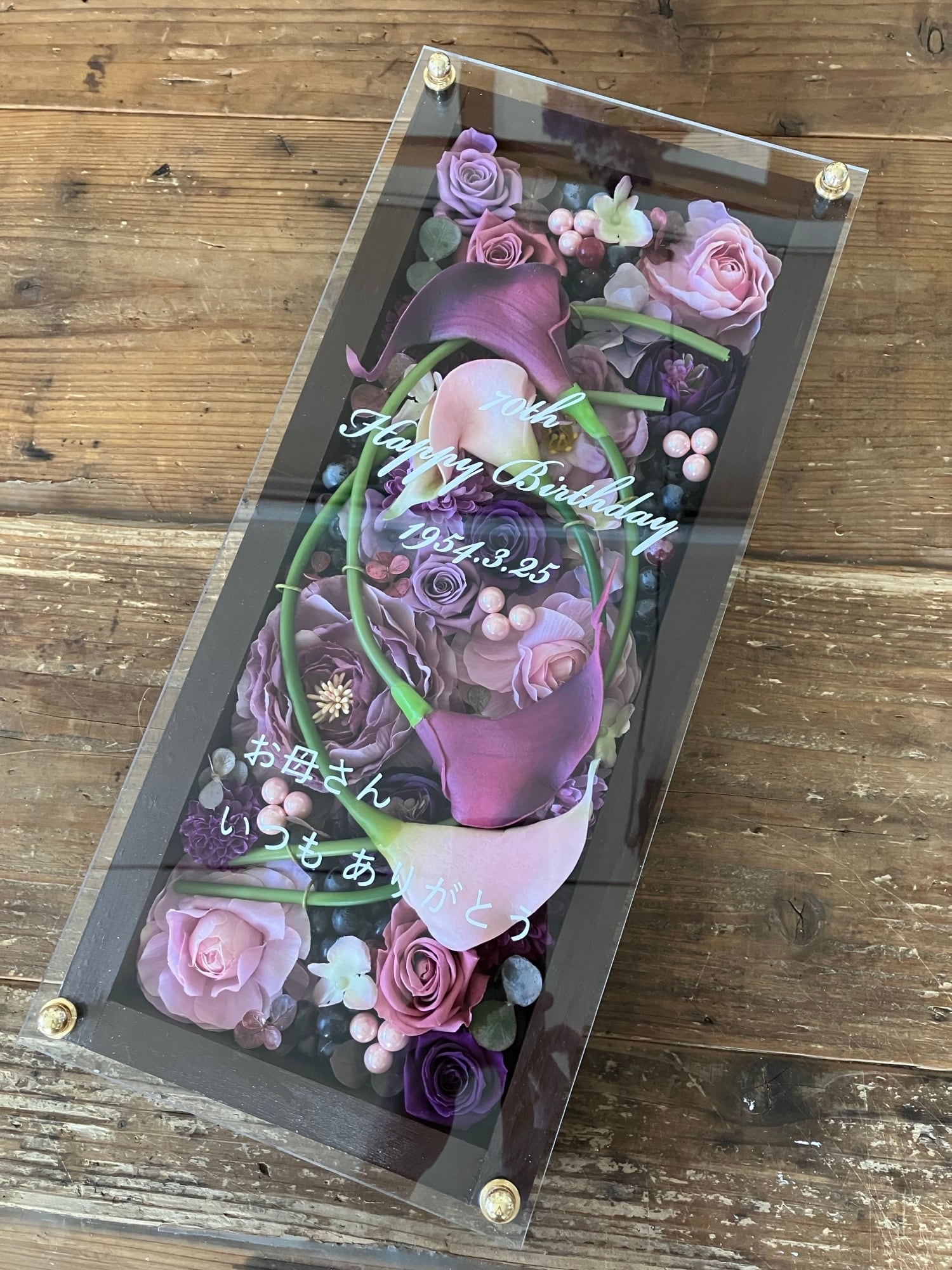 ロングサイズのウッドフレームにプリザーブドフラワーと造花をぎっしり詰め込み、アクリル板にはカッティングシートでメッセージをお入れします(木枠にも文字入れ可能)