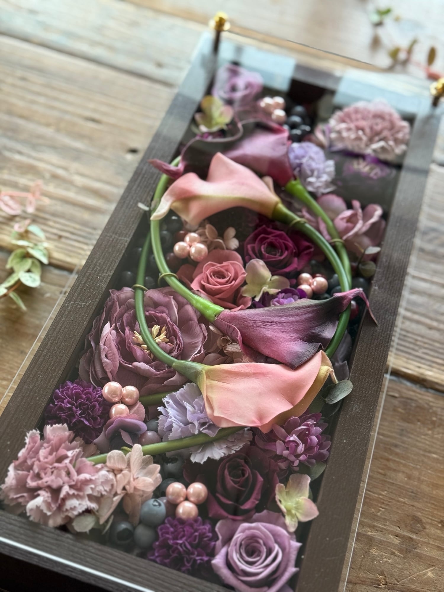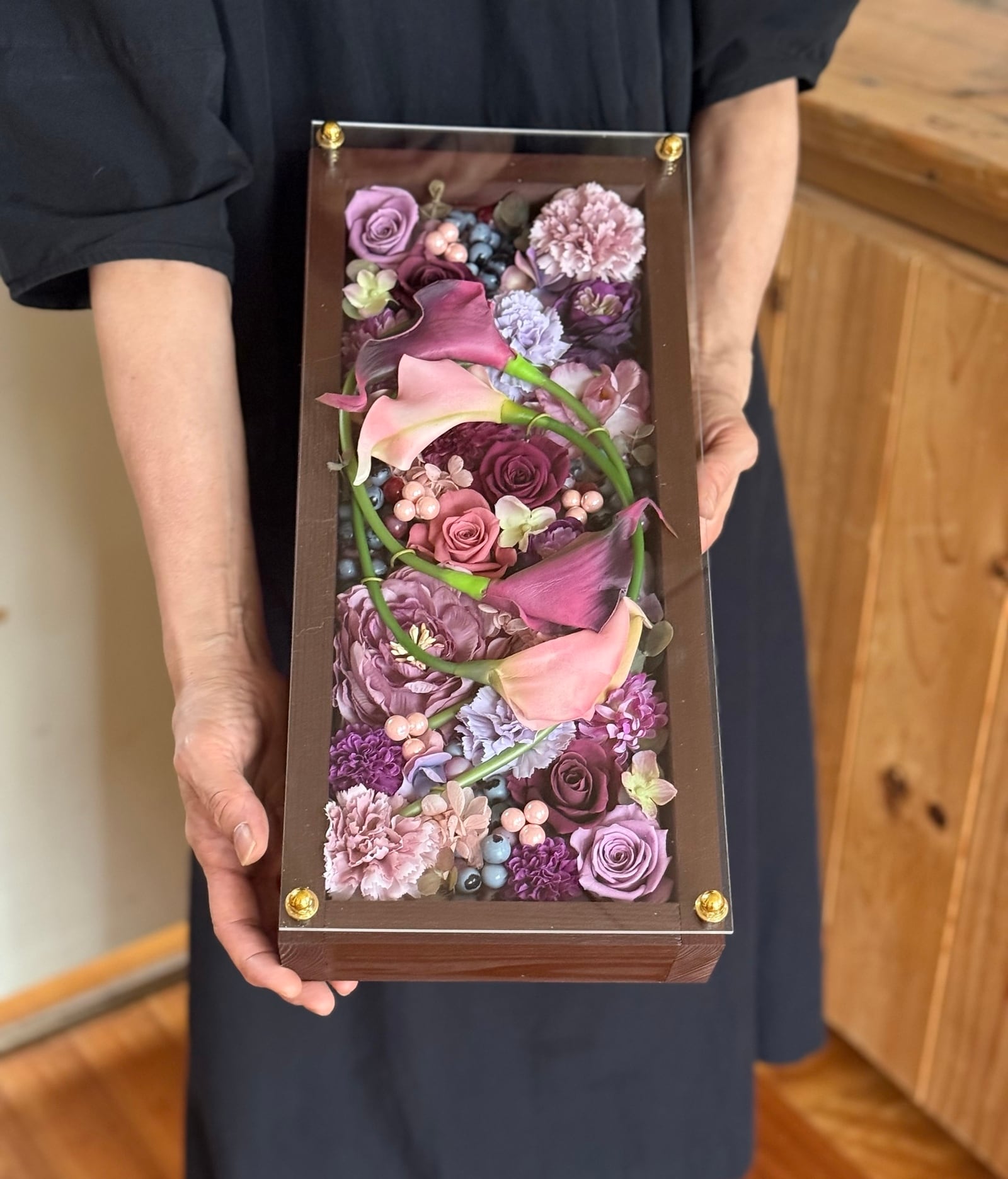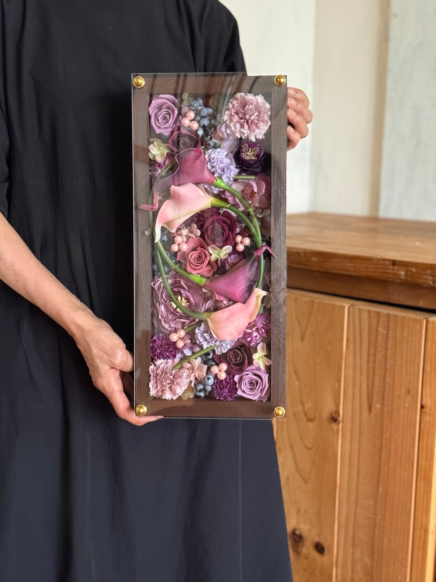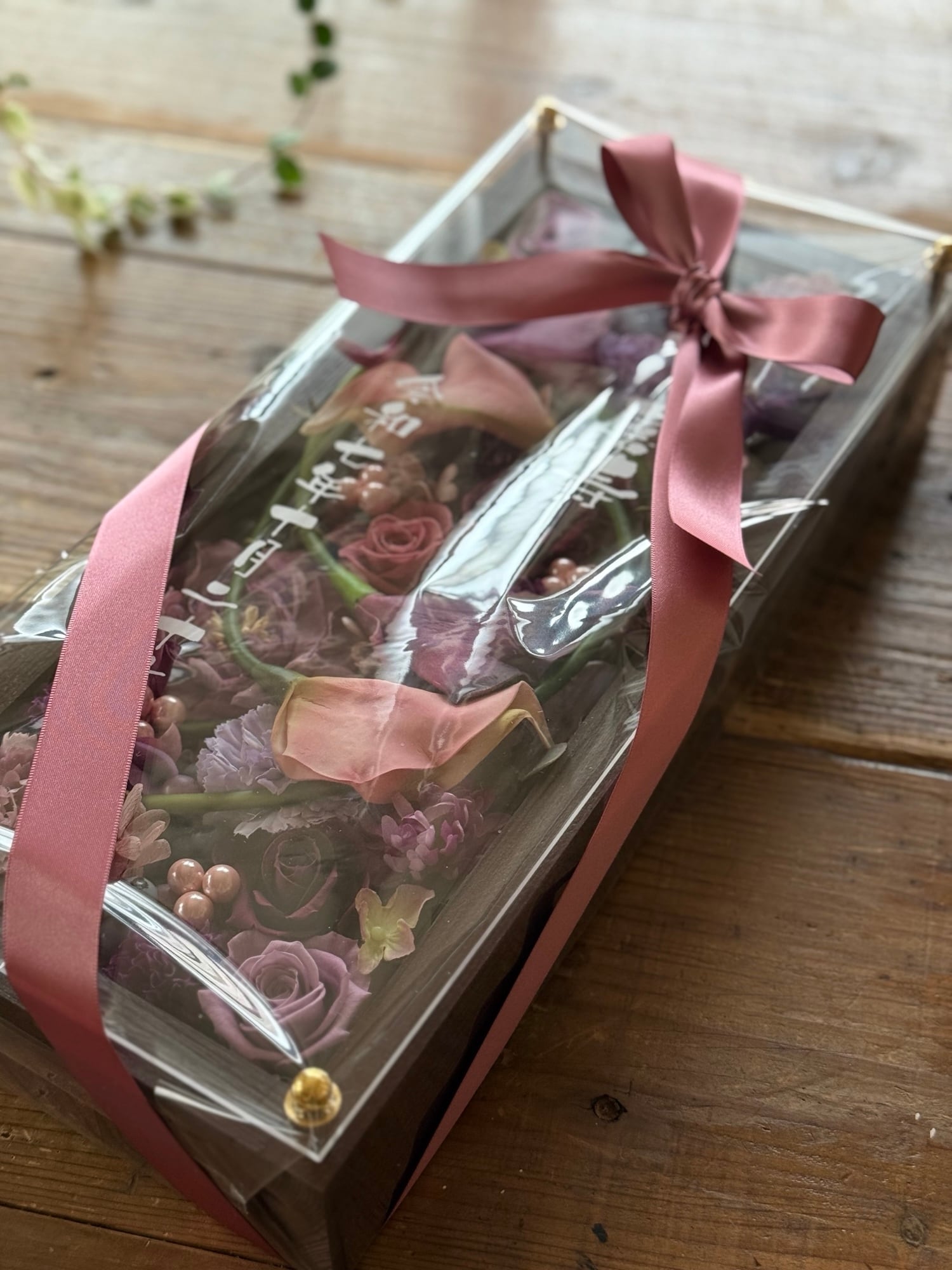 ロングサイズのウッドフレームにプリザーブドフラワーと造花をぎっしり詰め込み、アクリル板にはカッティングシートでメッセージをお入れします(木枠にも文字入れ可能)