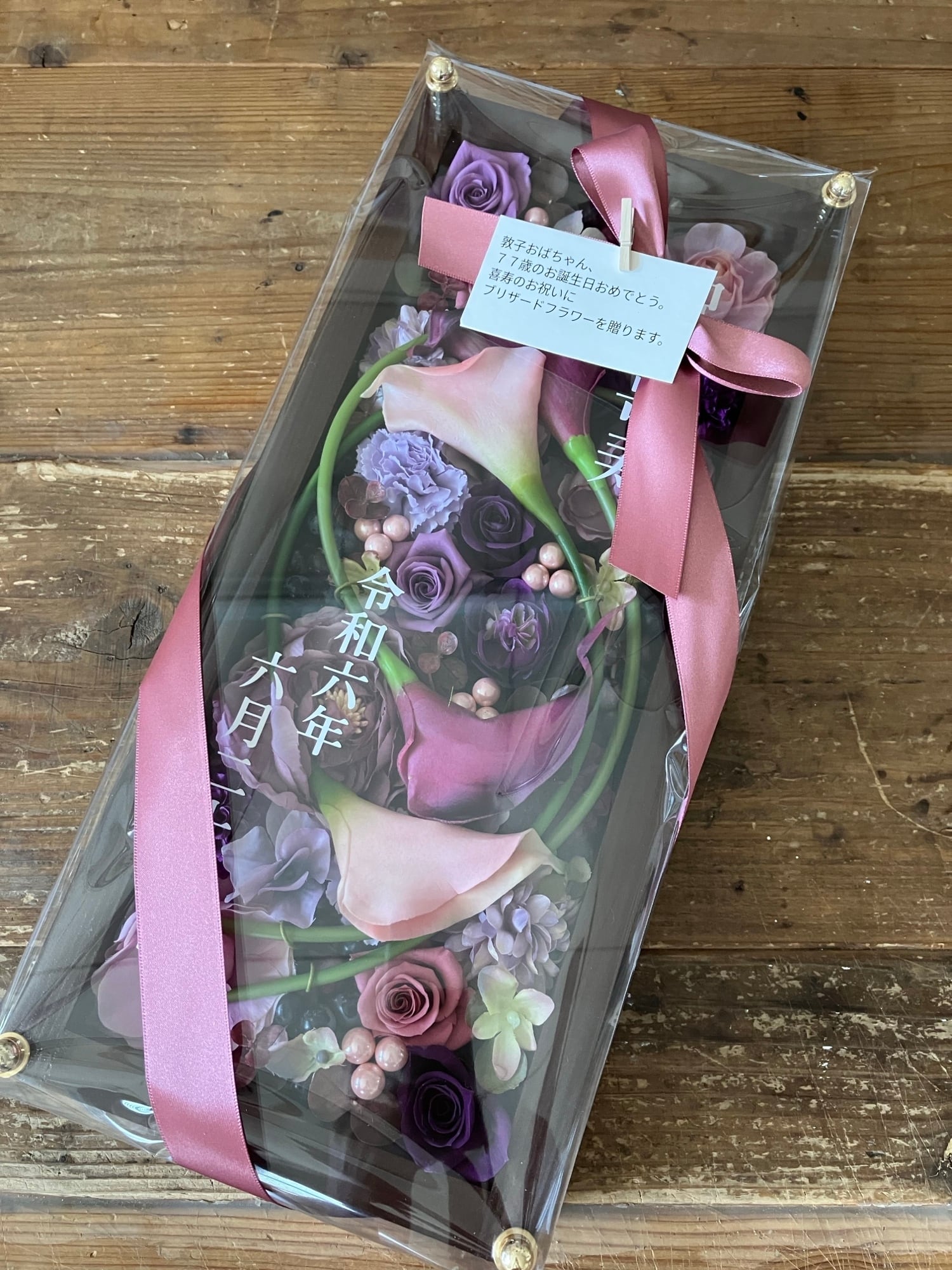 お花のギフト|プリザーブドフラワーアレンジ 木枠ロング〈パープル〉名入れ可/古希・喜寿・卒寿・退職祝いに