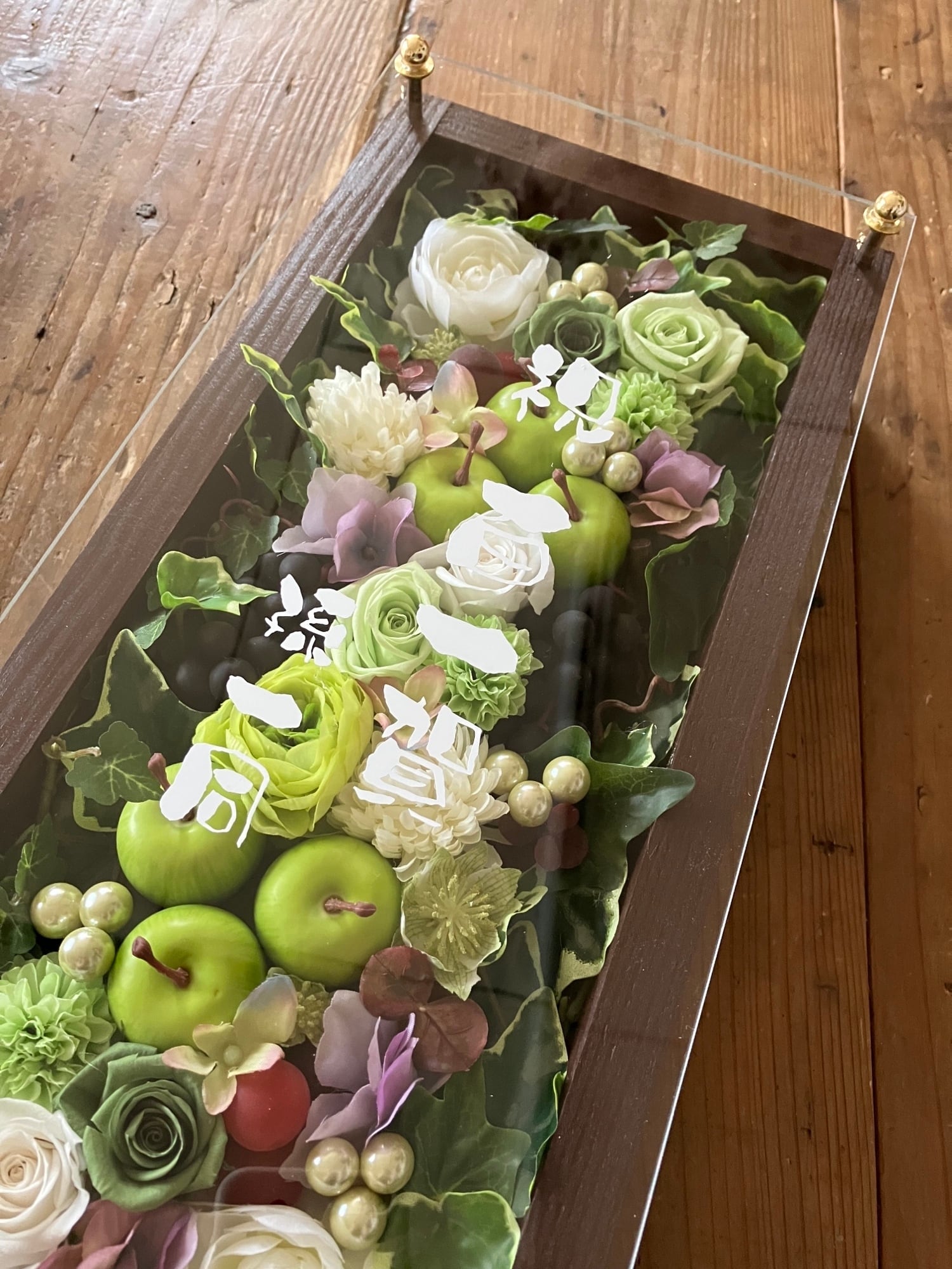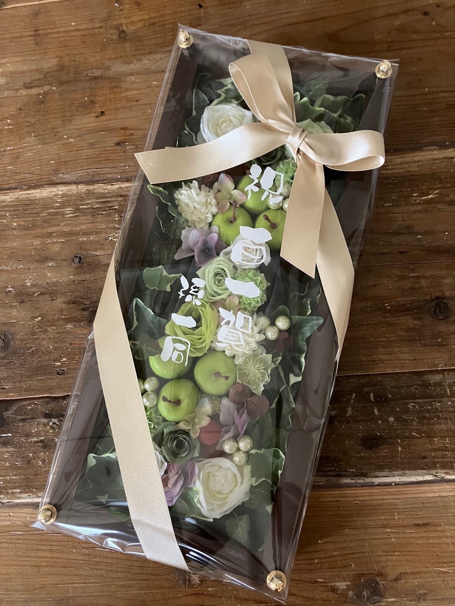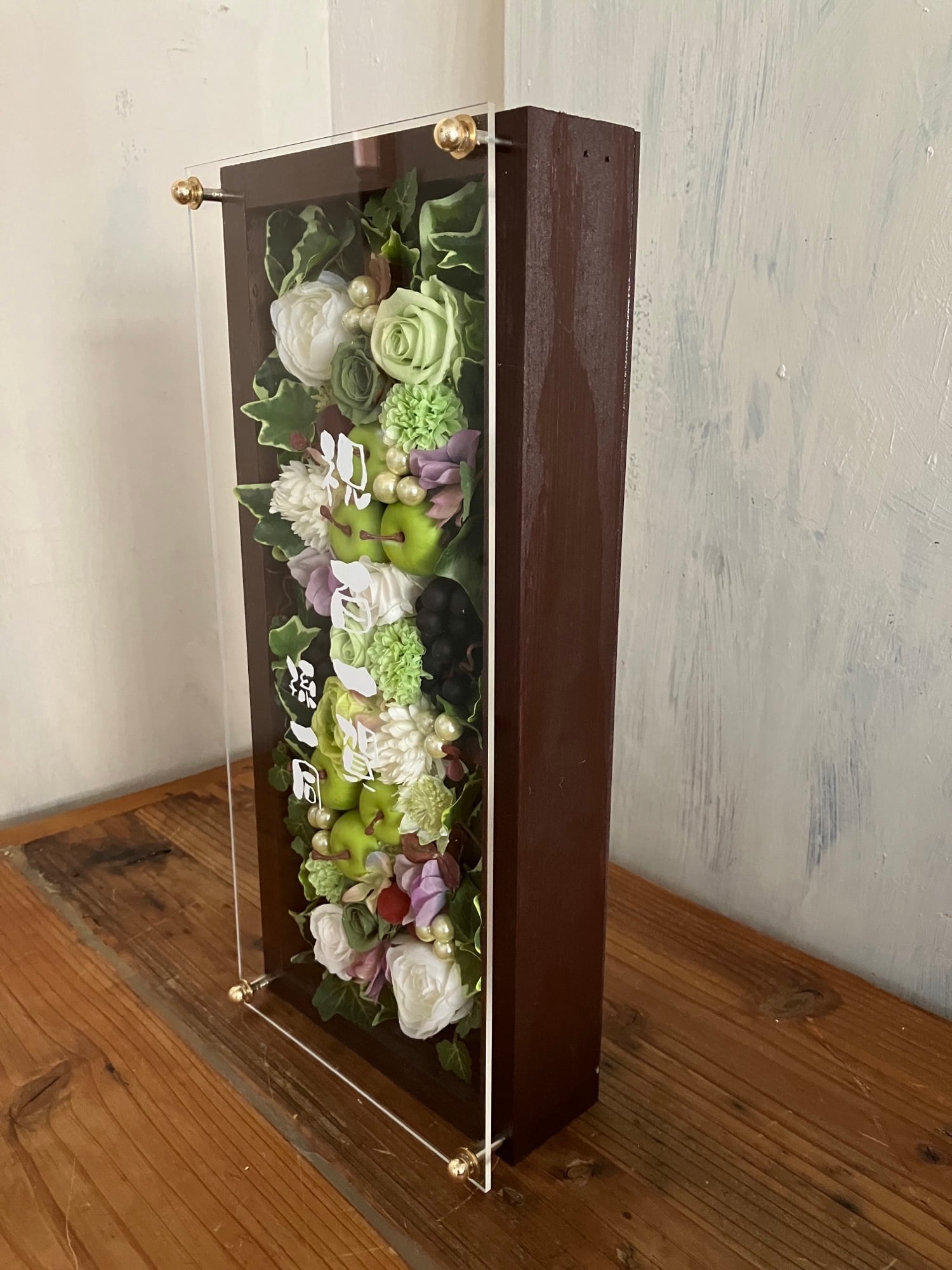 ロングサイズのウッドフレームにプリザーブドフラワーと造花をぎっしり詰め込み、アクリル板にはカッティングシートでメッセージをお入れします。
