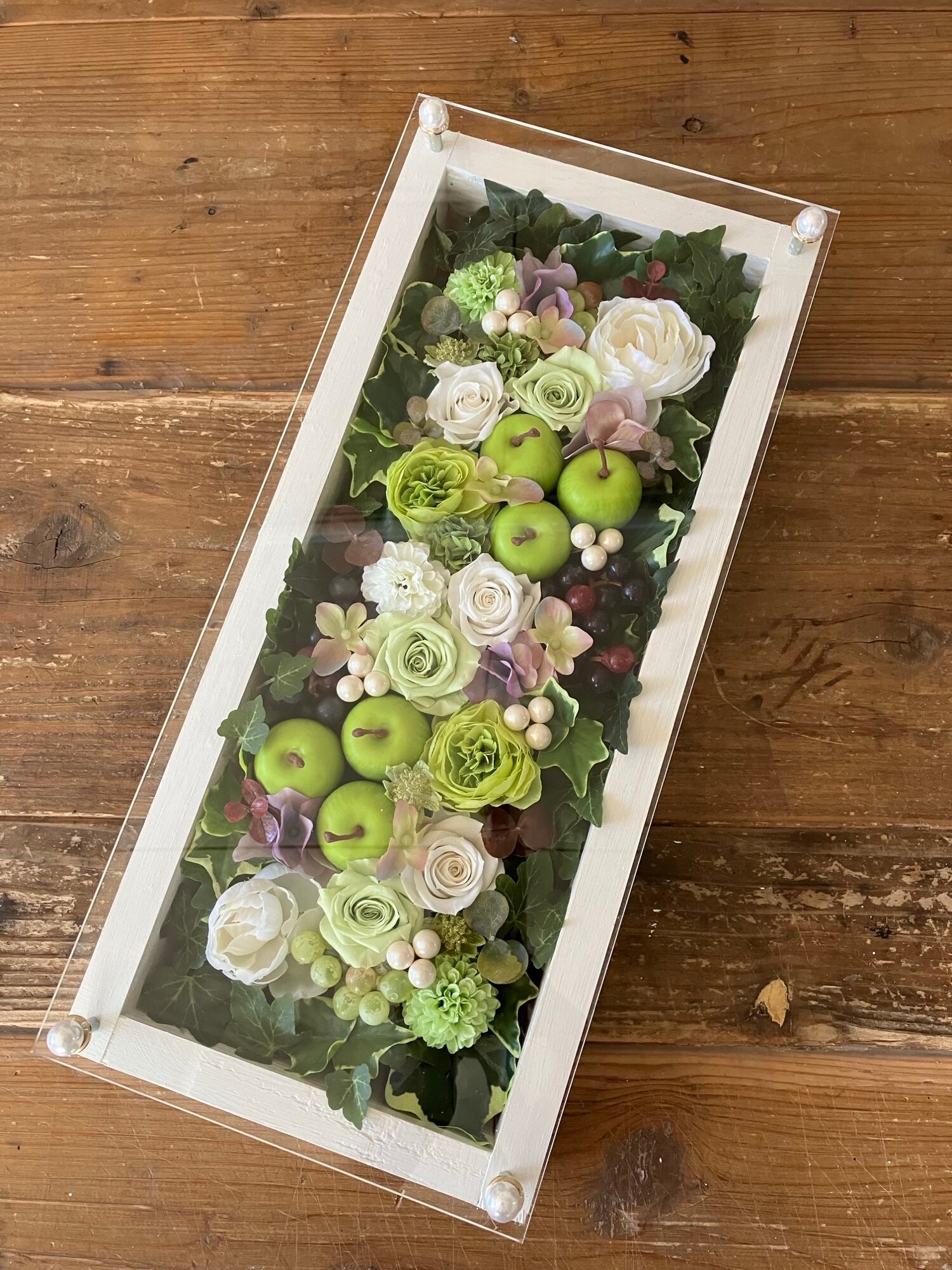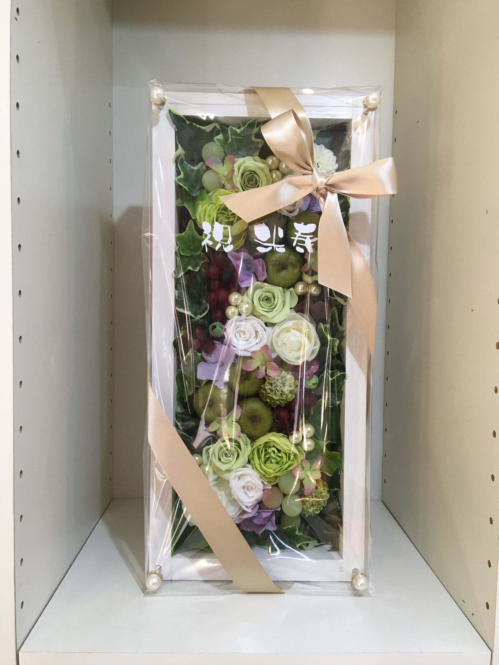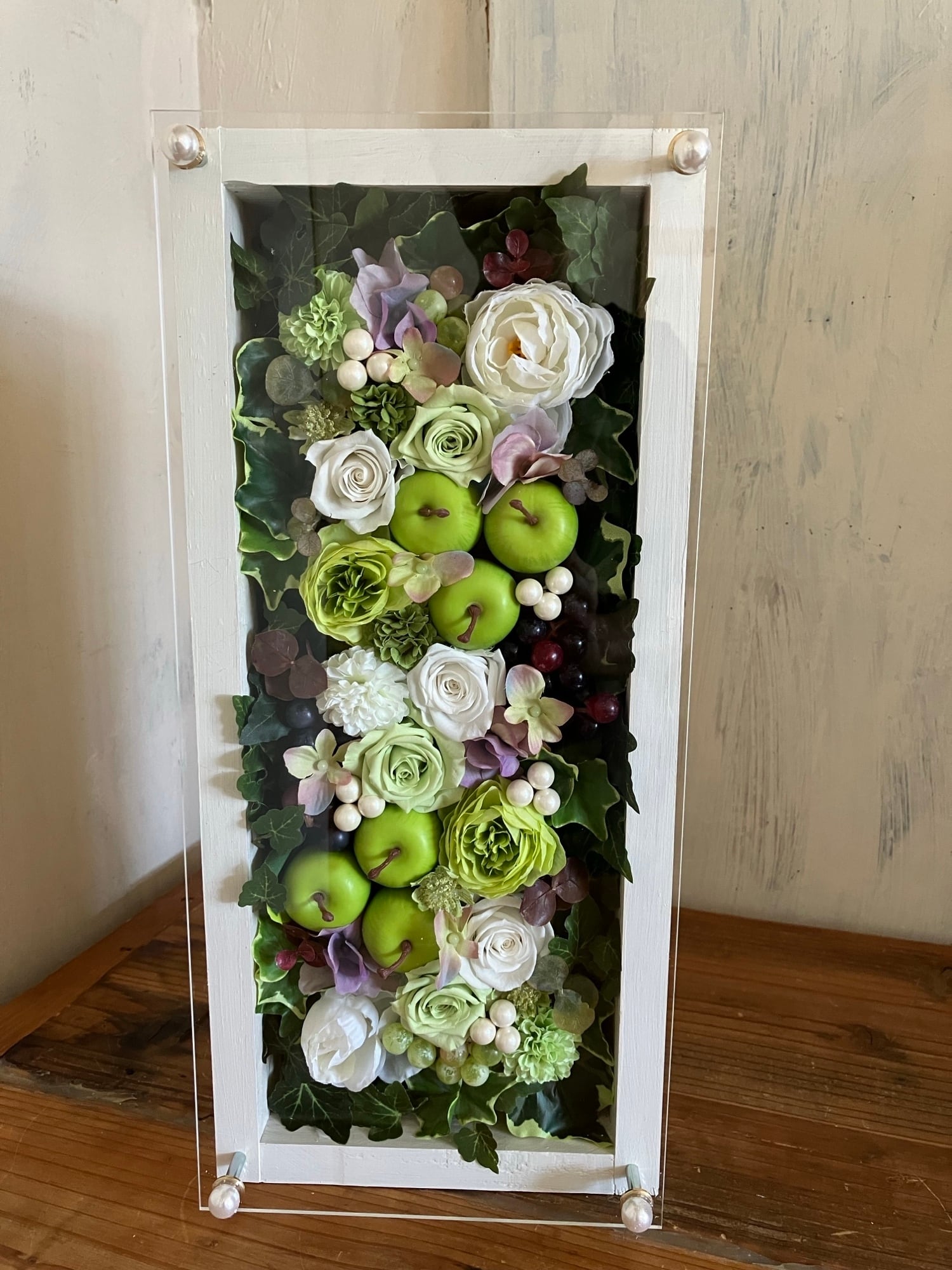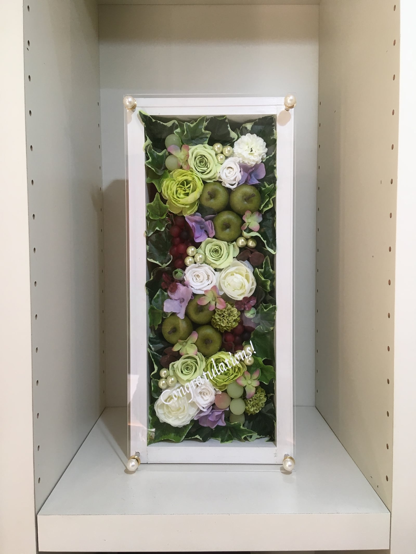 ロングサイズのウッドフレームにプリザーブドフラワーと造花をぎっしり詰め込み、アクリル板にはカッティングシートでメッセージをお入れします。
