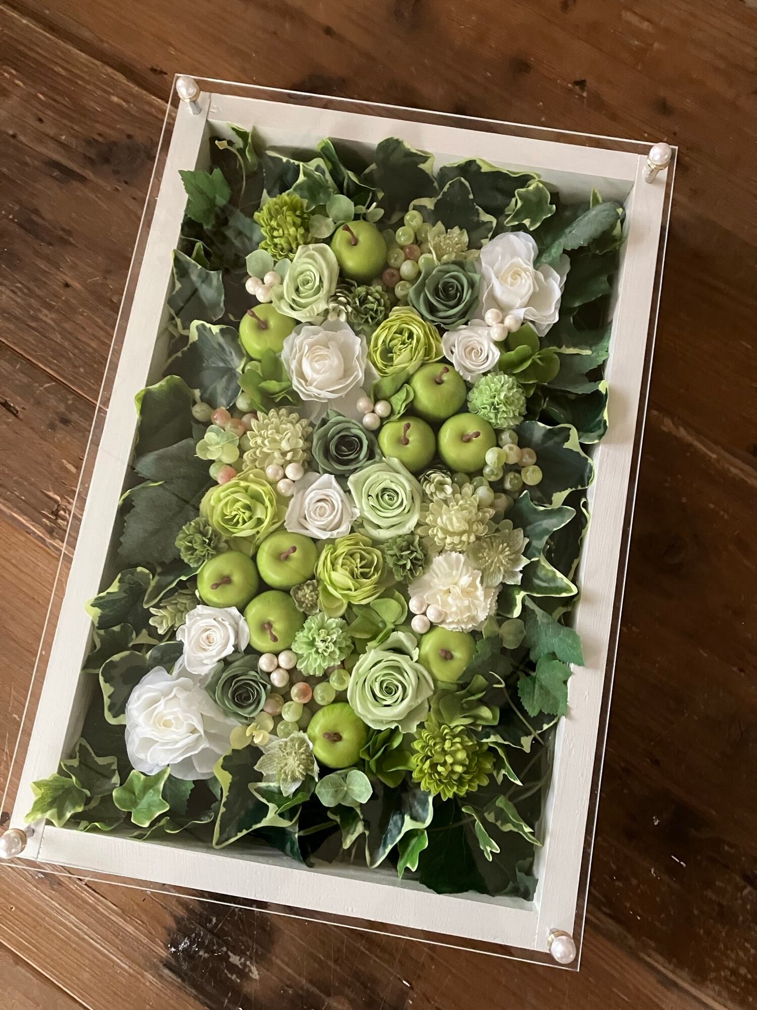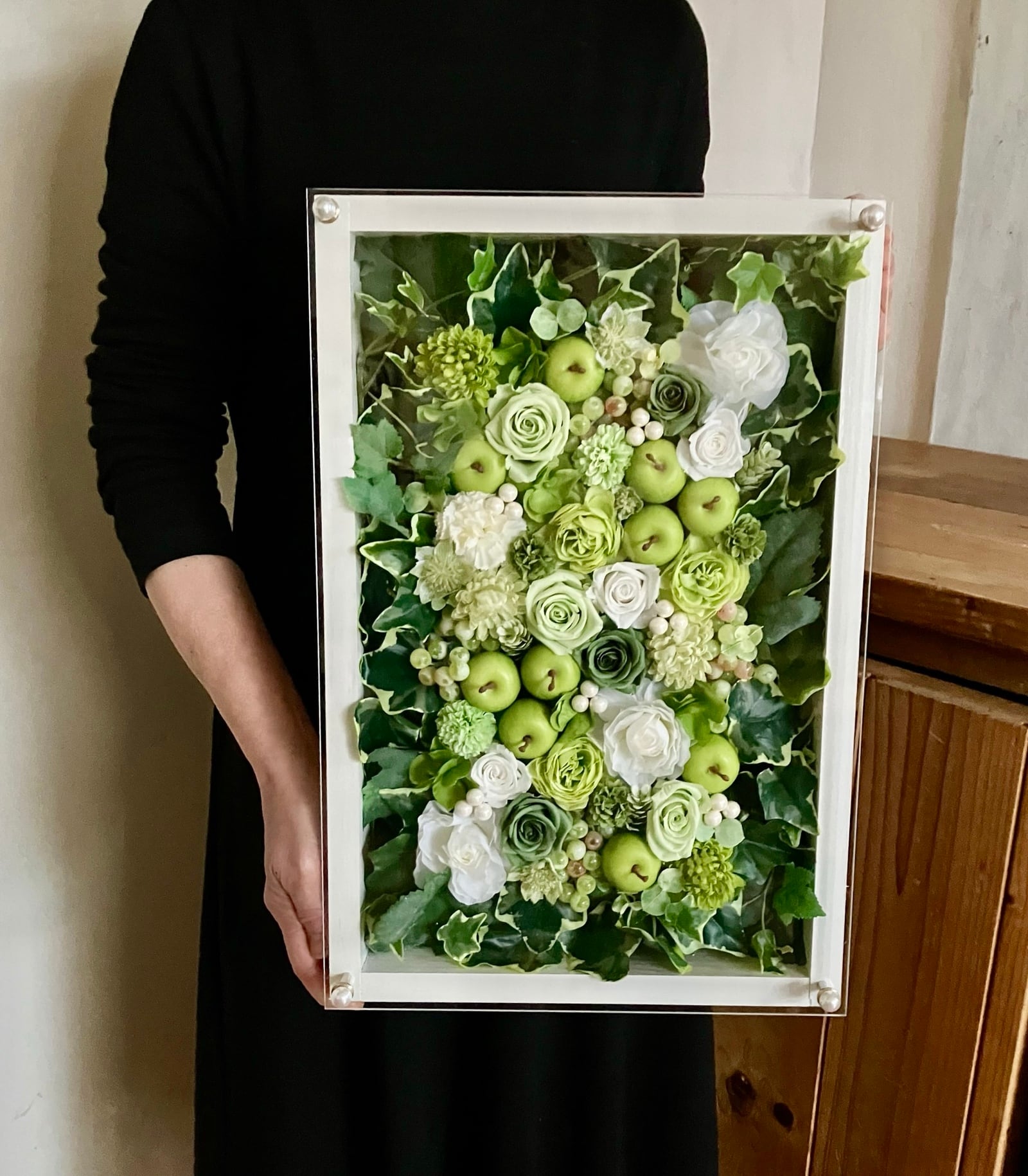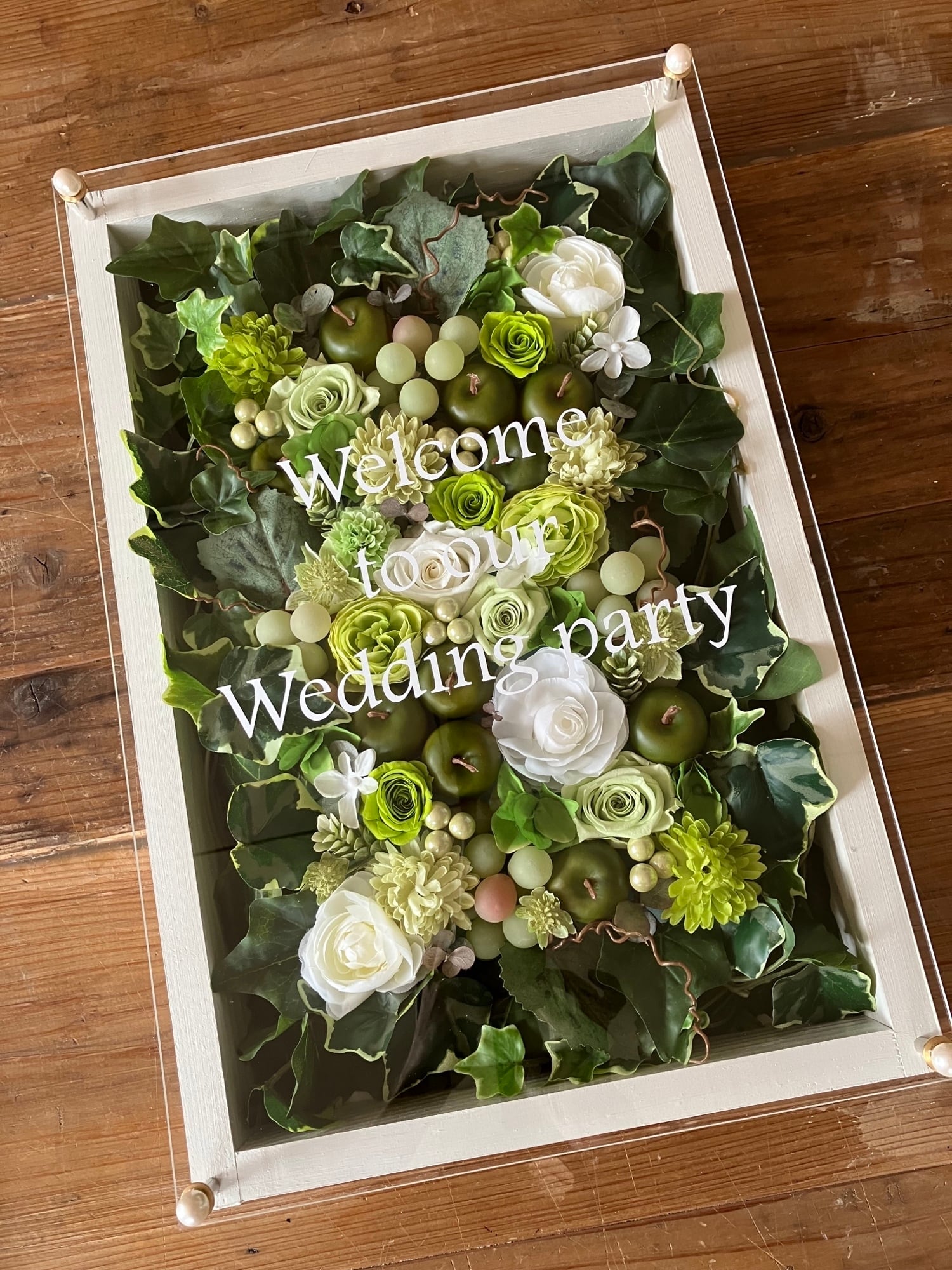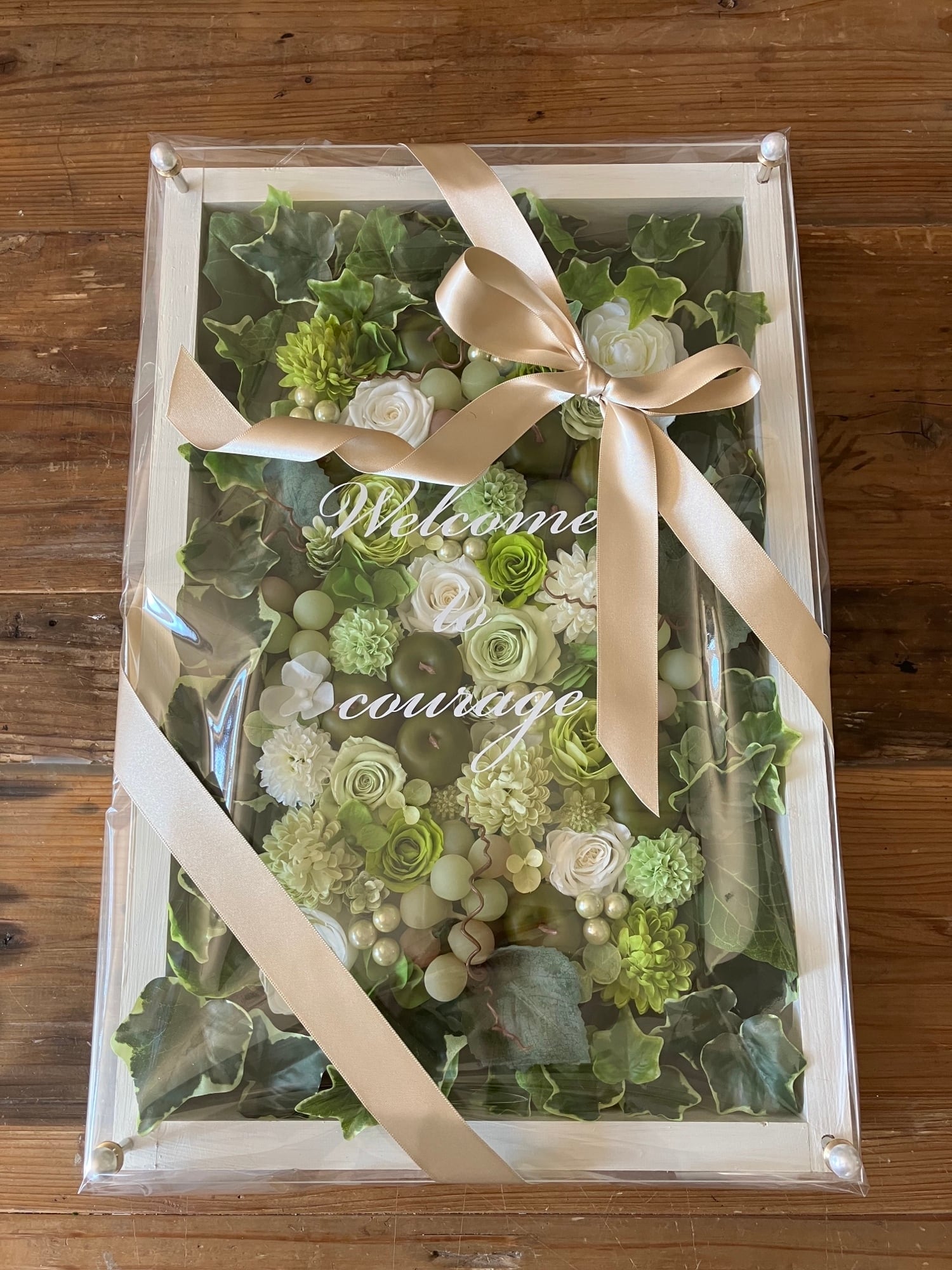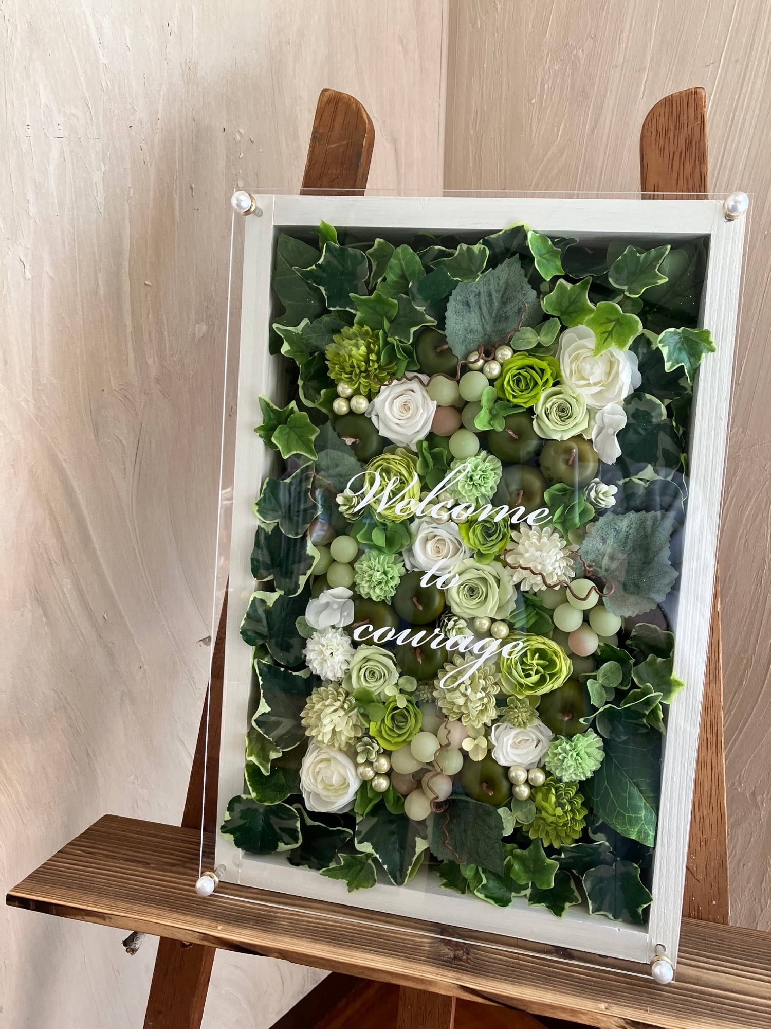 開店祝い・結婚祝い・ウェルカムボード【名入れ】プリザーブドフラワーアレンジ ウッドフレーム 大きい白木枠 アイビー〈白グリーン〉