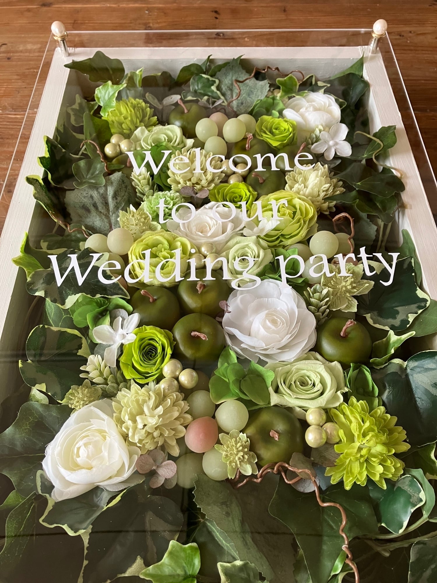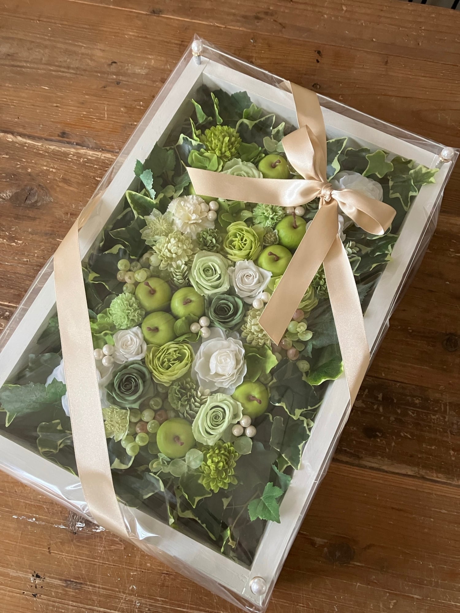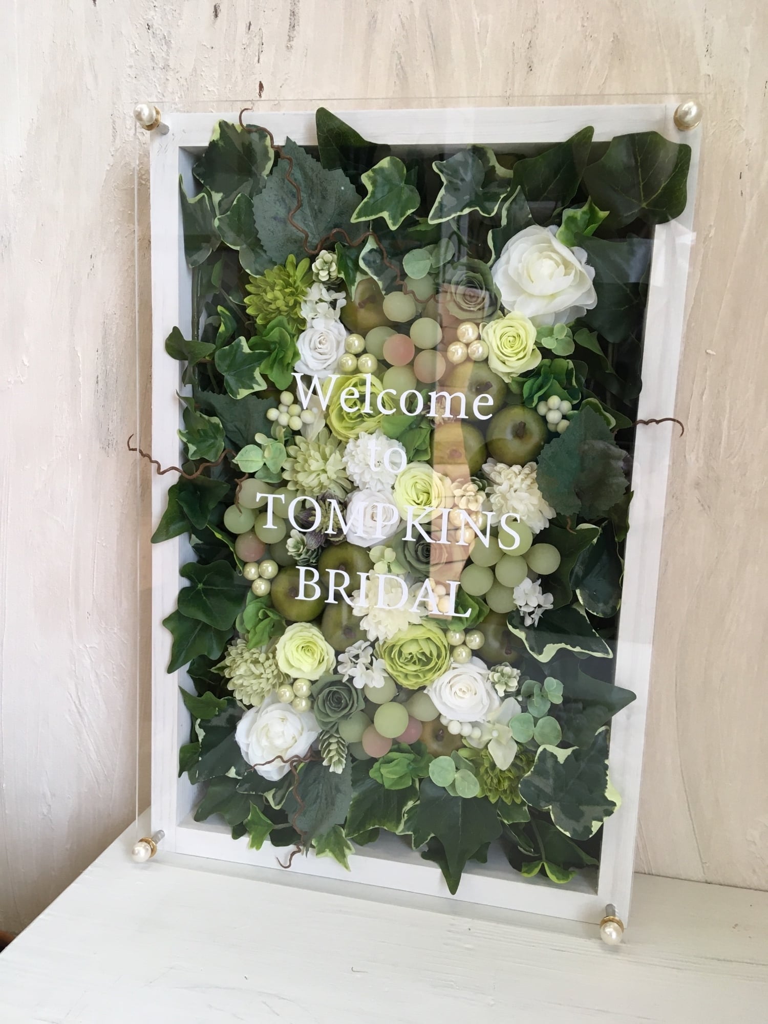 ウッドフレームにプリザーブドフラワーと造花をぎっしり詰め込み、アクリル板にはカッティングシートでメッセージをお入れします。
