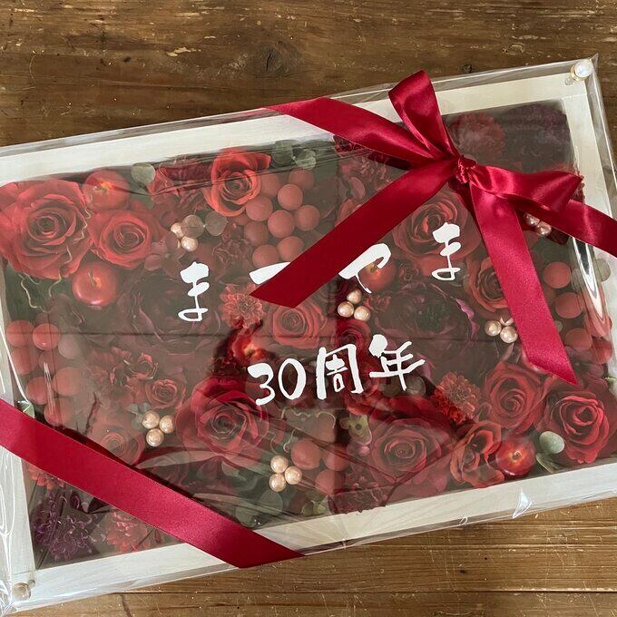 記念品 退職祝い ウェルカムボード 結婚祝い プリザーブドフラワーアレンジ お花いっぱい 白木枠〈赤バラ〉文字入れ